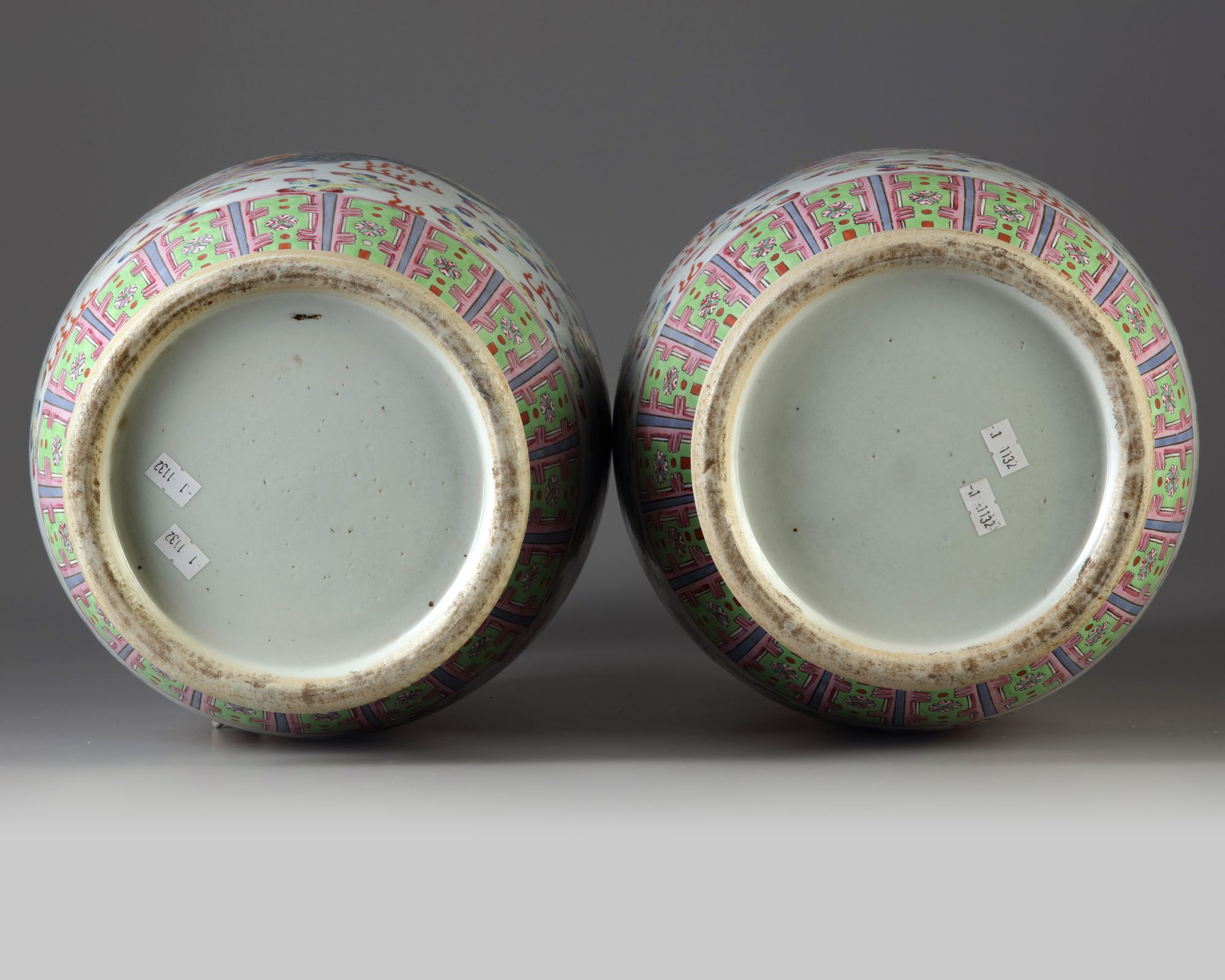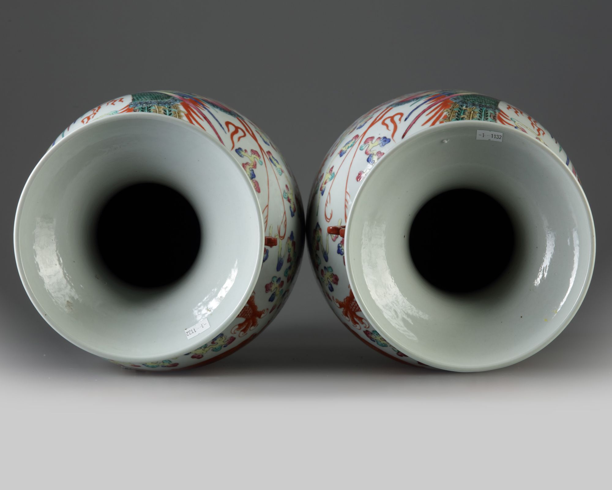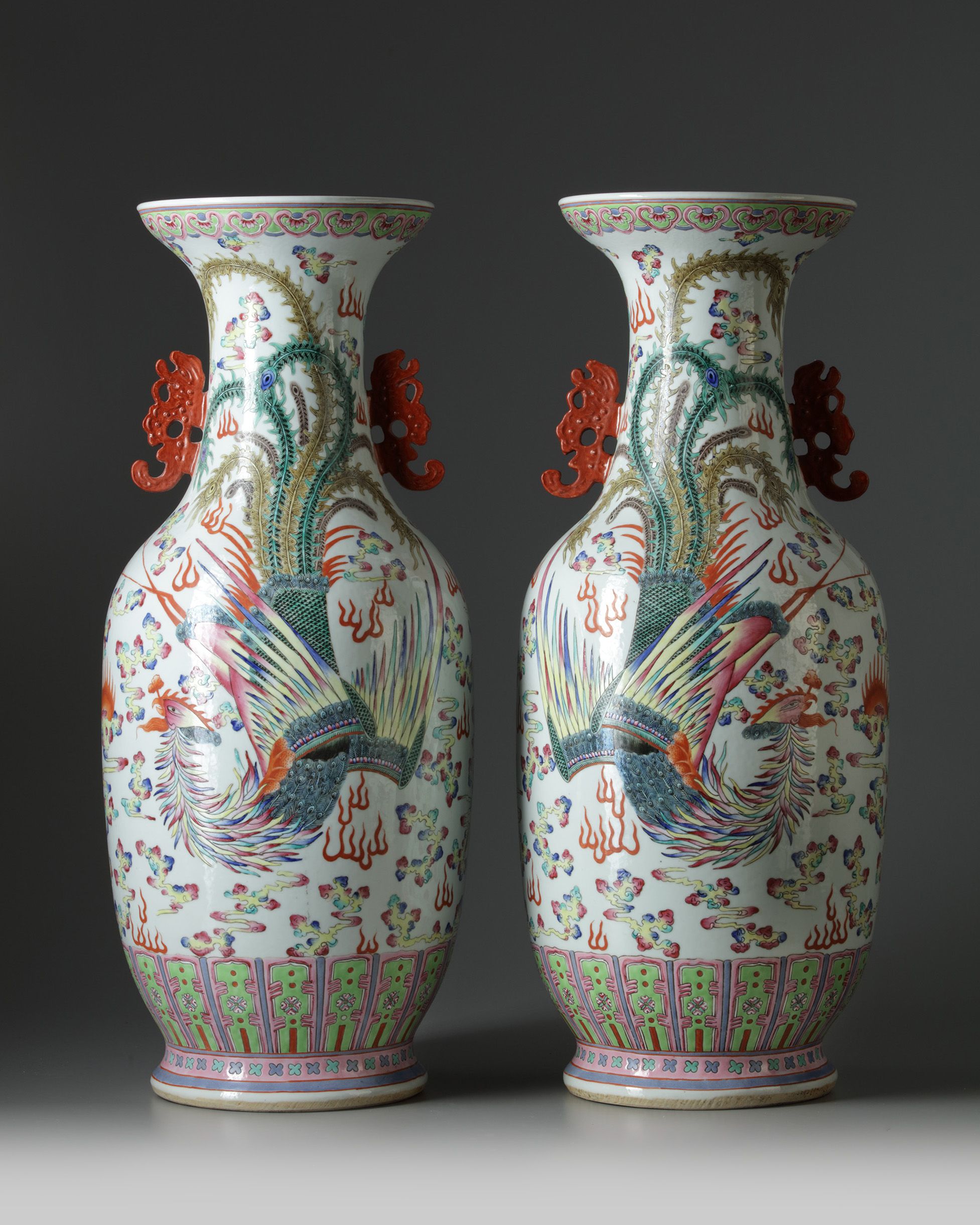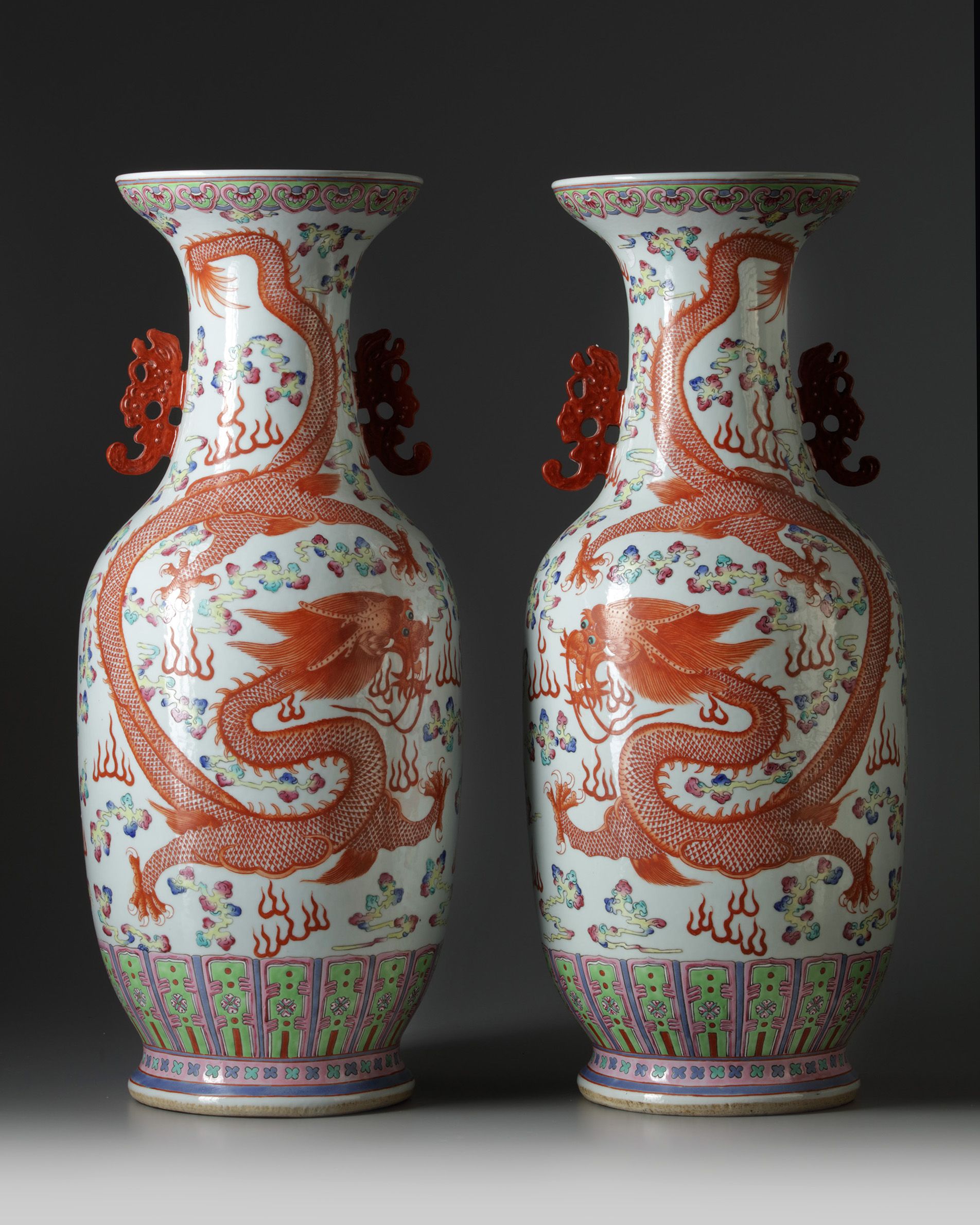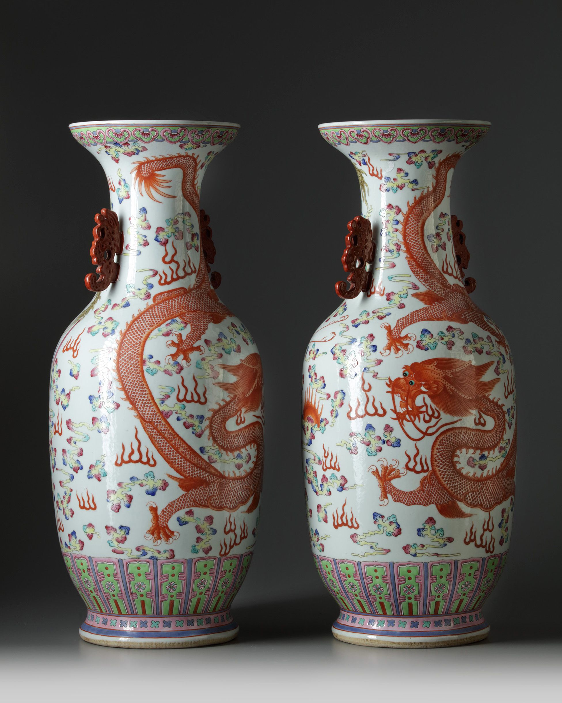 Each vase is decorated with two iron-red stylised mythical beast handles to the neck. Each vase is boldly decorated in mirror image with a phoenix with a sun and a dragon chasing the flaming pearl all amongst scrolling clouds between a ruyi-head band to the rim and a lappet band to the foot.