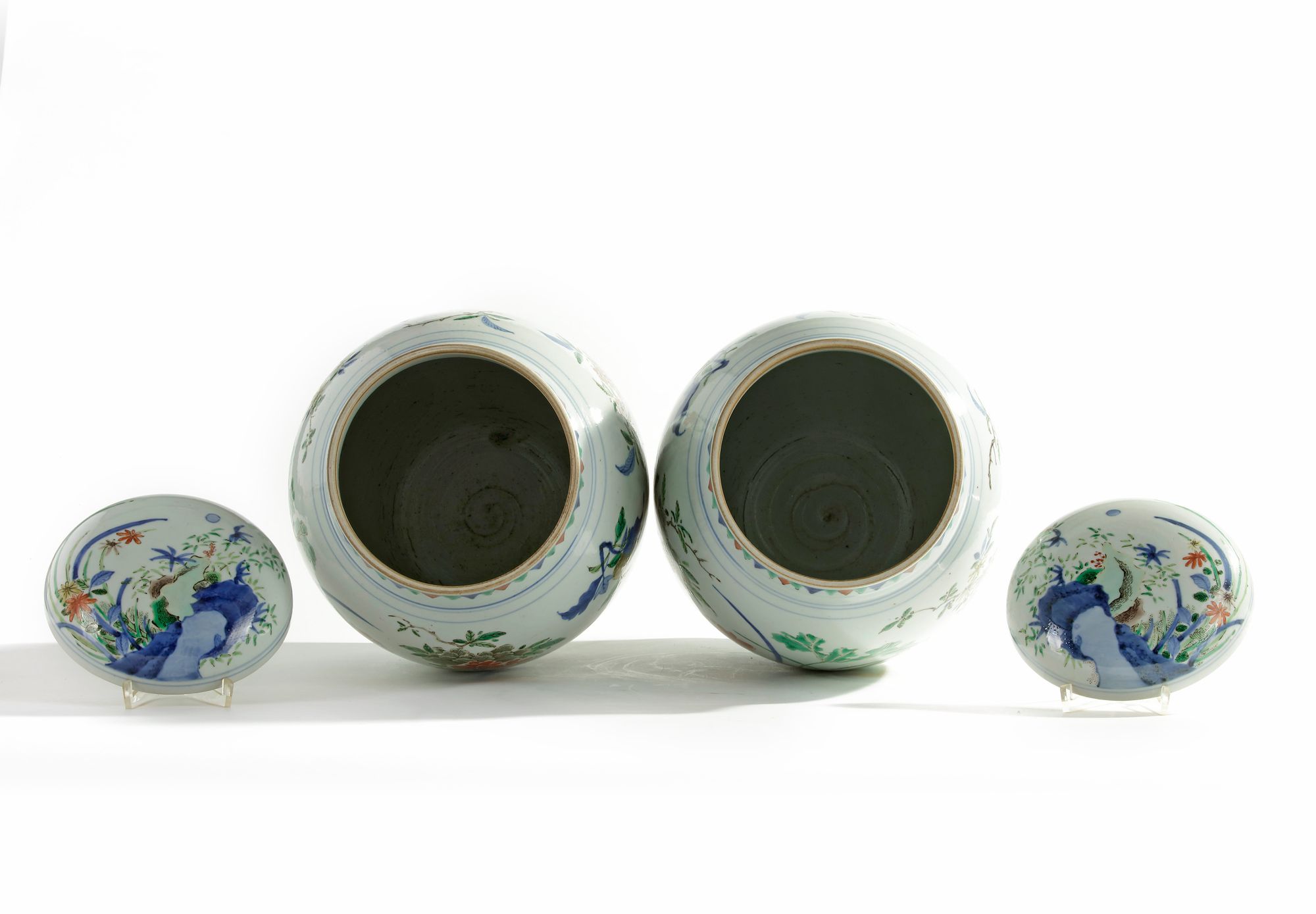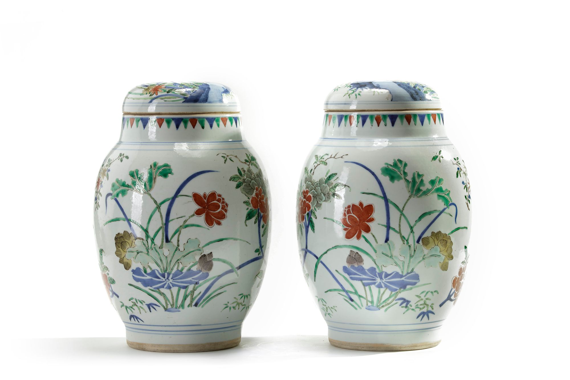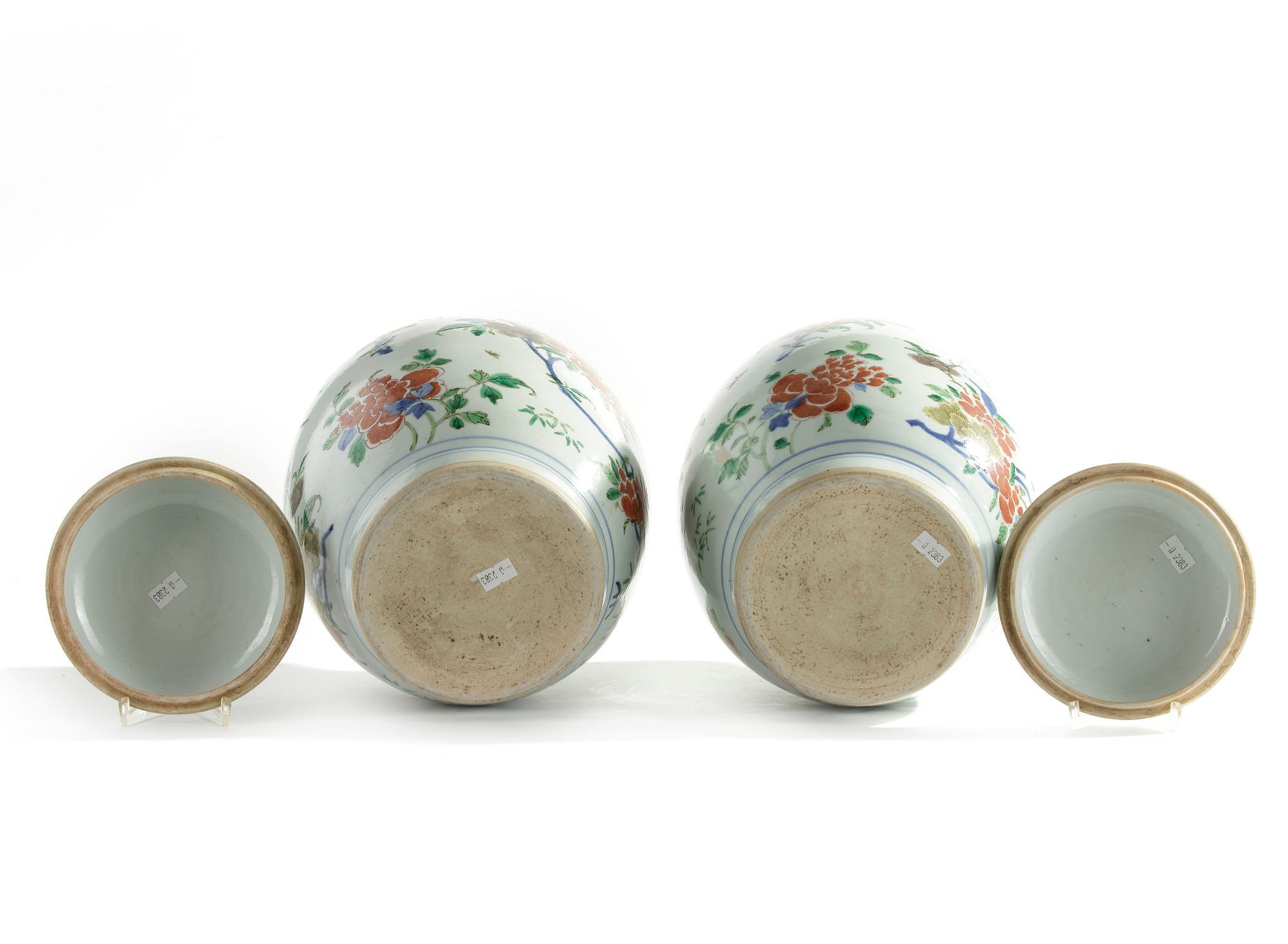 A pair of Chinese wucai 'floral' ovoid vases and covers