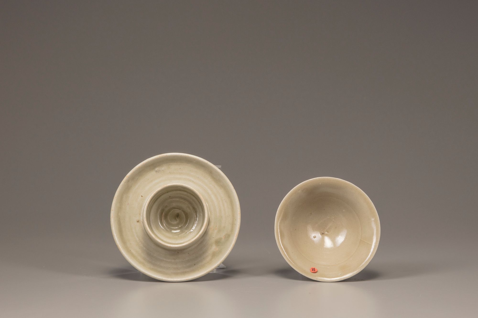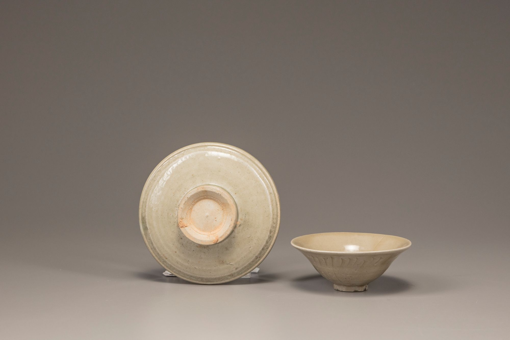 The bowl is thinly potted and decorated to the exterior with incised lines radiating from the foot. The bowl is accompanied with a later cup stand. Both pieces are covered in an olive-green glaze.