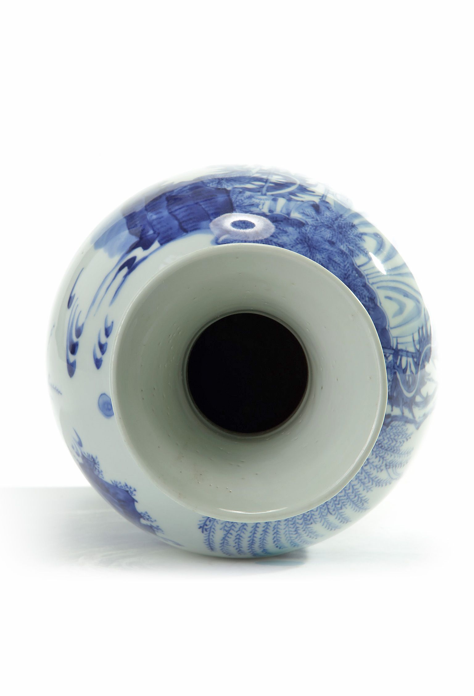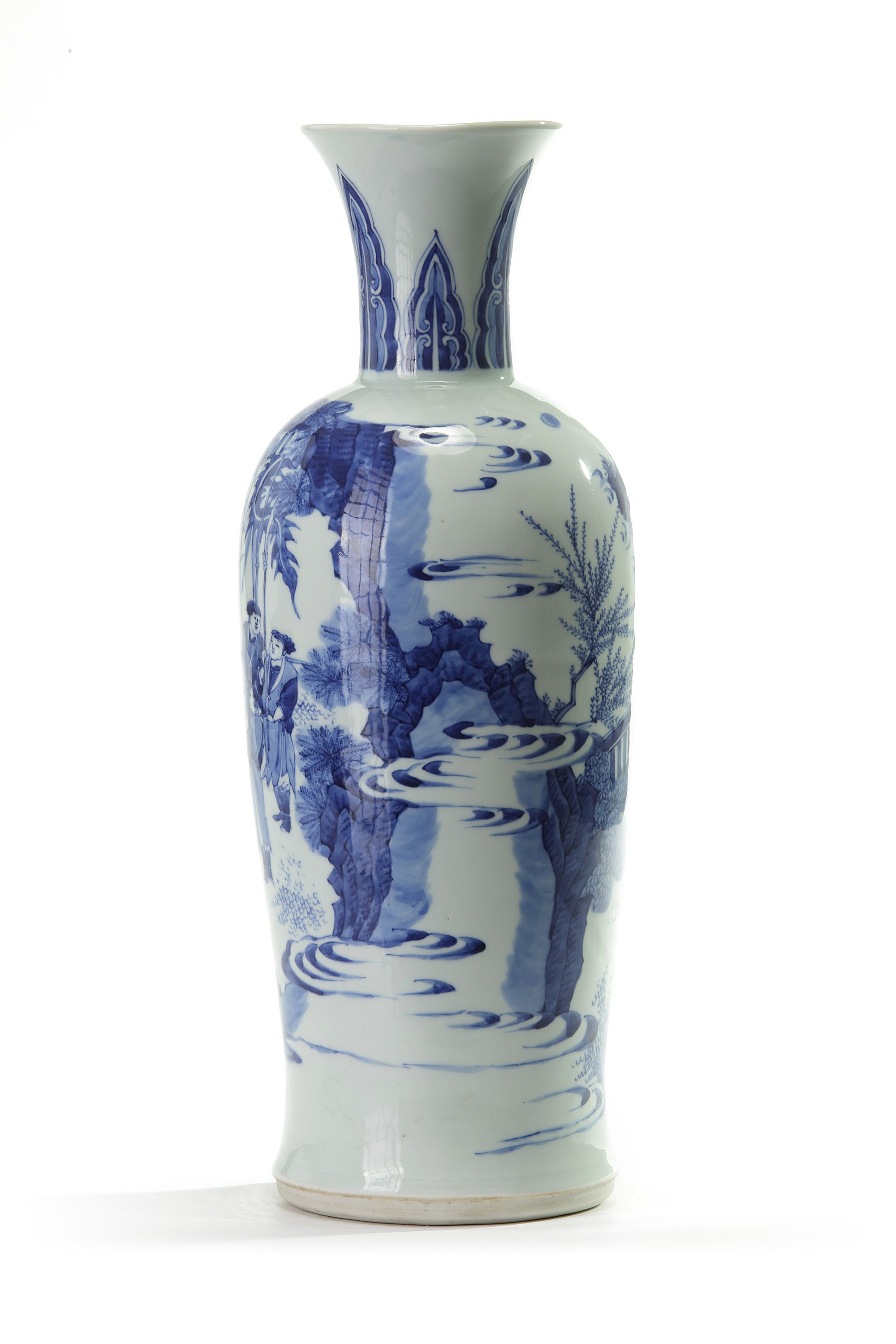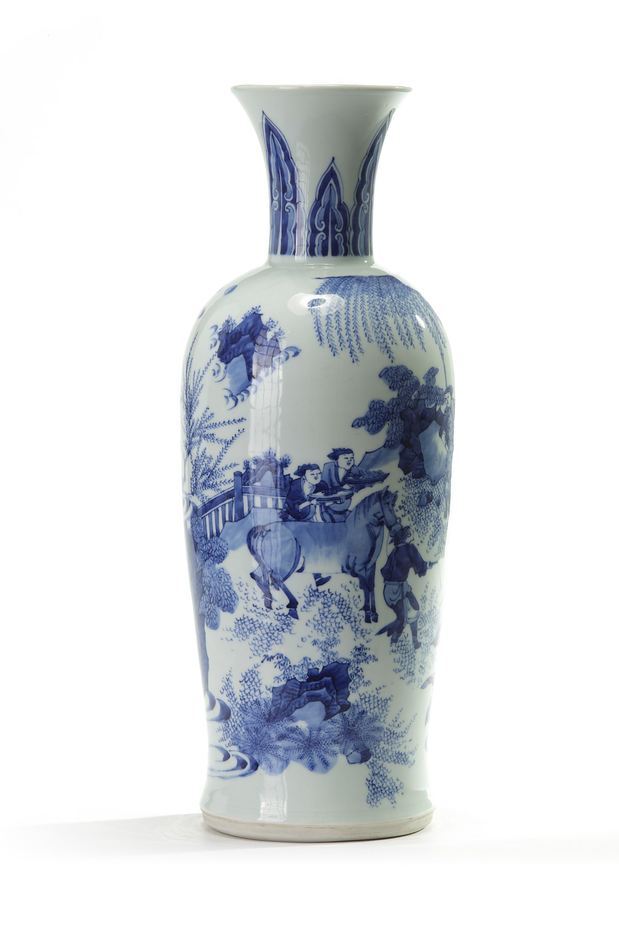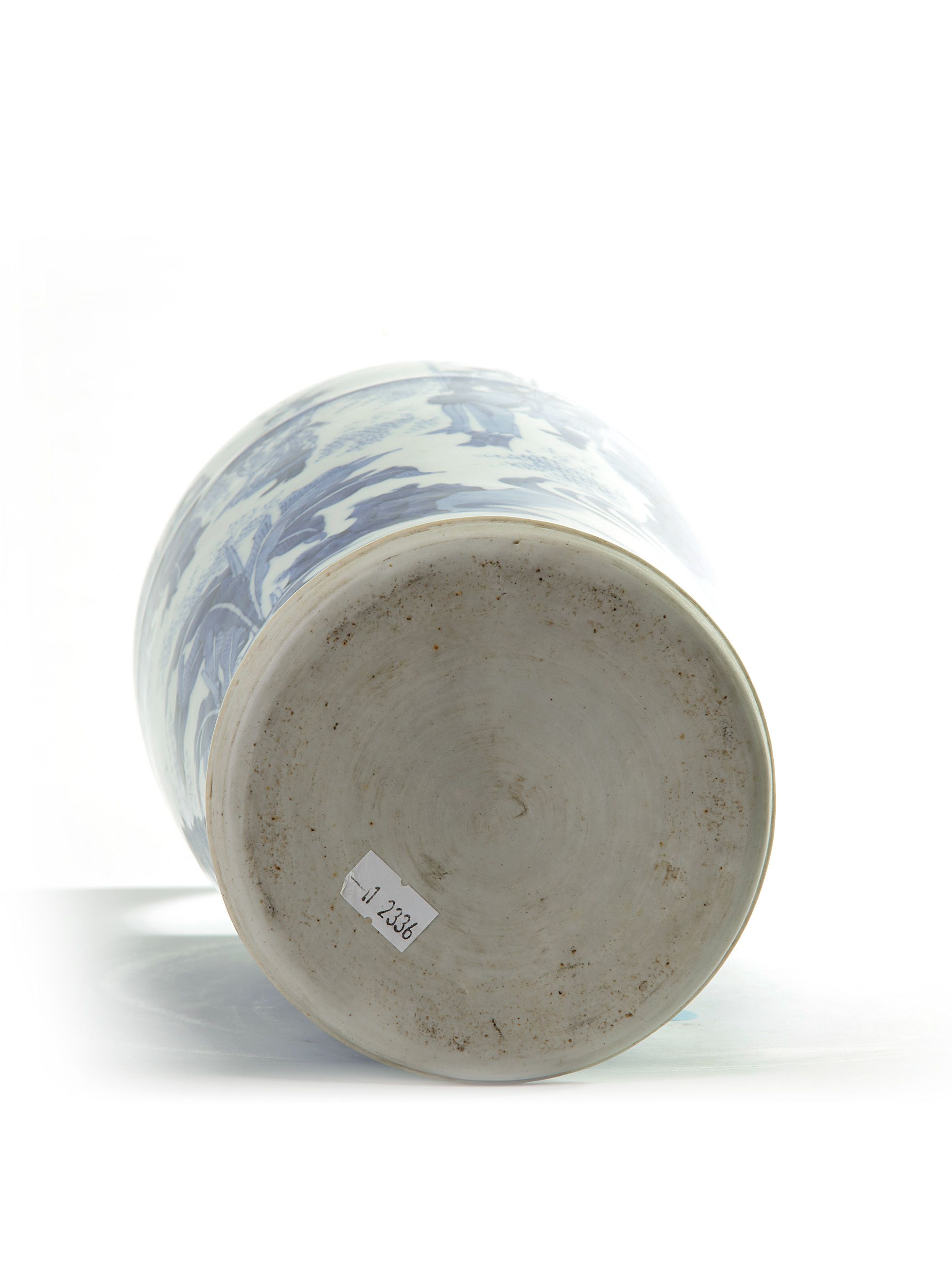 The body of the vase is decorated with a continuous scene of soldiers carrying banners in a pavilion amongst clouds and plantain. The flaring neck is decorated with upright flanges.