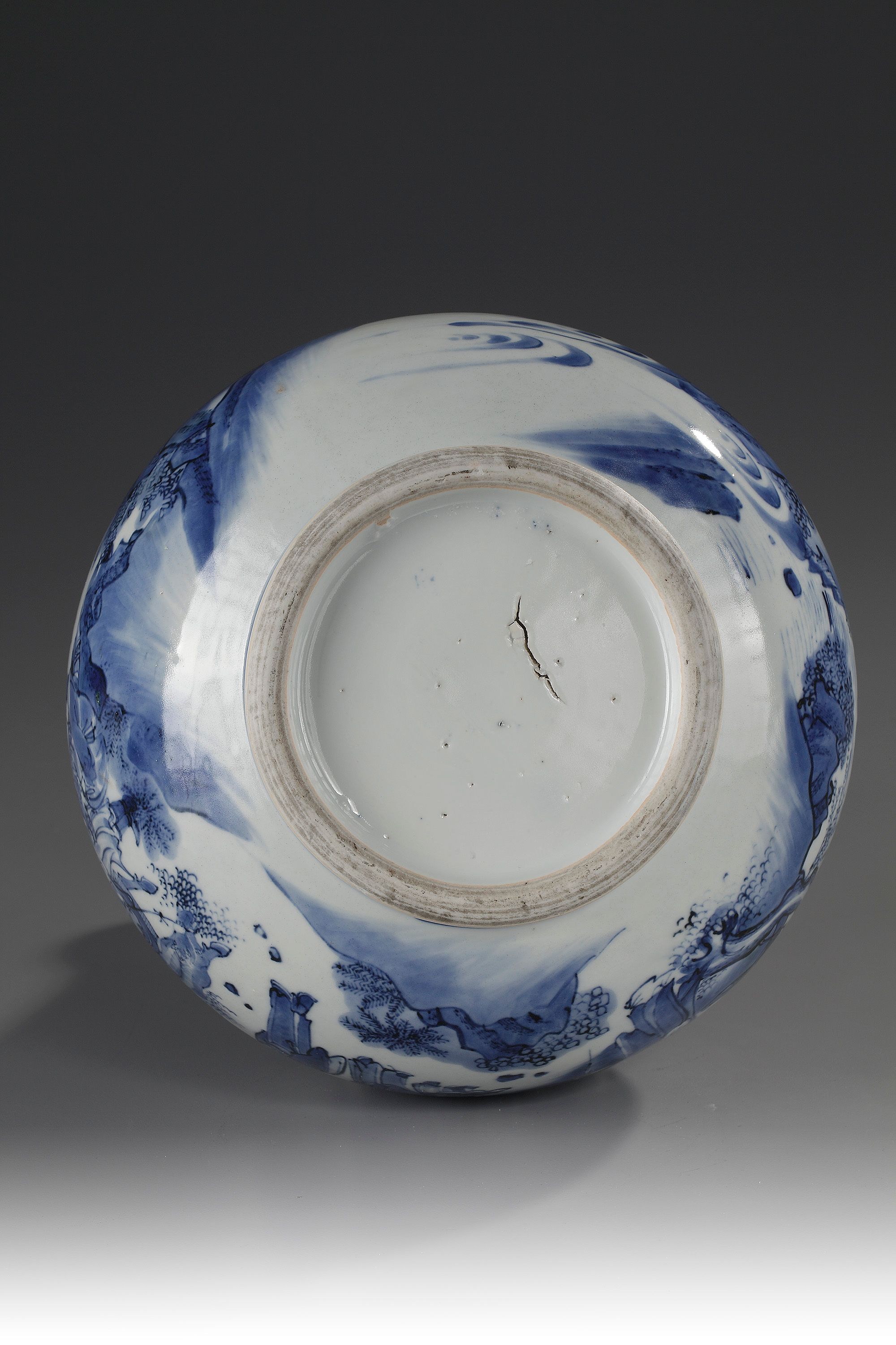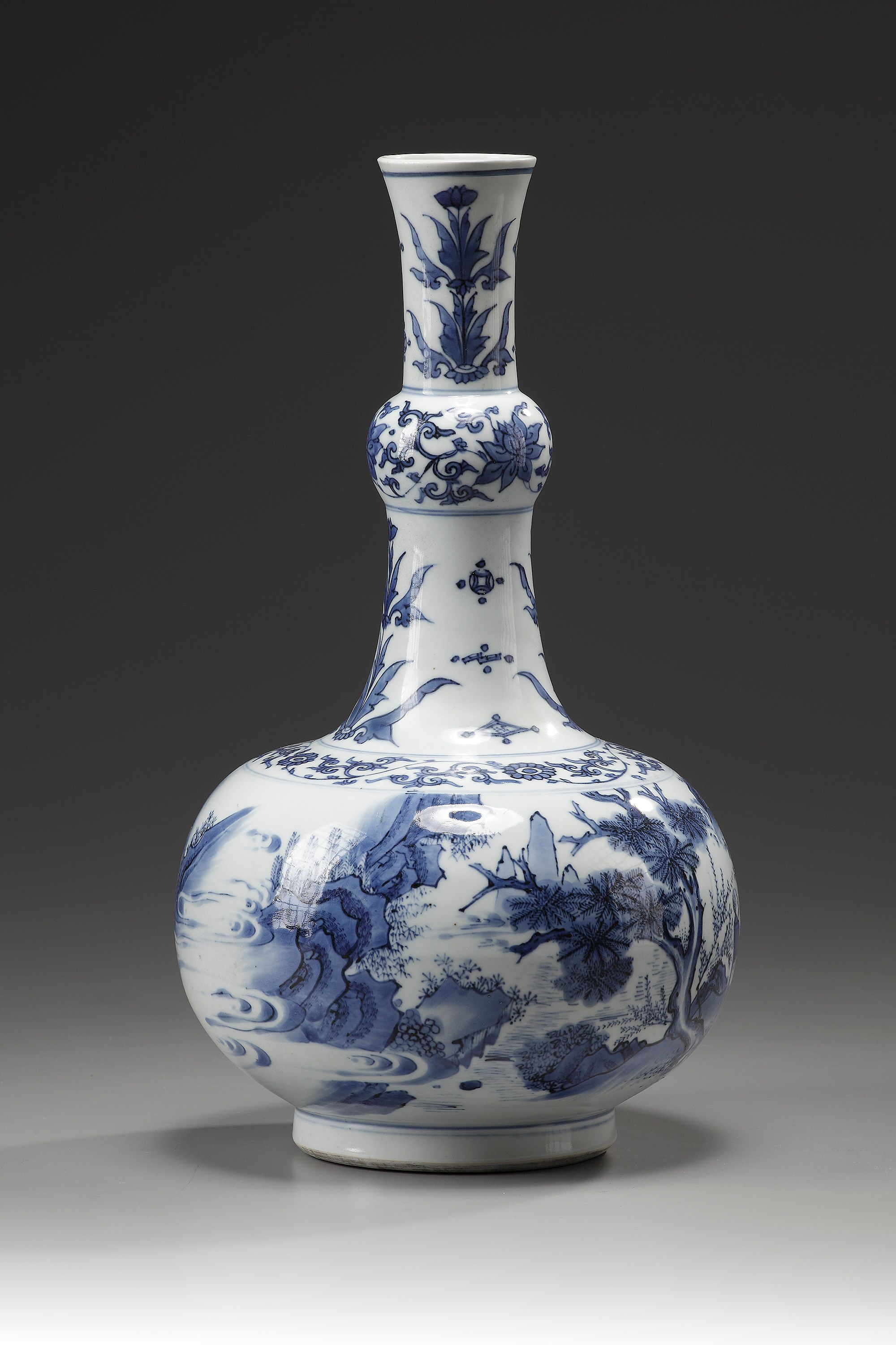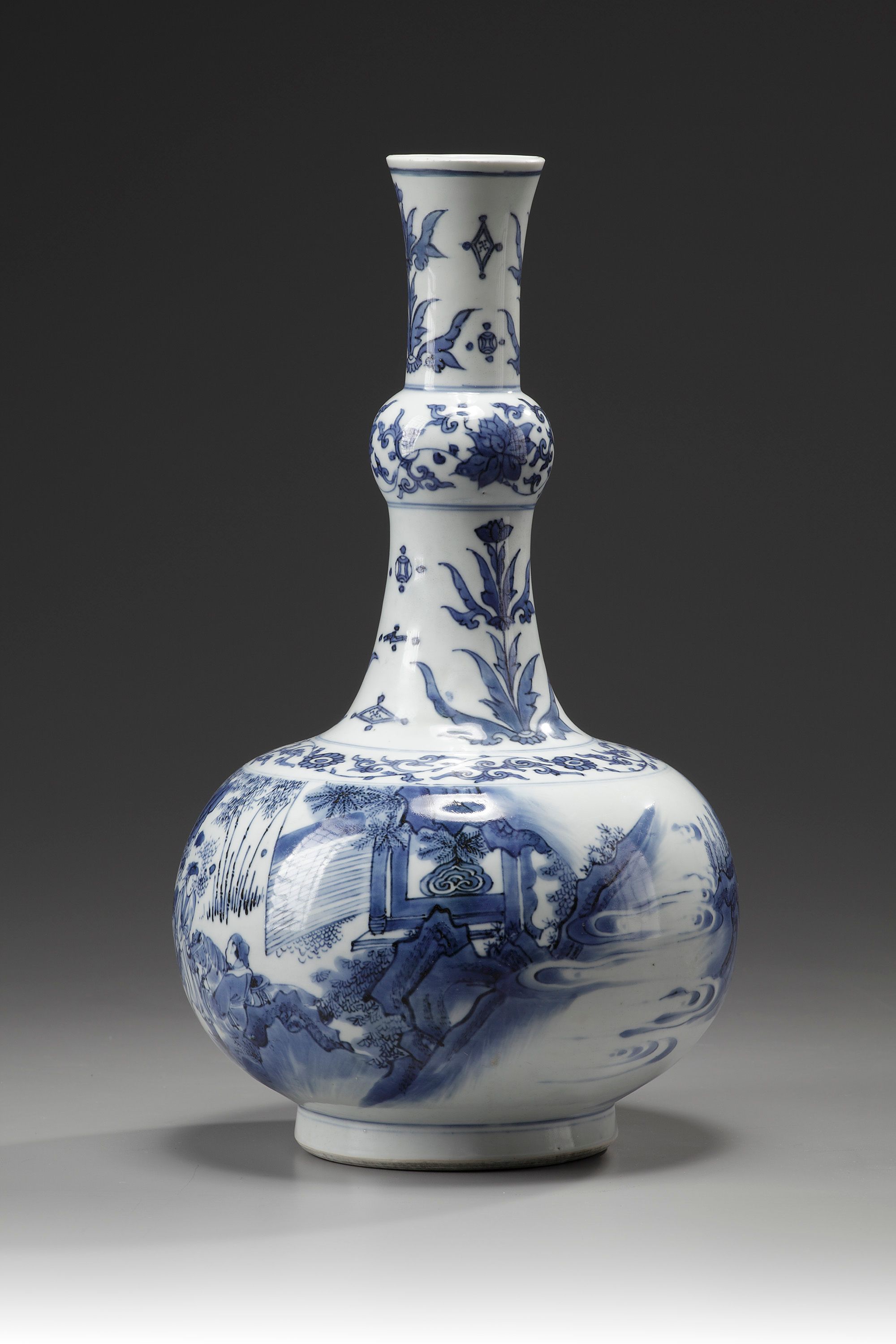 painted to the globular body with a continuous landscape scene, with two dignitaries and their entourage, surmounted with a tall neck moulded with a bulb, painted with stylised lotus.