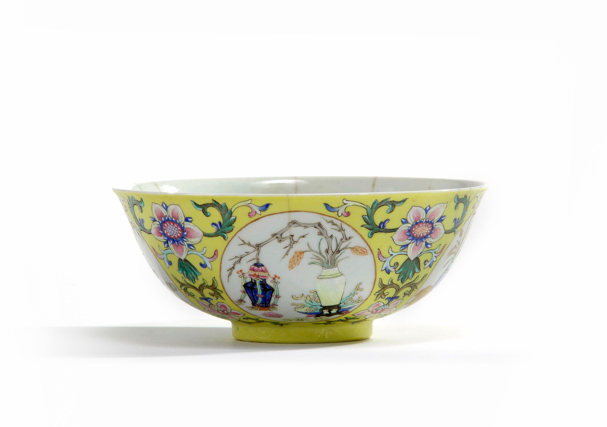 The bowl is decorated to the exterior with gilt medallions each enclosing a flower vase with a lantern and further scattered precious objects, separated by flower scrolls, all reserved on a lemon yellow ground decorated with sgraffiato vines.