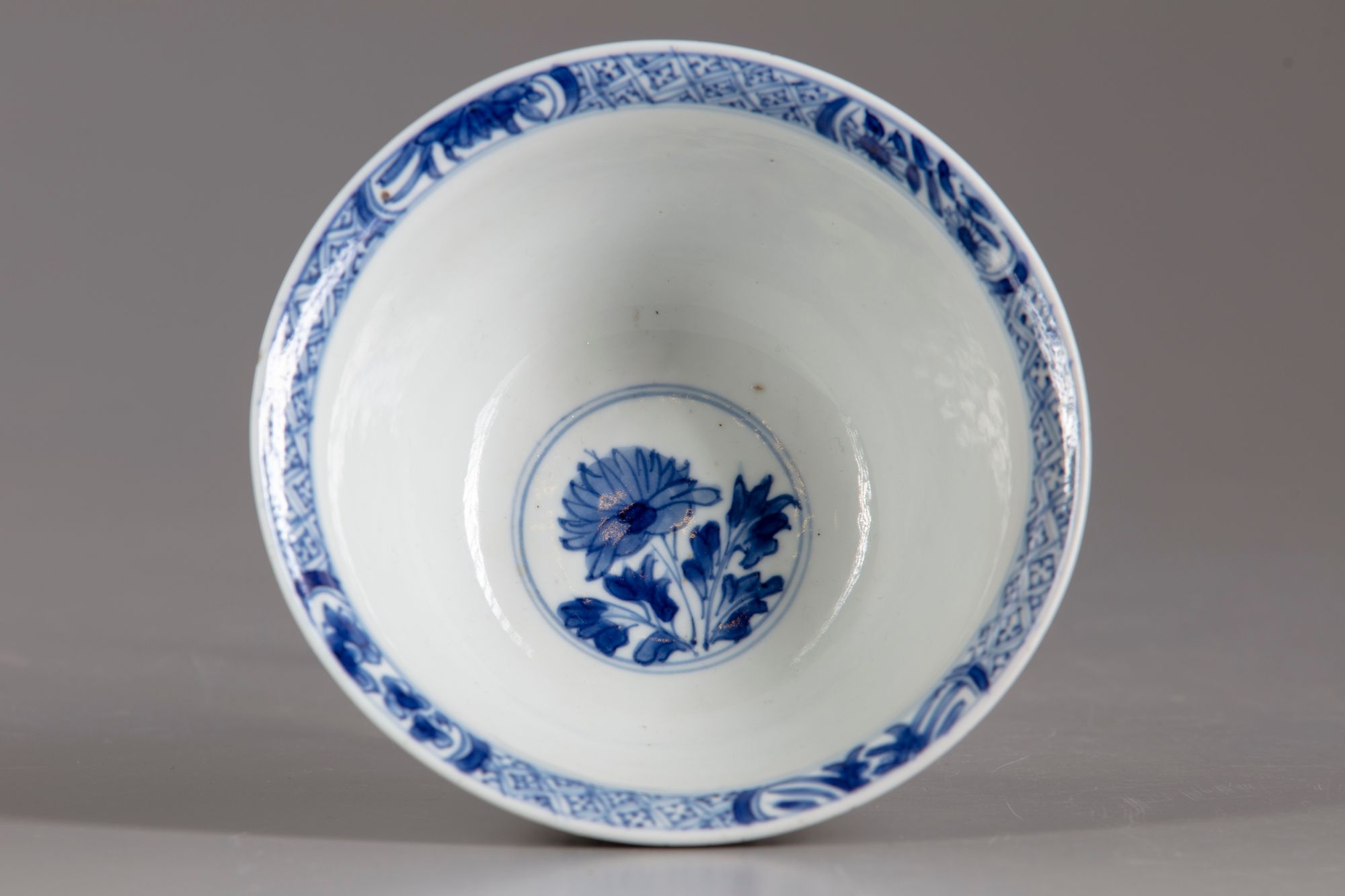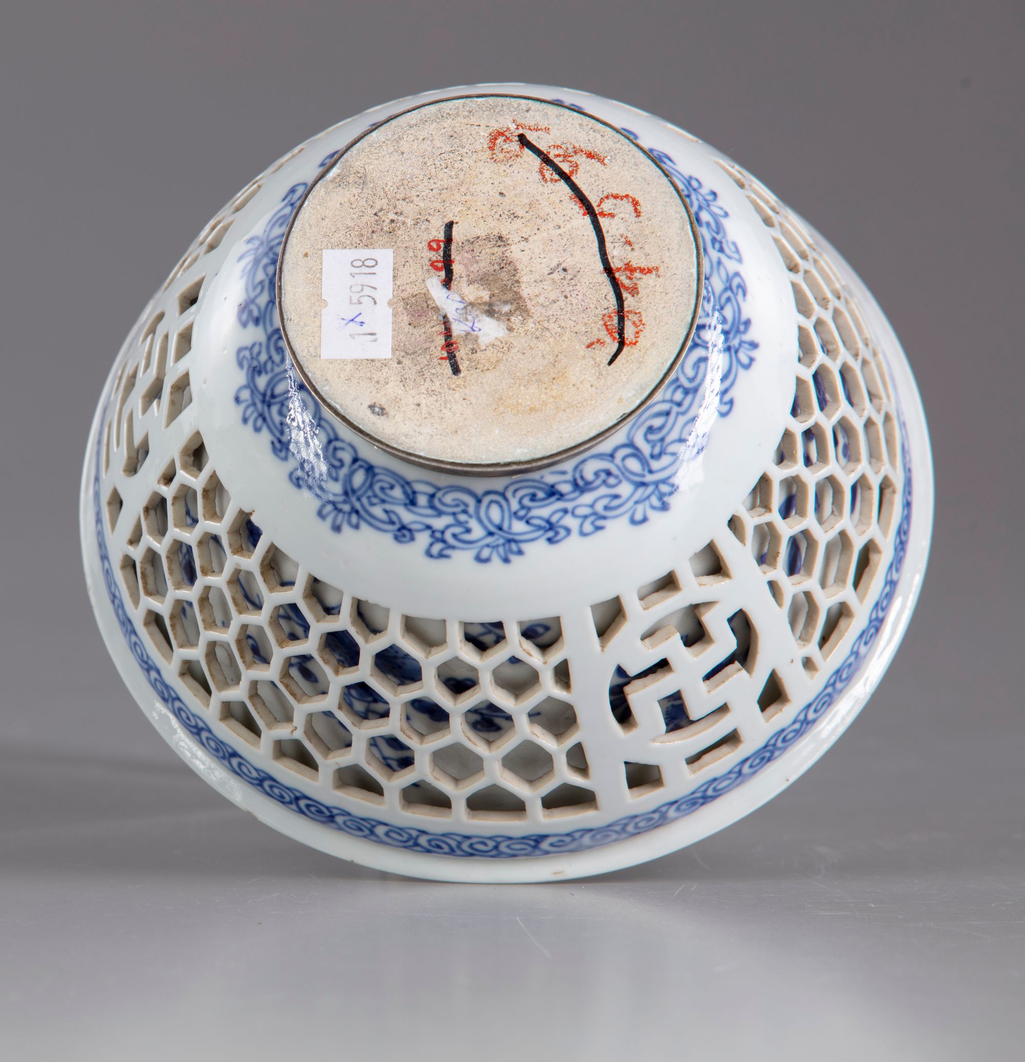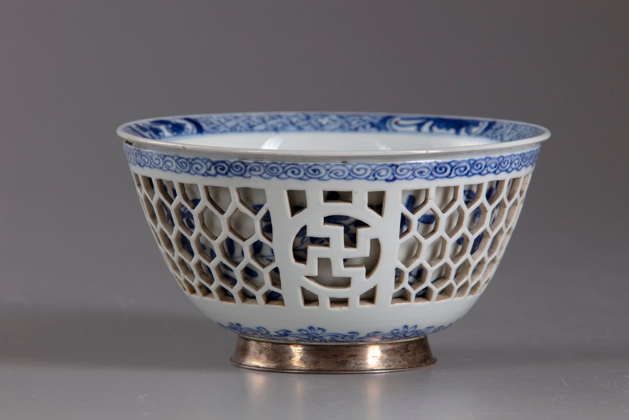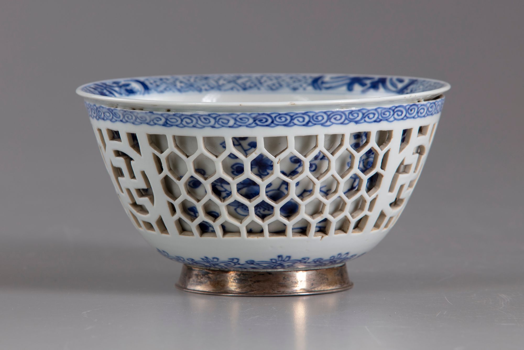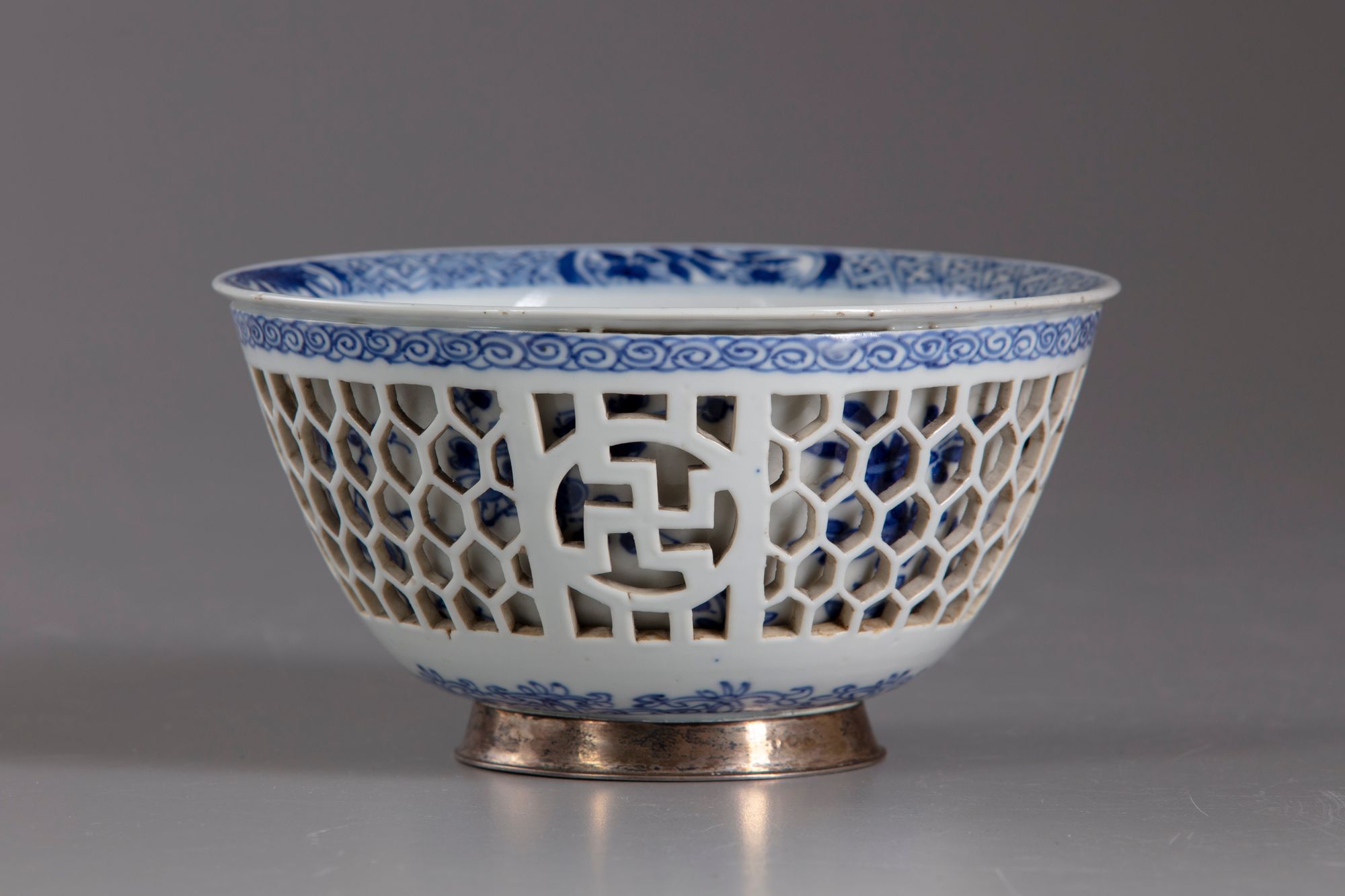 The interior is decorated with a flower spray, the rim with floral cartouches and a diaper band. The double walled exterior is decorated to the interior with flower sprays, and the outer wall is pierced with wan symbols alternating with a honeycomb pattern. The foot is mounted in silver.