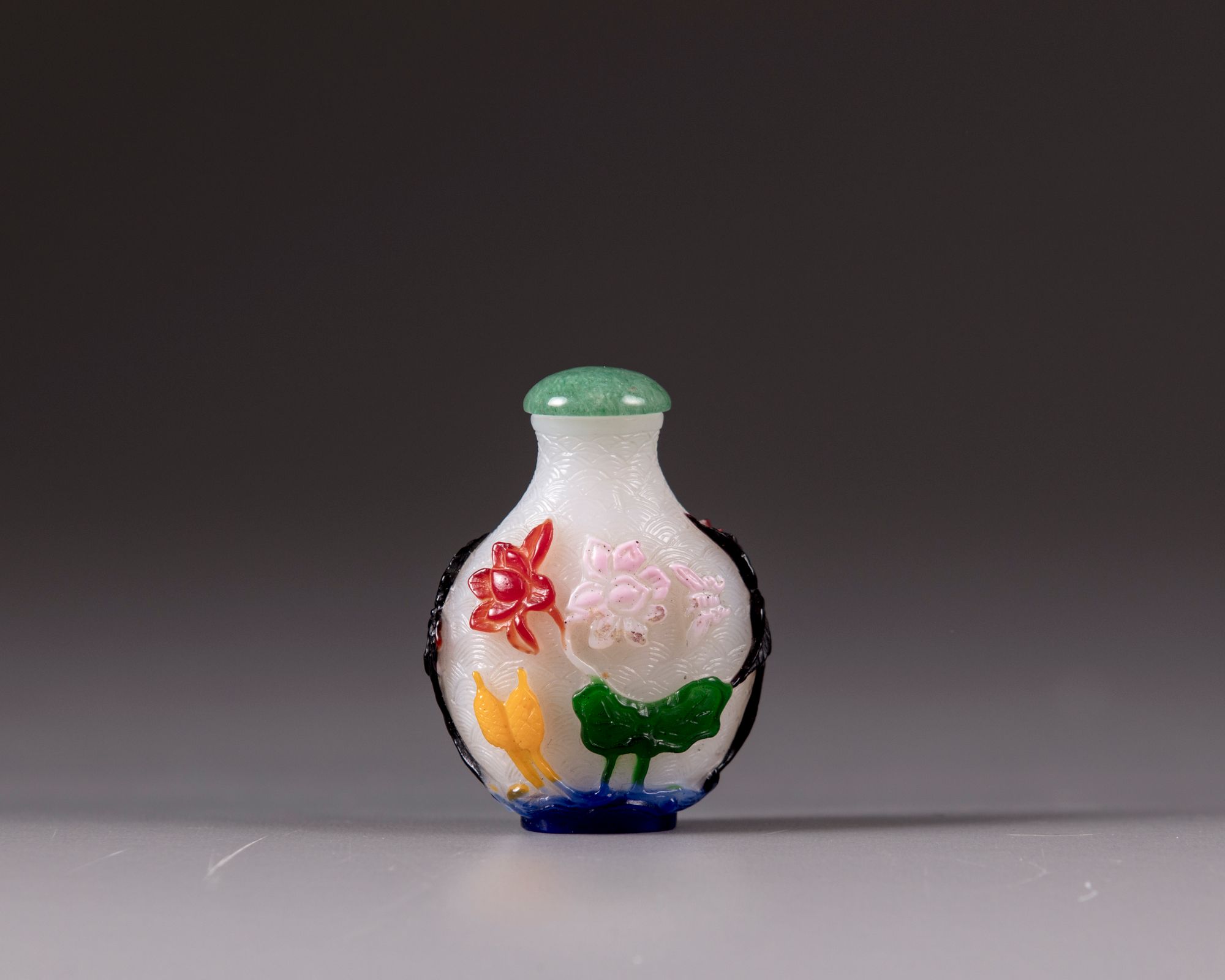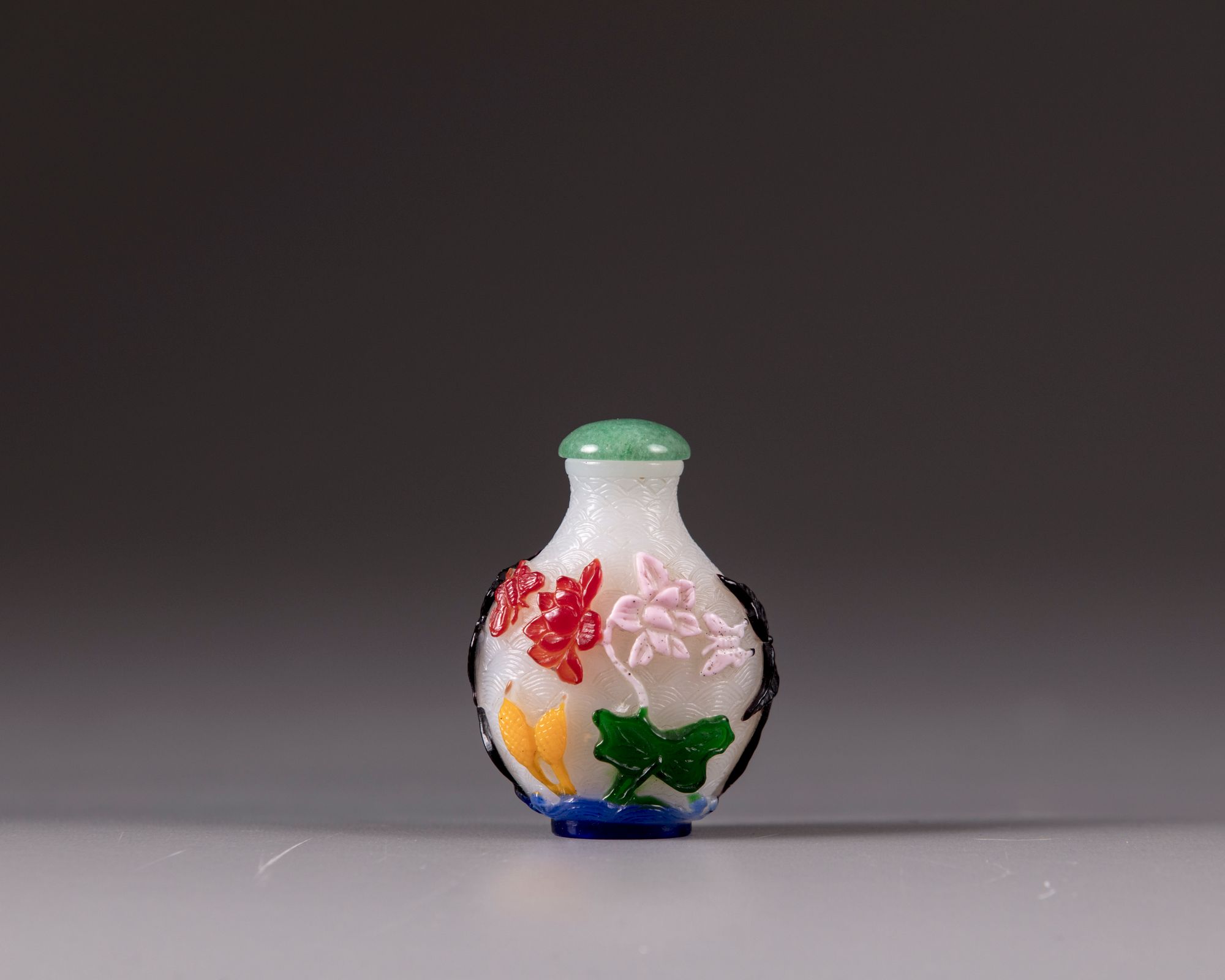 The bottle is carved with a continuous design in translucent overlays with various flowers in different colors against the opaque white ground.