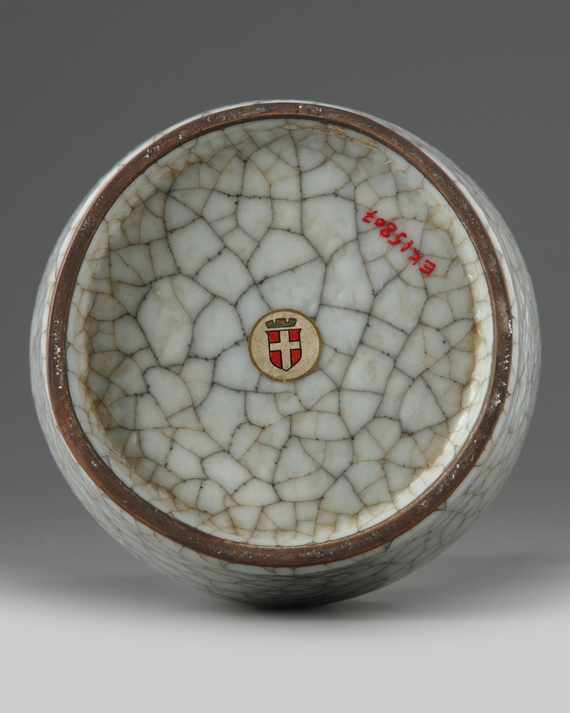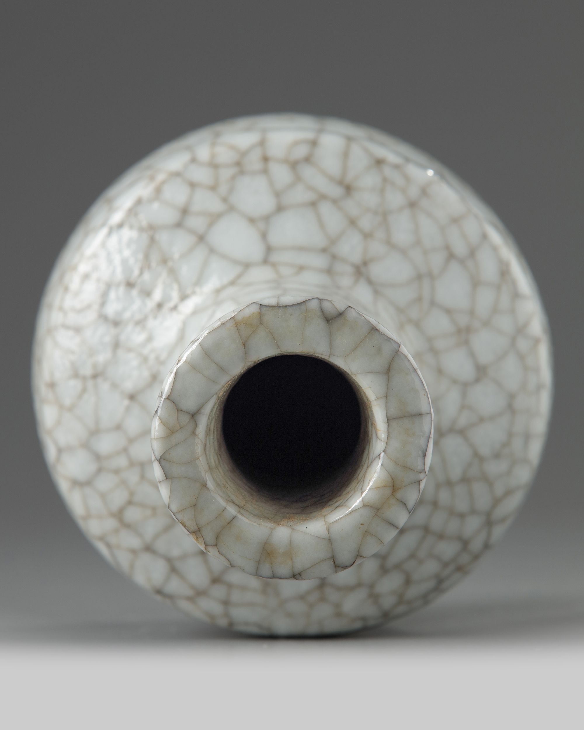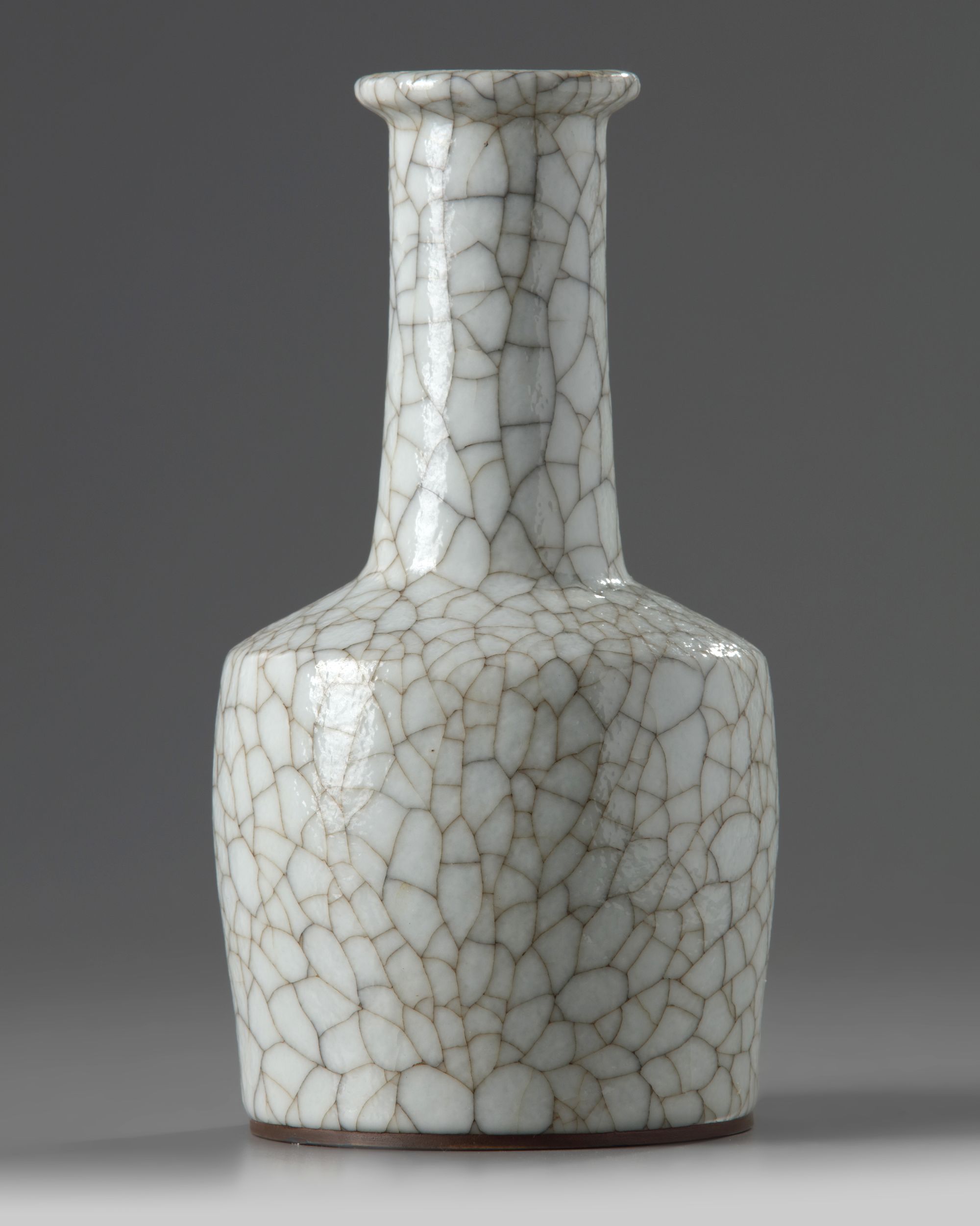 The vase is of mallet form with an everted flat rim, the vase is covered overall with a pale grey glaze suffused with a network of dark crackles.