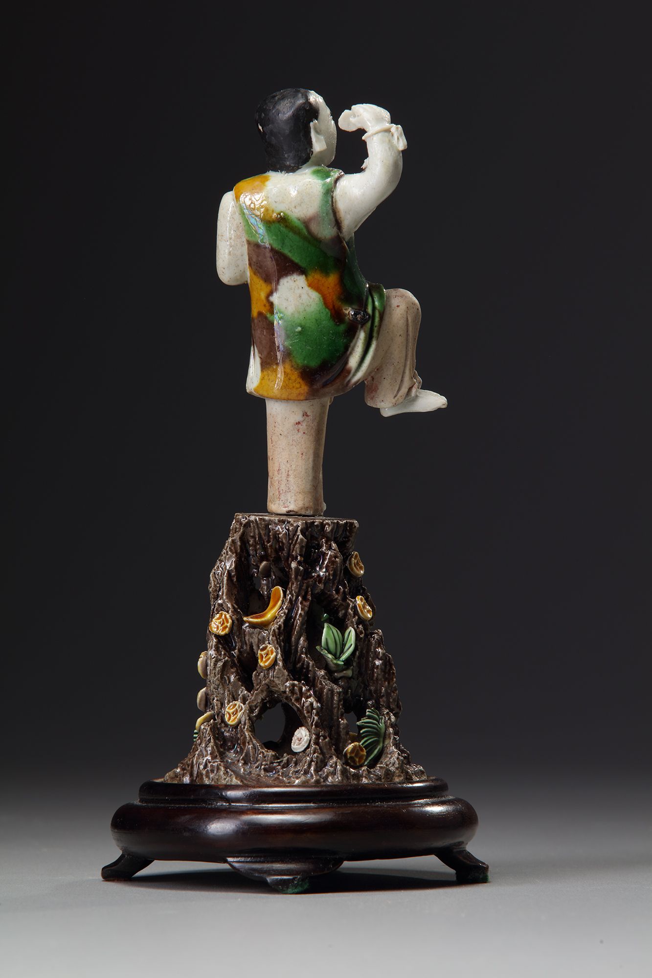 The figure of Liu Hai is modelled smiling with one leg raised, he holds a string of coins in his hand. He stand on a brown-glased rocky outcrop where the three legged toad hides in one of the grottoes.
