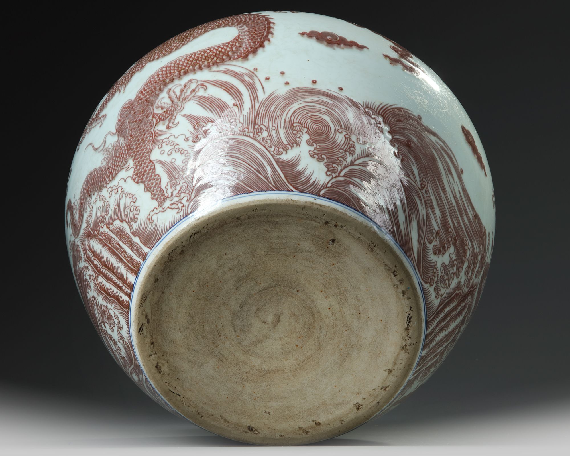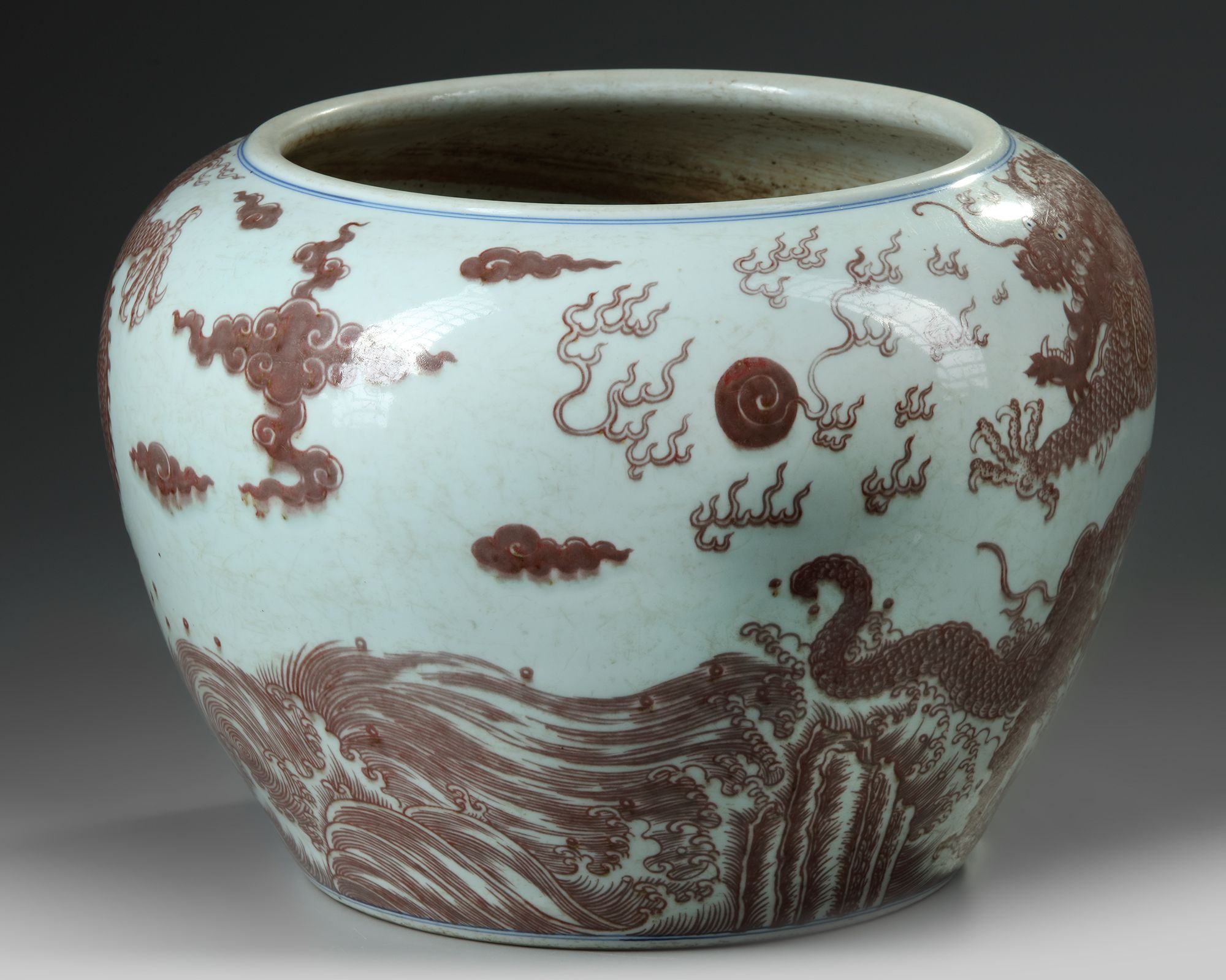 The exterior is decorated with two five-clawed dragons leaping from tumultuous waves chasing the flaming pearl, separated by clouds. 29 cm.