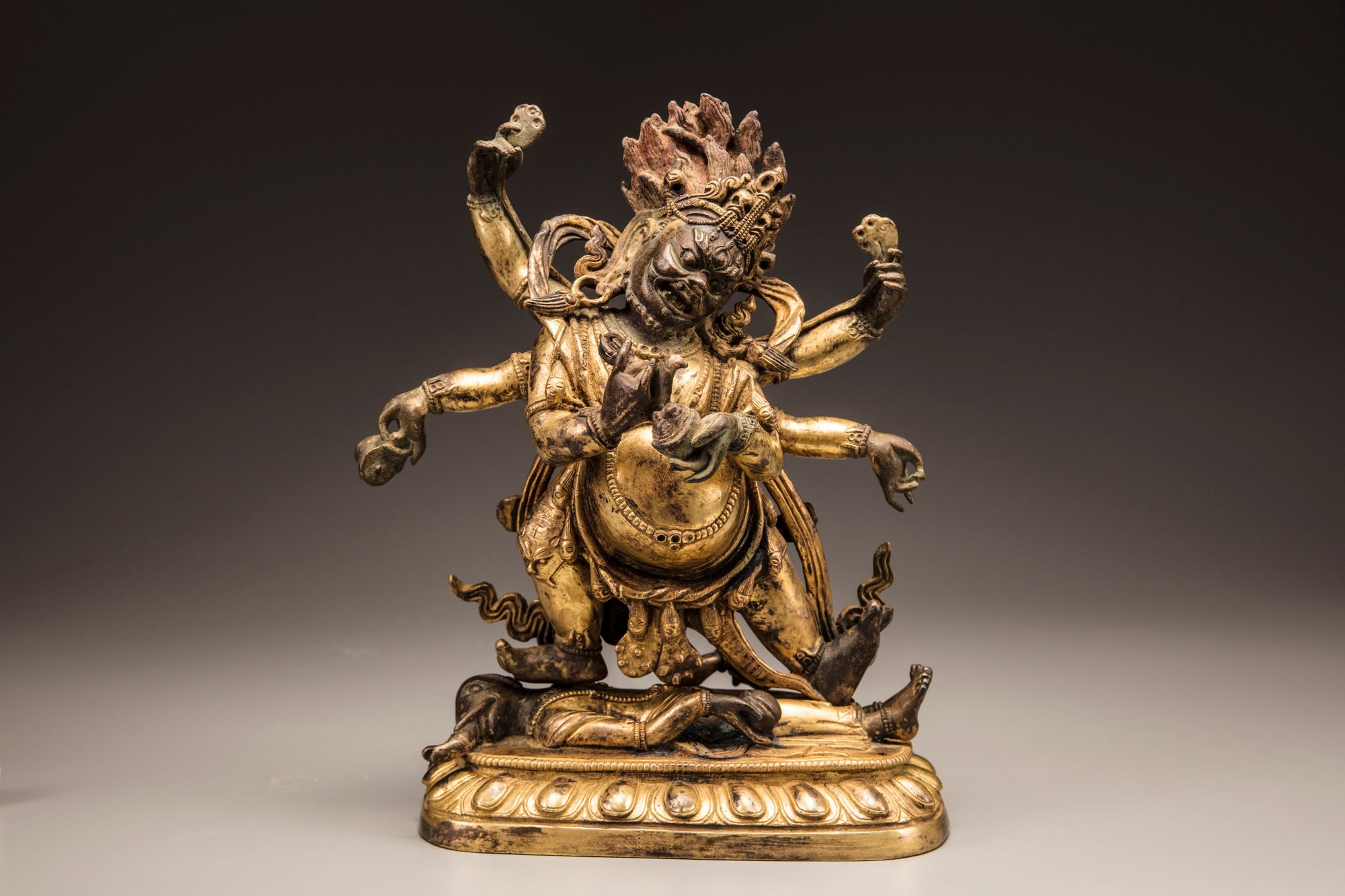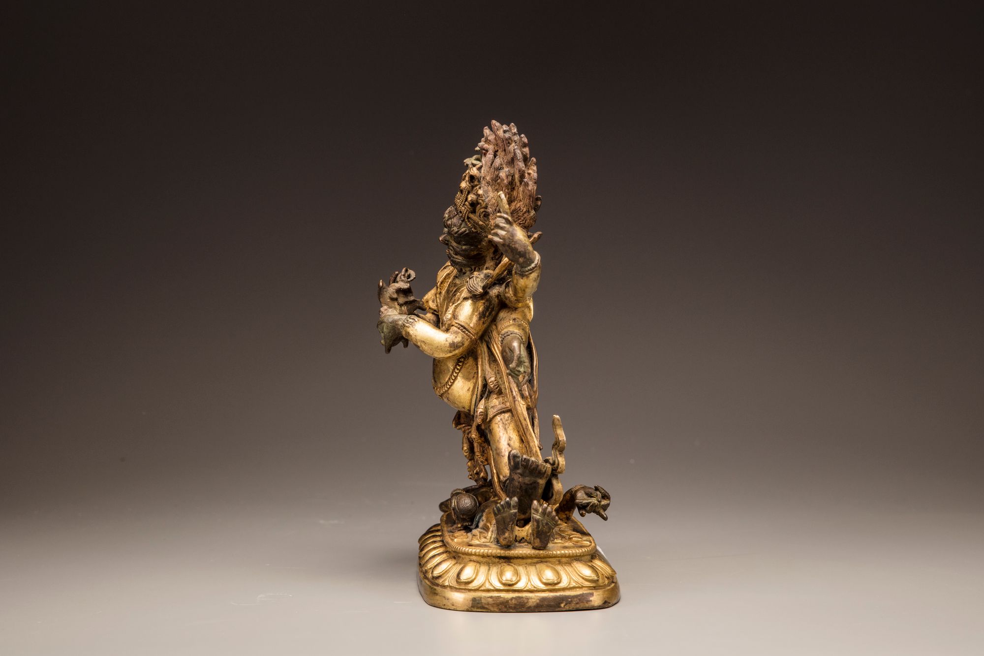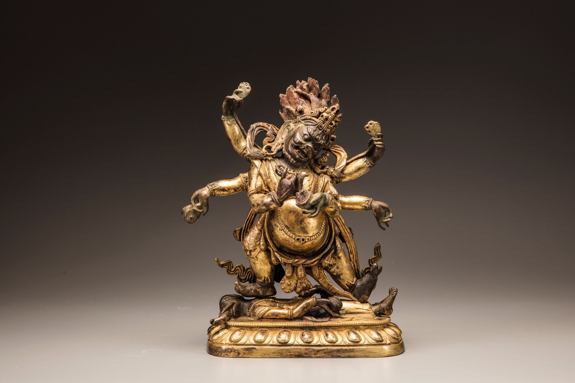 The protector god is modelled wearing and elephant and a tiger pelt, with a fierce expression on his face, his hair colored with red pigment, with its main arms holding an axe and an skullcap, its upper back arms are holding the paws of the elephant pelt, and one of the lower arms is holding a drum. The figure is modelled standing on a supine elephant holding two further attributes, all on a single lotus base.