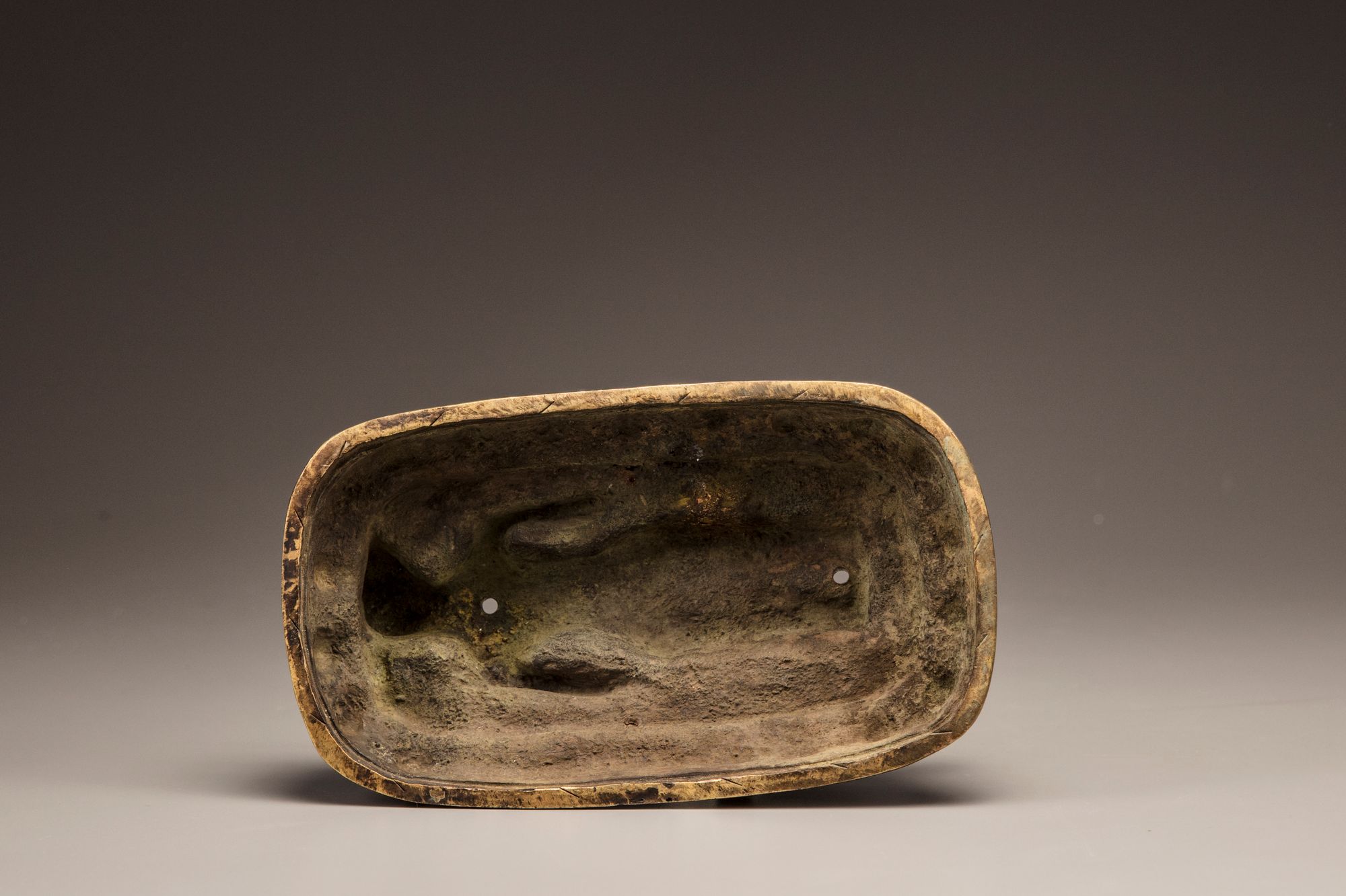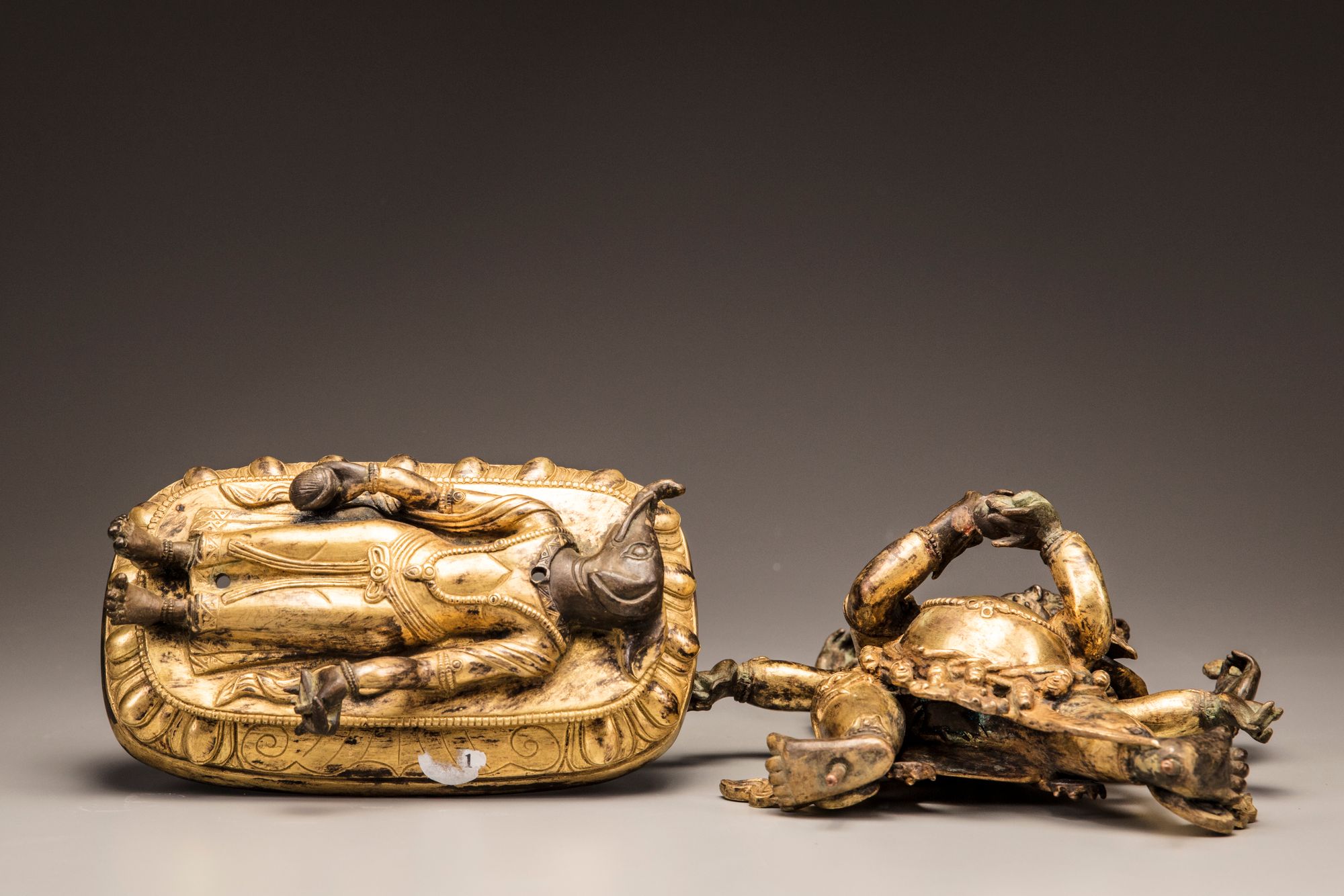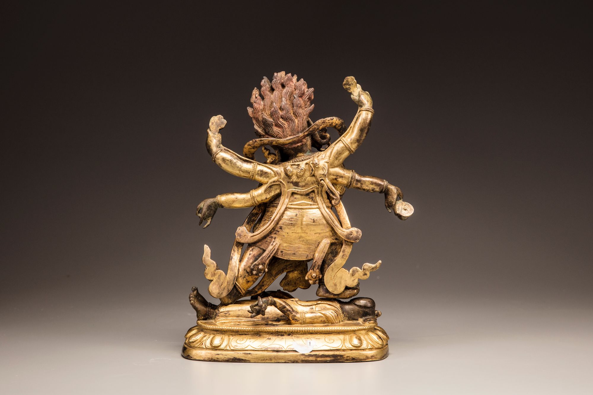 The protector god is modelled wearing and elephant and a tiger pelt, with a fierce expression on his face, his hair colored with red pigment, with its main arms holding an axe and an skullcap, its upper back arms are holding the paws of the elephant pelt, and one of the lower arms is holding a drum. The figure is modelled standing on a supine elephant holding two further attributes, all on a single lotus base.