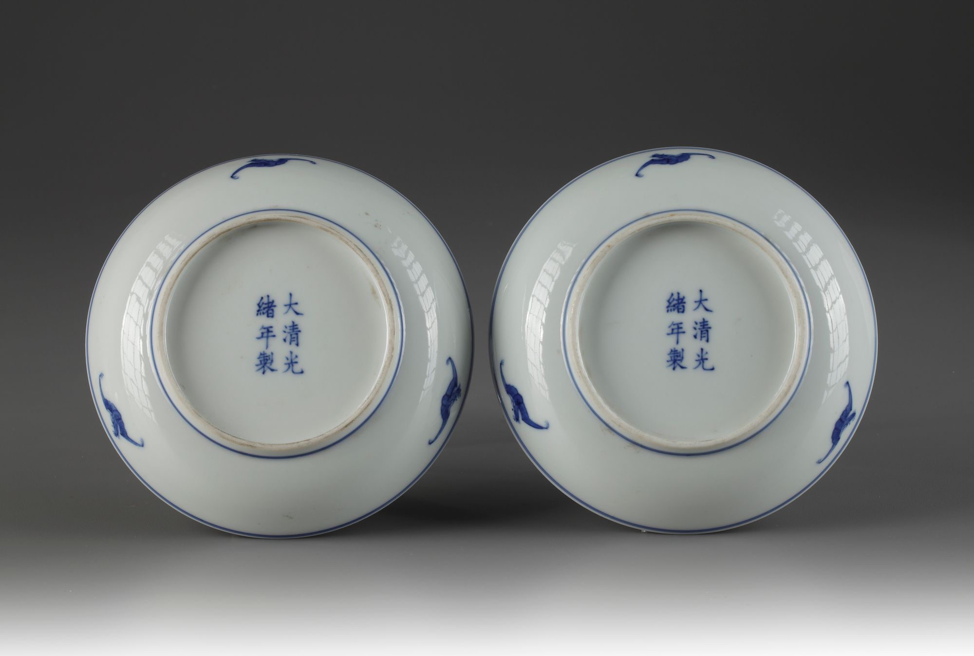 Painted to the interior with ducks swimming among lotus, between a swashed-blue lappet border surrounded again by ducks swimming among lotus, the exterior decorated with three flying bats.