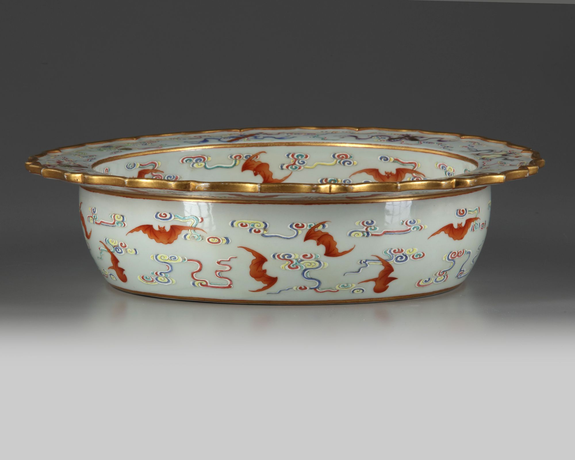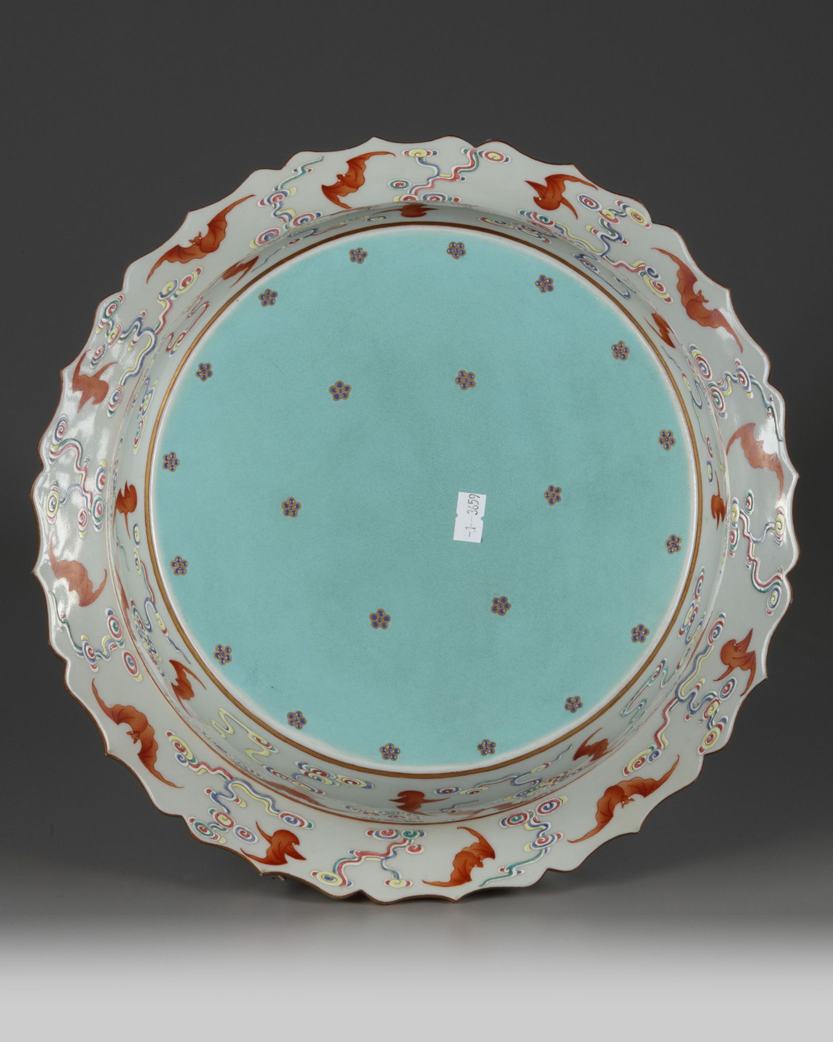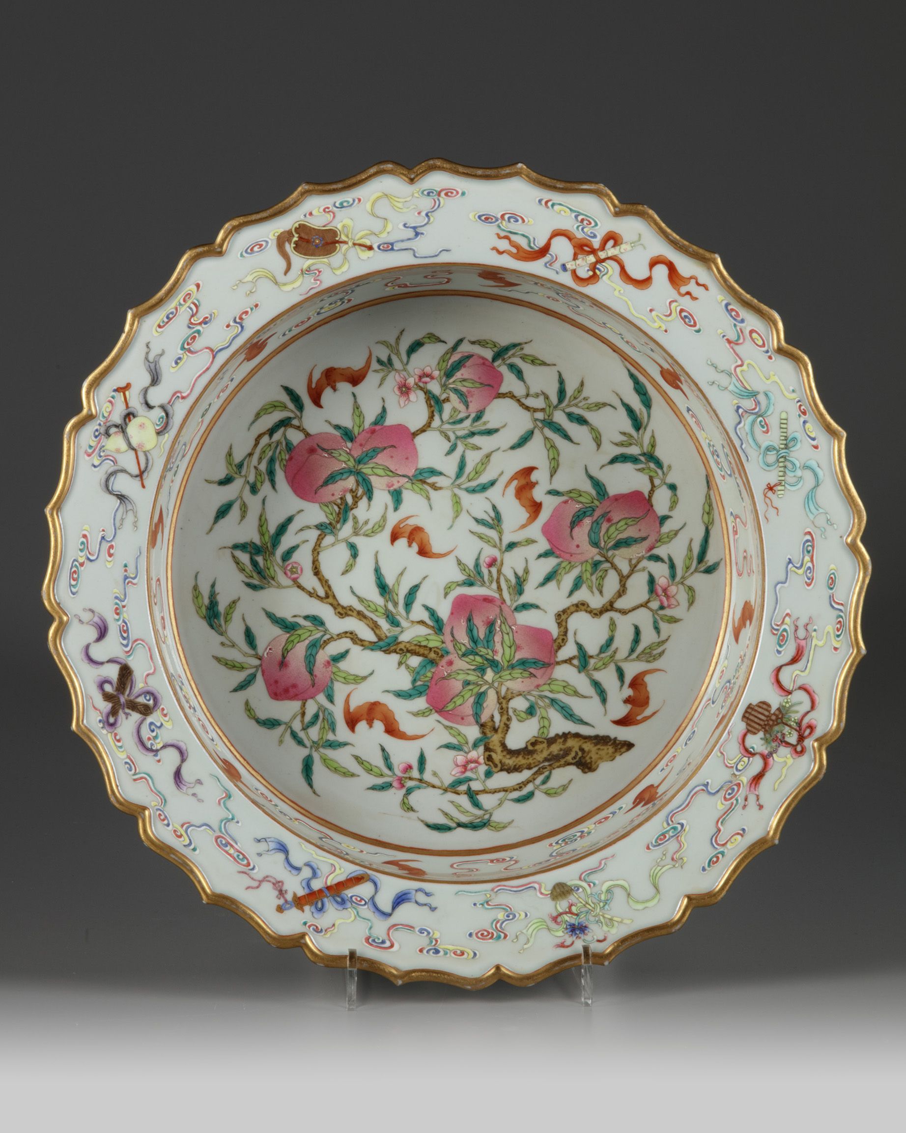 The interior is decorated with five bats in flight amongst a leafy branch bearing nine peaches. The cylindrical walls are decorated with further bats and clouds and the everted rim is decorated with the beribboned attributes of the Eight Immortals. The exterior is similarly decorated and the base is enamelled turquoise.