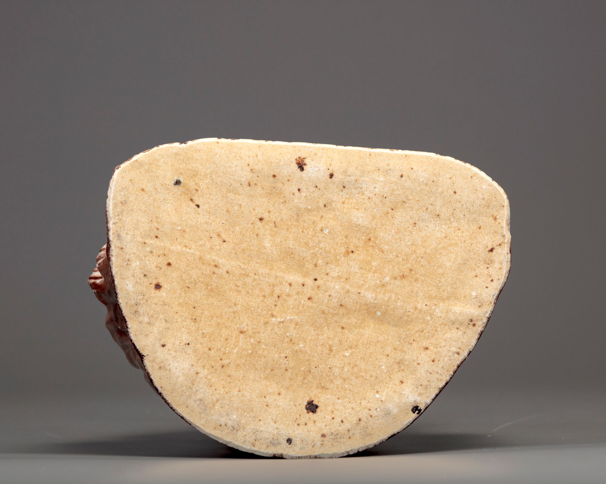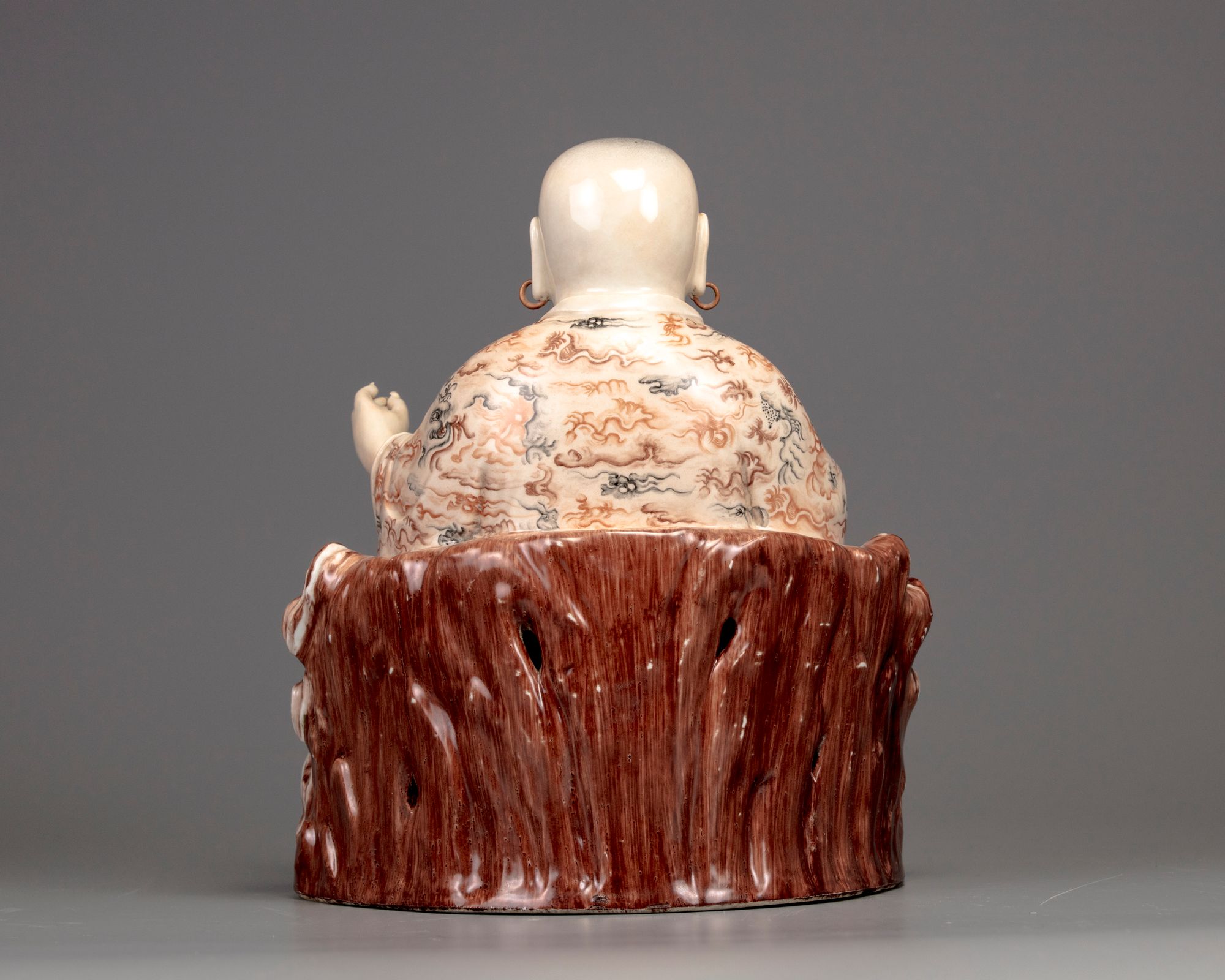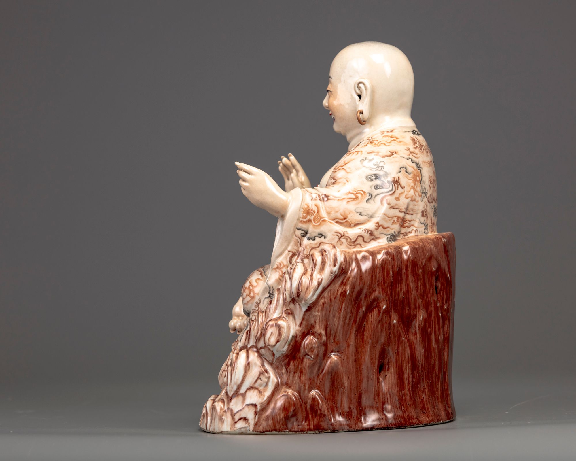 The smiling figure is modelled with pendulous earlobes and hooped earrings; his robes open to reveal his chest and belly, the robes are decorated with a pattern of cloud scrolls. He is modelled seated with his legs crossed on a pierced rocky seat. 32 cm high.