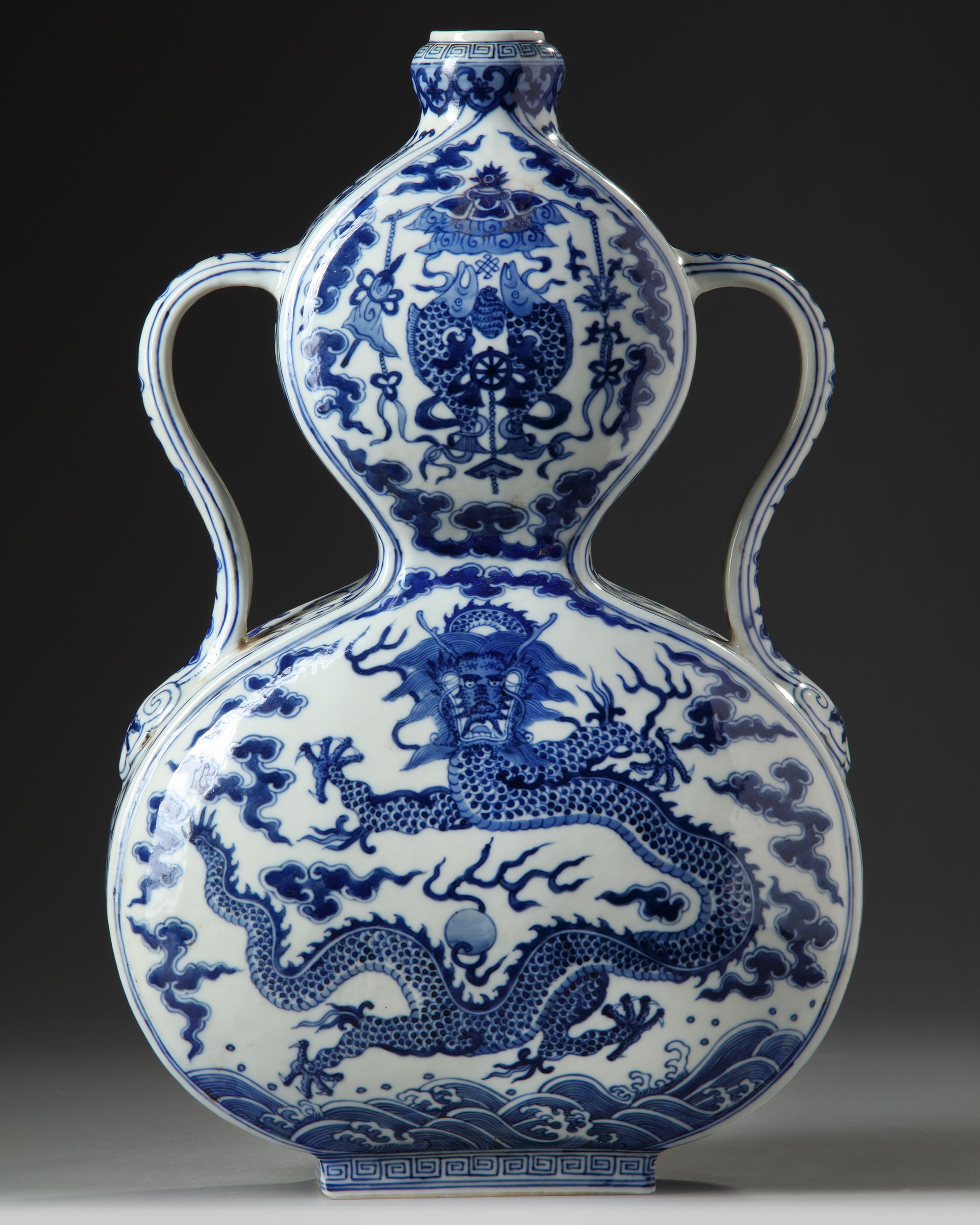 A Chinese double gourd moon flask fashioned with two ruyi shaped handles. Decorated in iron-red with five-clawed dragons and twin-fish with precious objects amongst clouds. The narrow sides with lotus scrolls with key fret chain to the base. The bottom with a Chinese Qianlong seal mark.