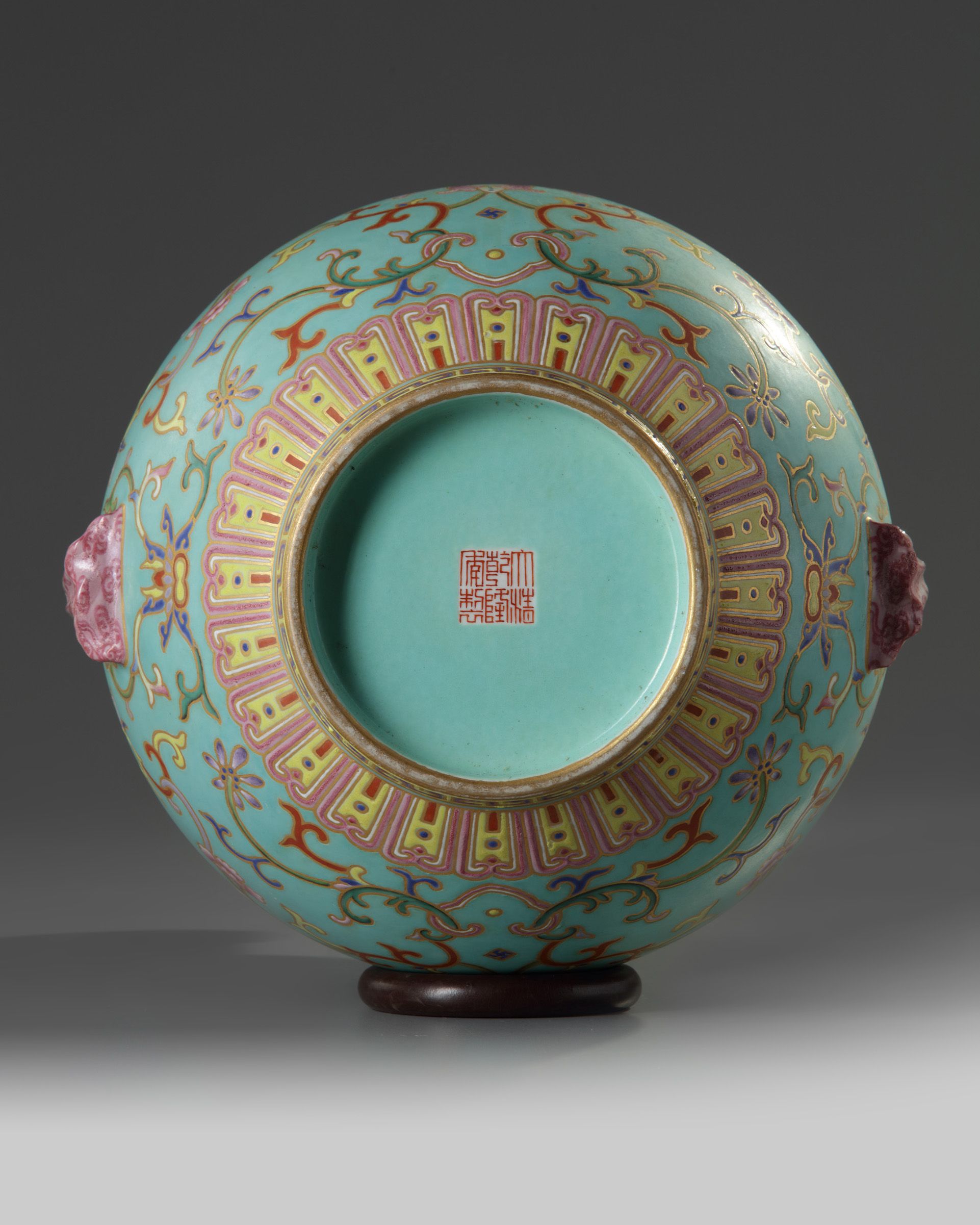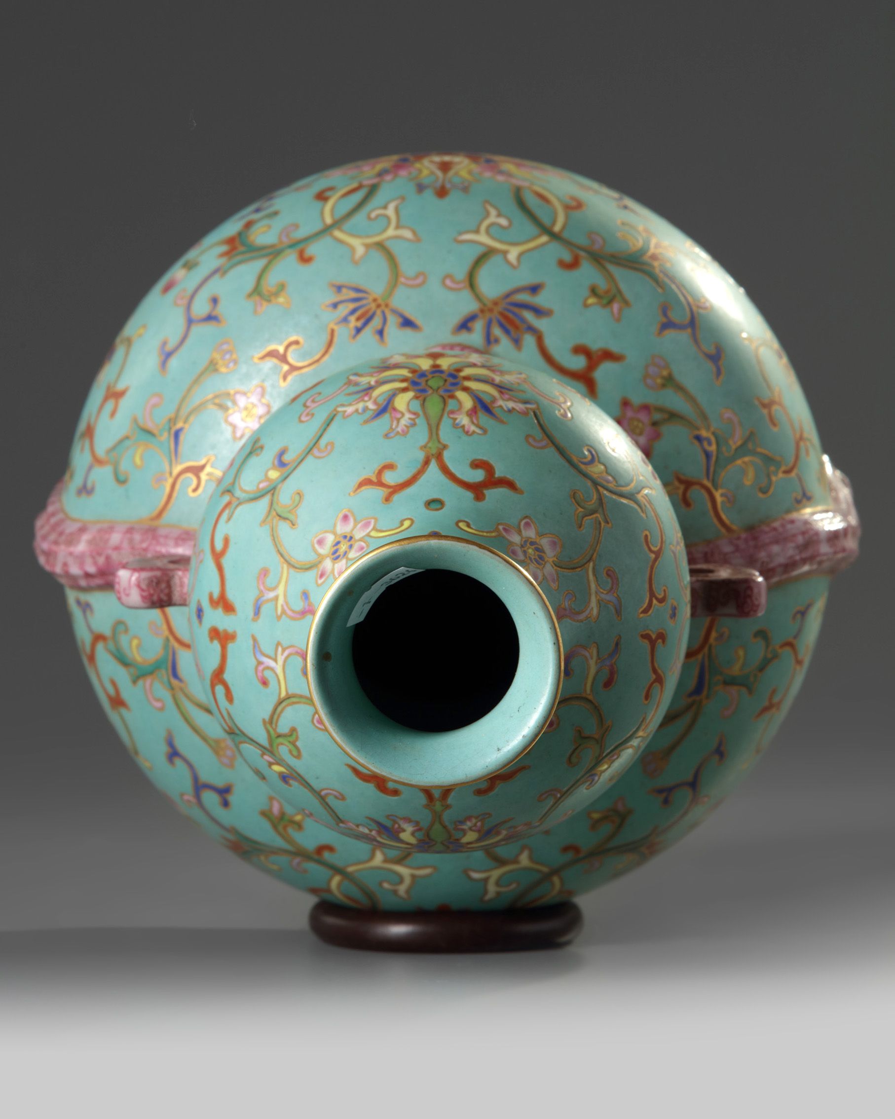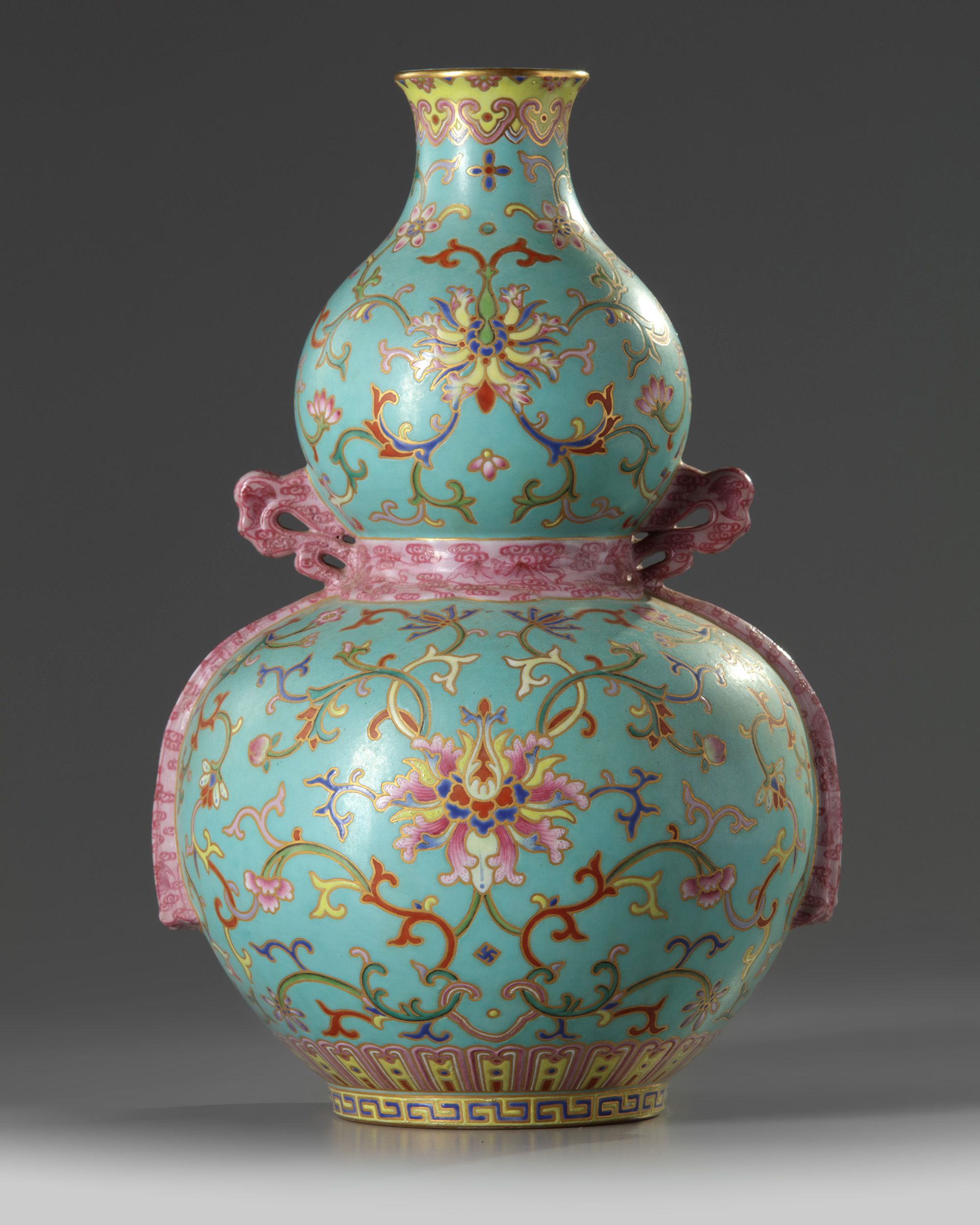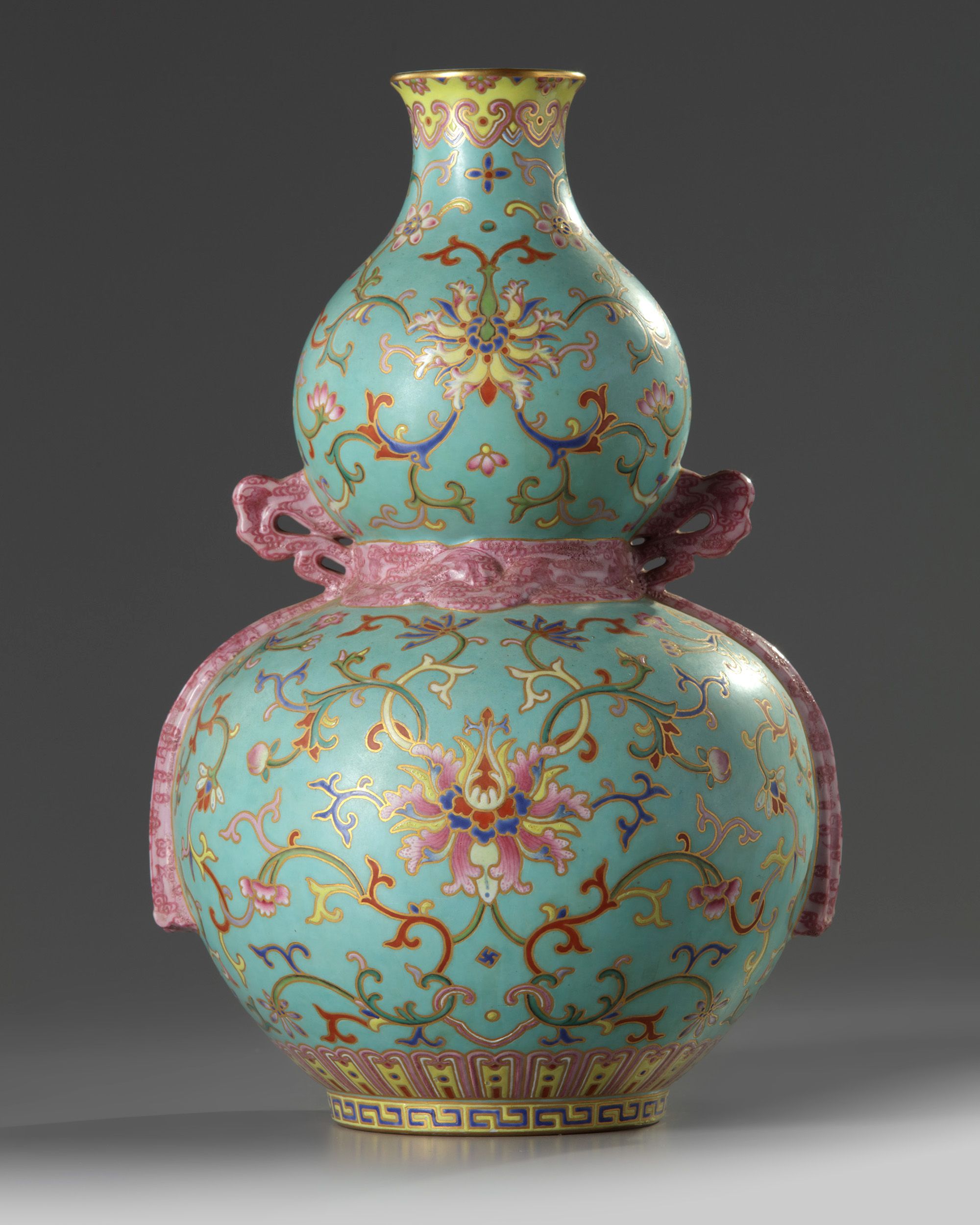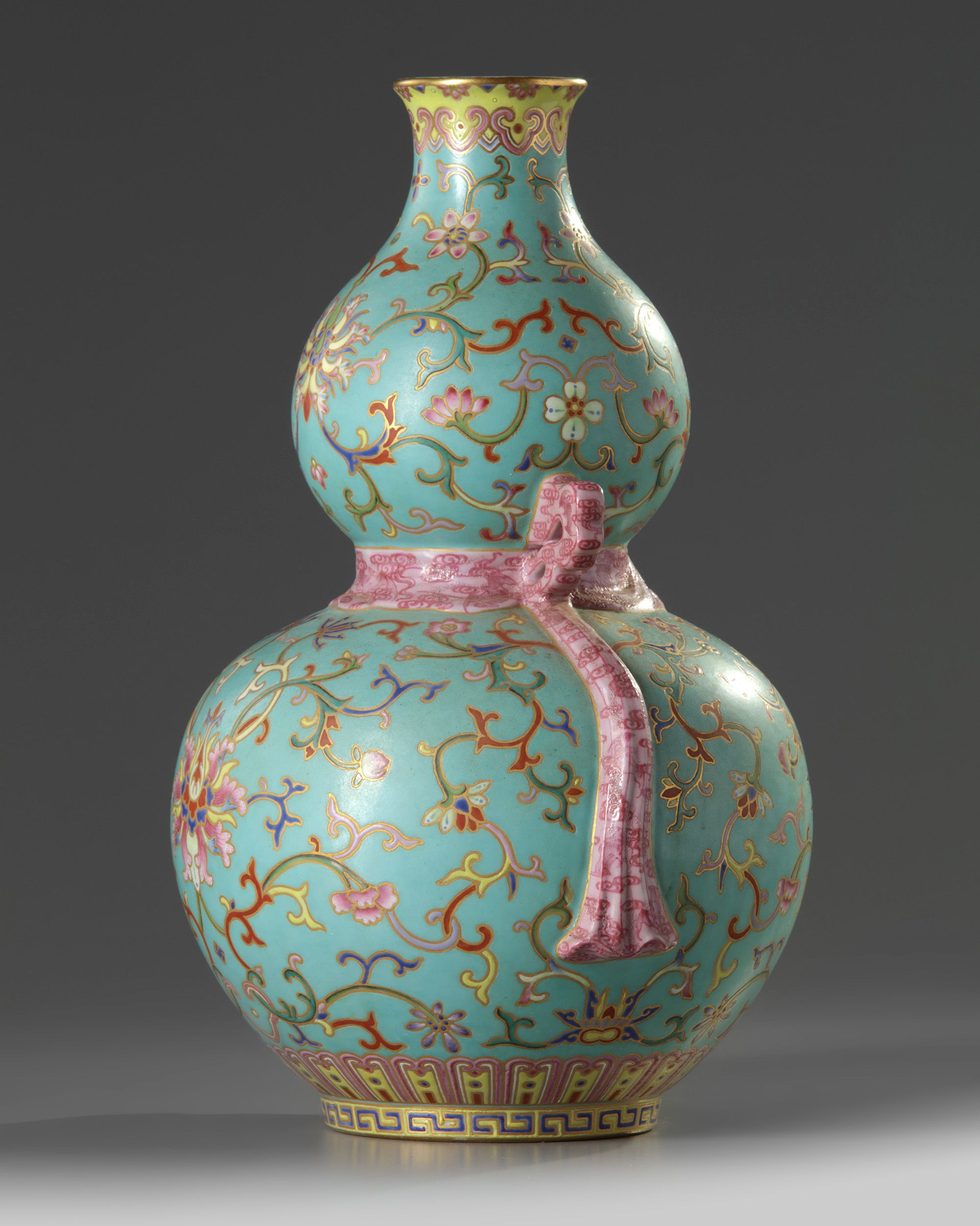 The vase is boldly decorated and gilt with two registers of scrolling lotus, separated by a moulded pink-enamelled tied bow at the waist, all below a band of ruyi-heads at the rim and above a lappet band at the foot. The turquoise-enamelled base with an apocryphal Qianlong mark.