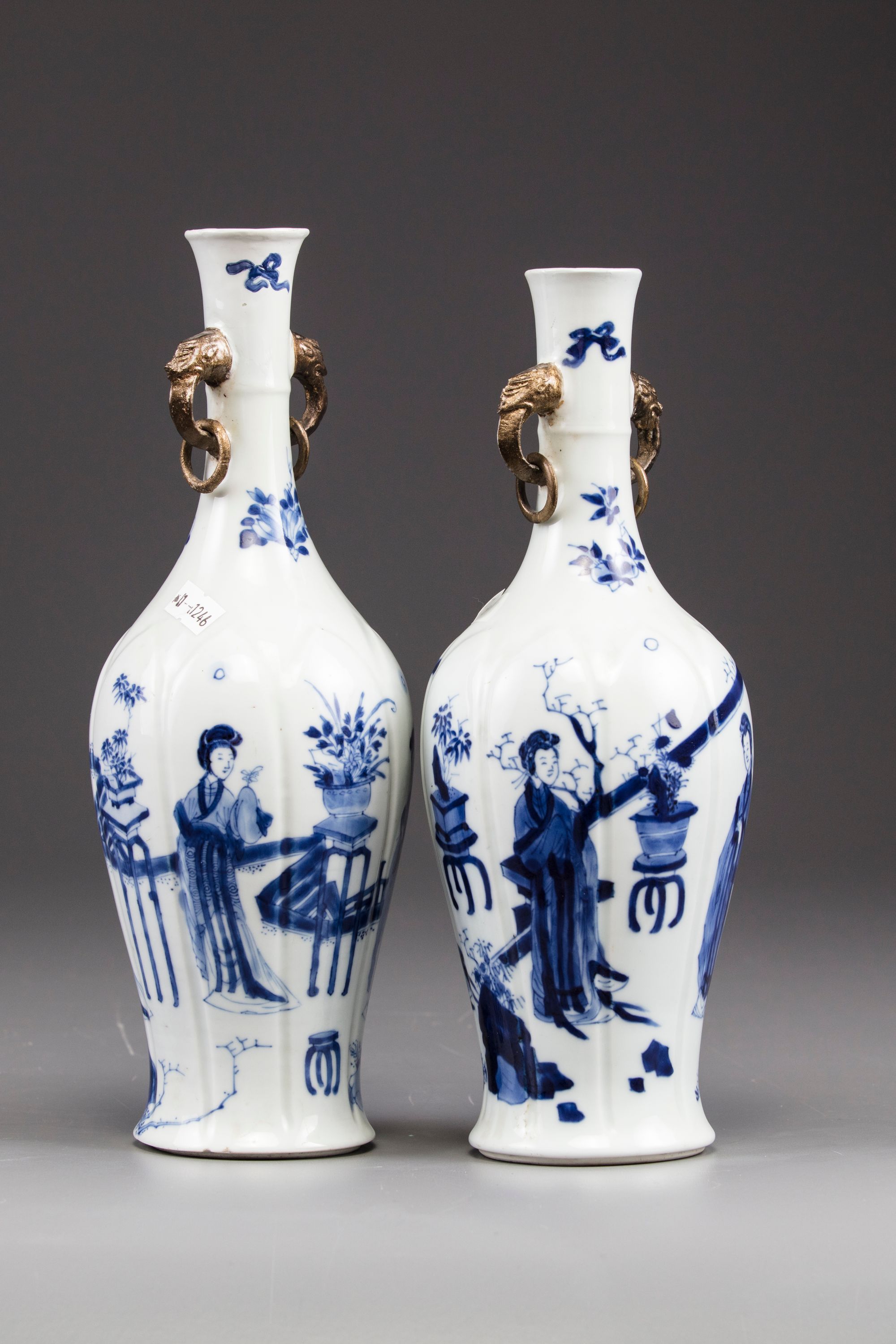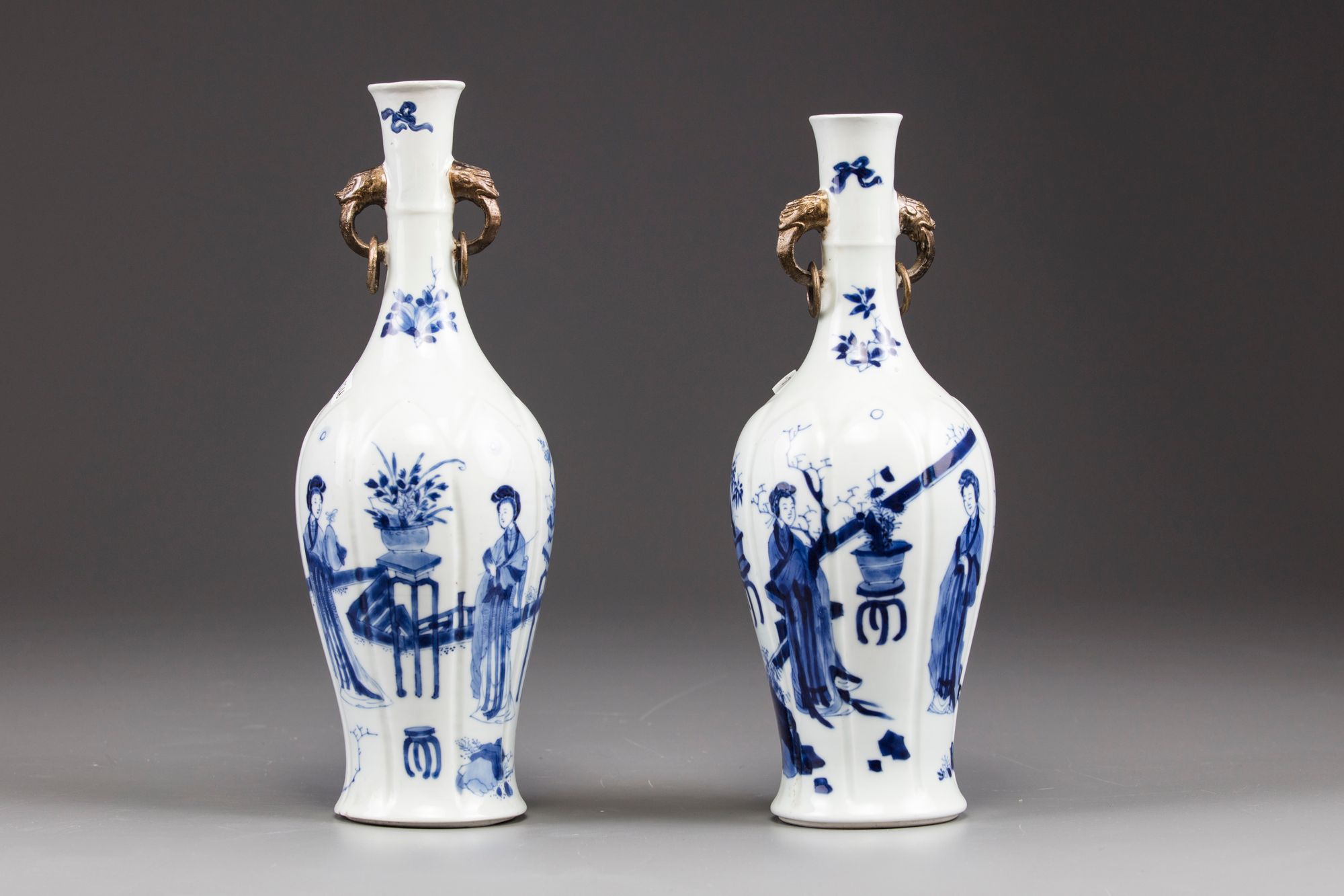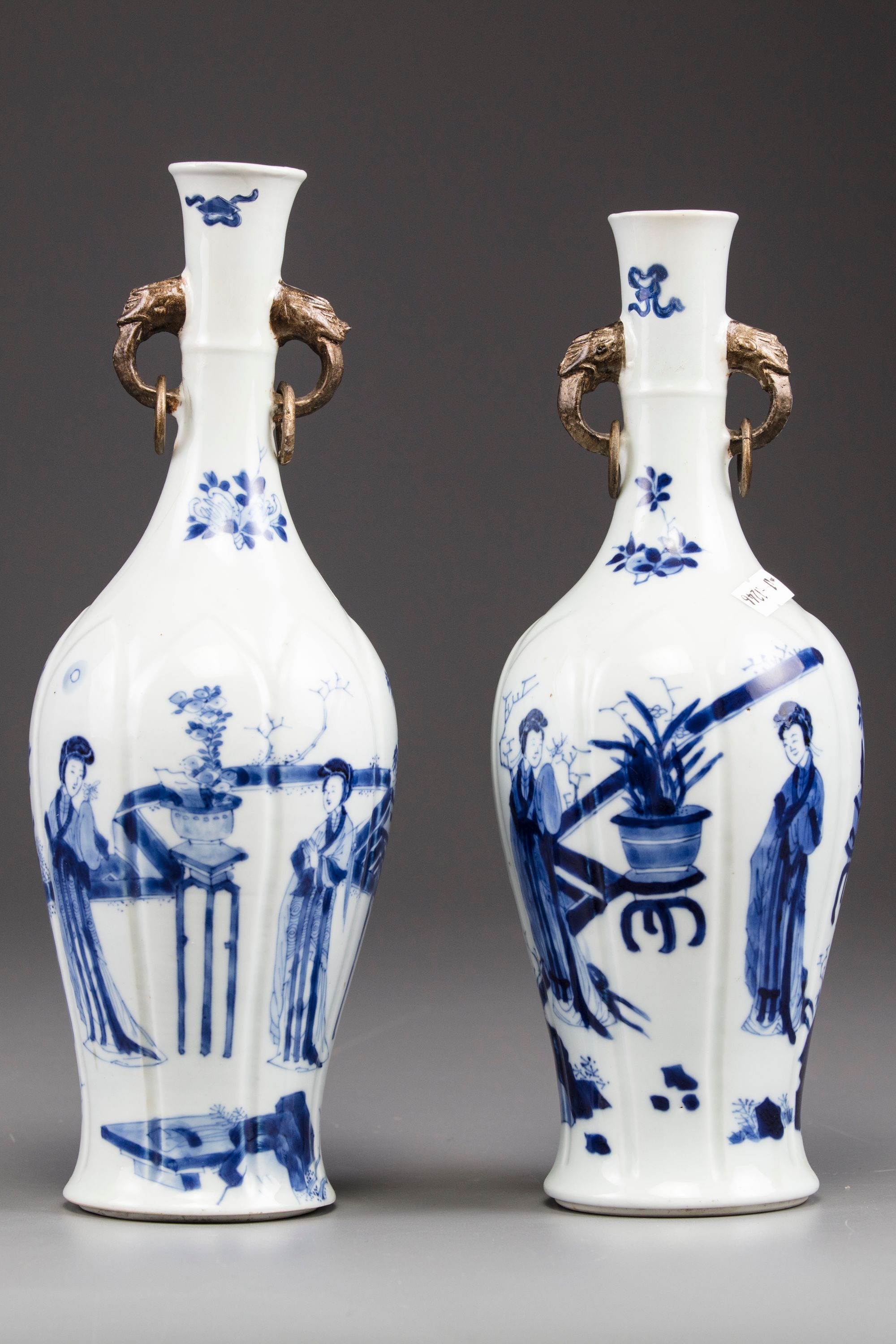 Each vase is decorated with gilt loose-ring beast-head handles to the neck, each body is moulded with upright petals and decorated with ladies with jardinieres in a fenced garden all below scattered flowers and precious objects. Each base with an artemisia leaf.