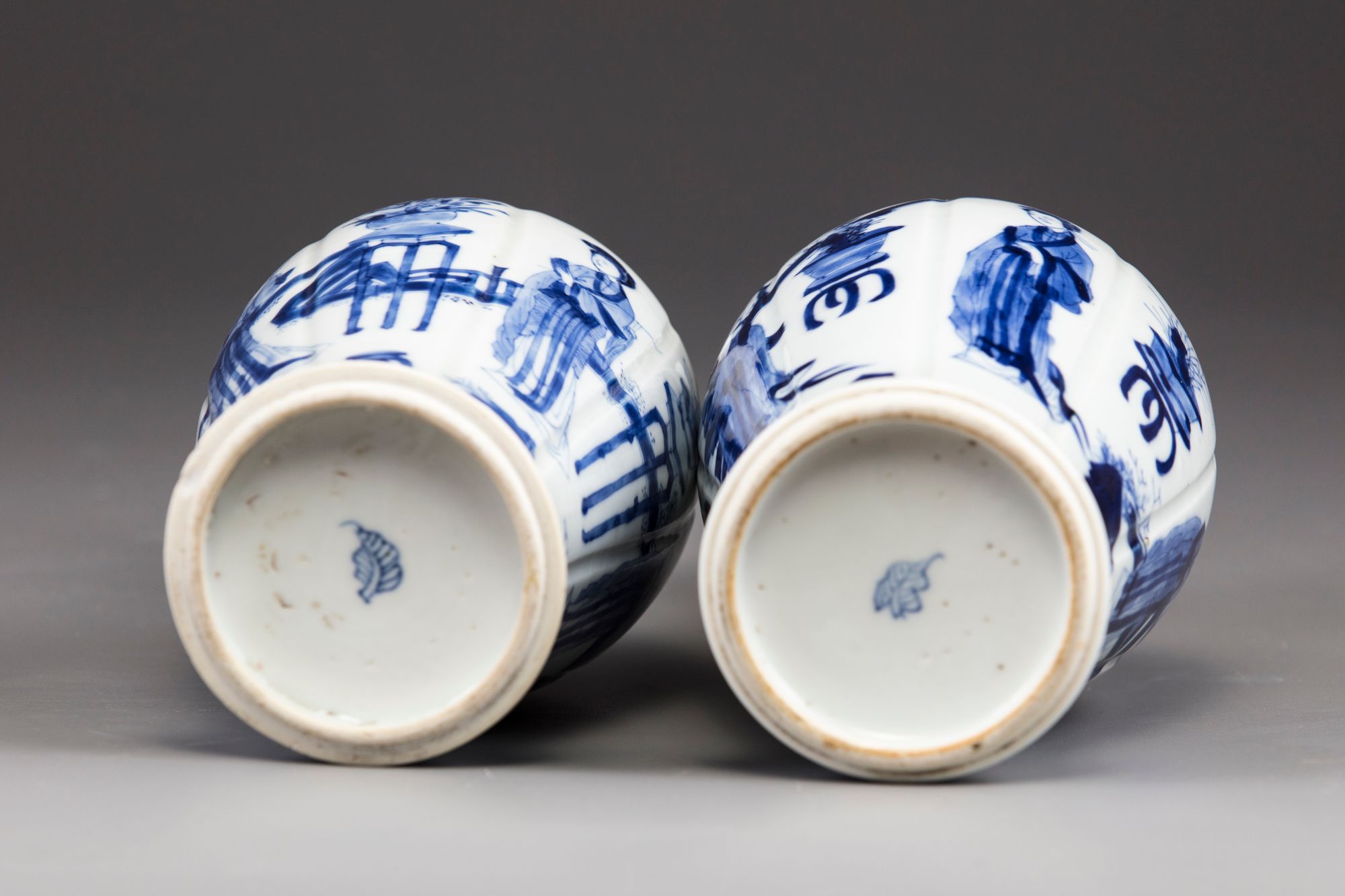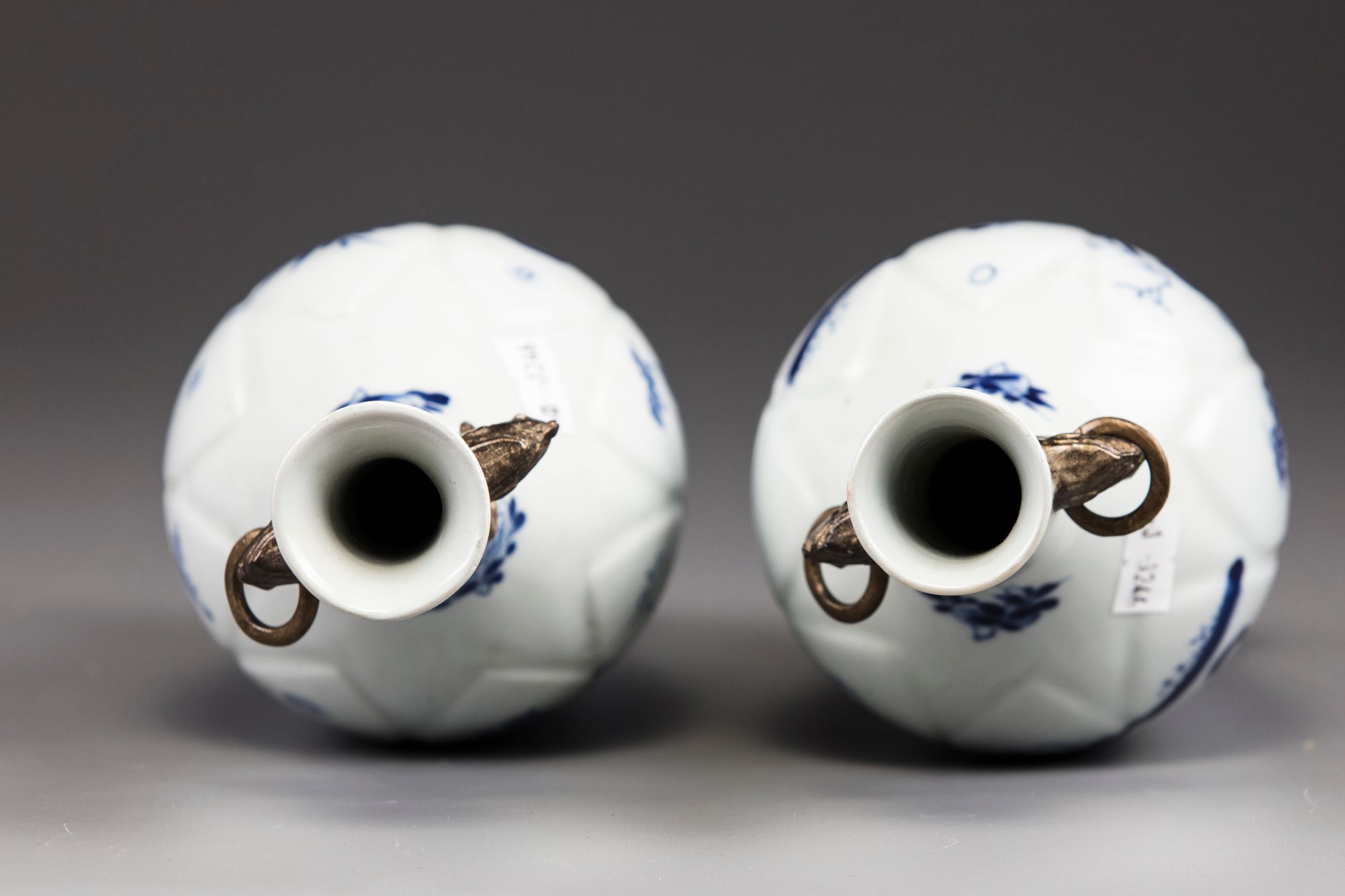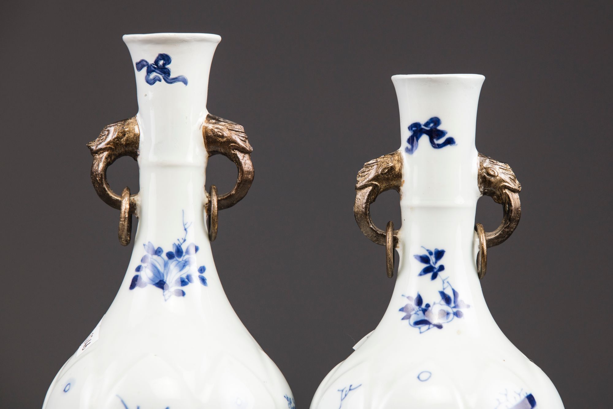 Each vase is decorated with gilt loose-ring beast-head handles to the neck, each body is moulded with upright petals and decorated with ladies with jardinieres in a fenced garden all below scattered flowers and precious objects. Each base with an artemisia leaf.