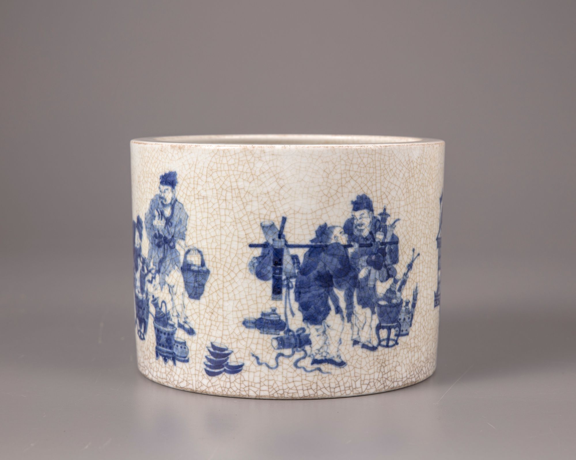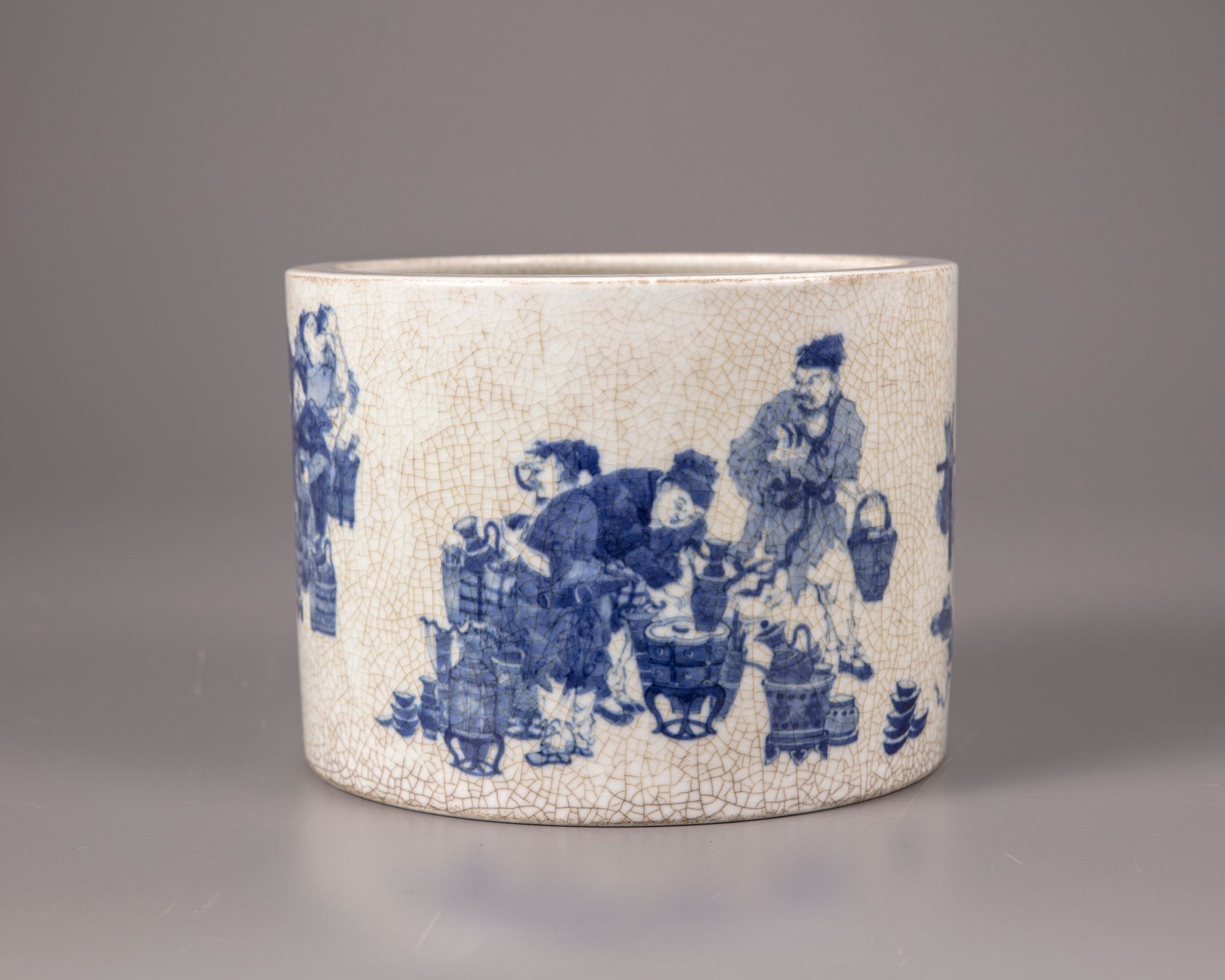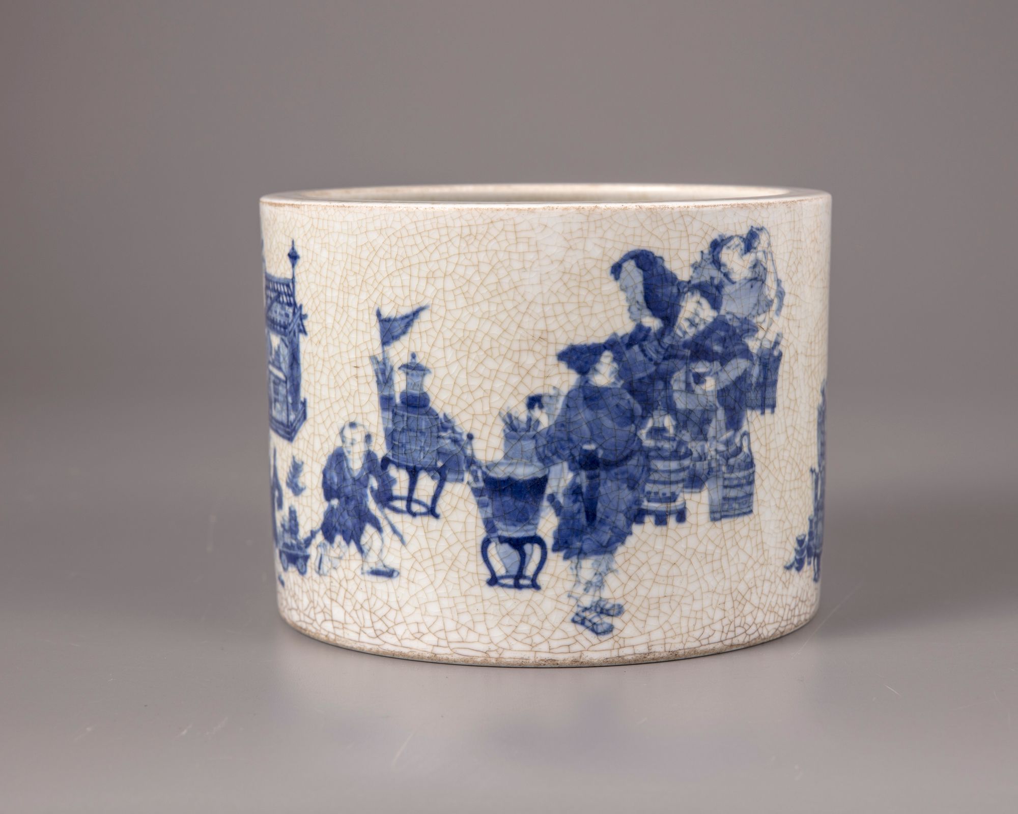 The brush pot is decorated to the exterior with various figures engaging in revelry. The base is marked with a Jingdezhen zhi seal mark in underglaze blue.