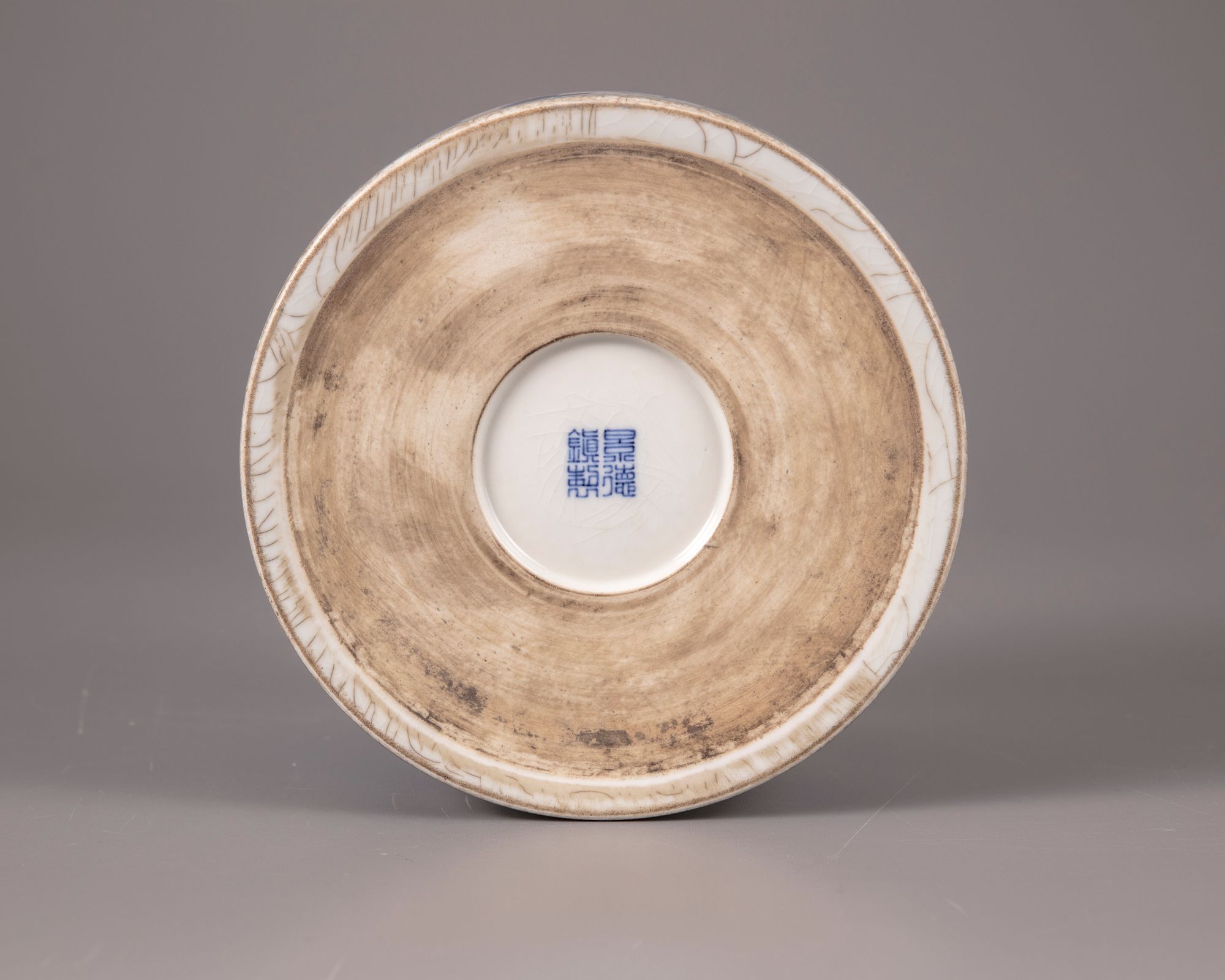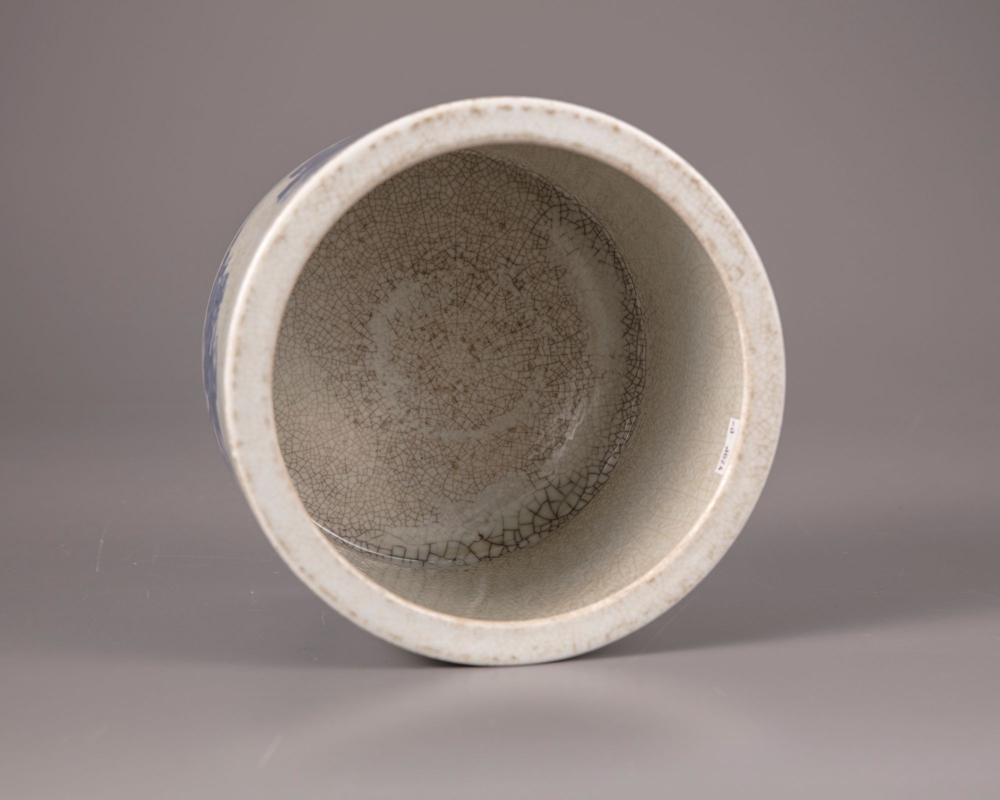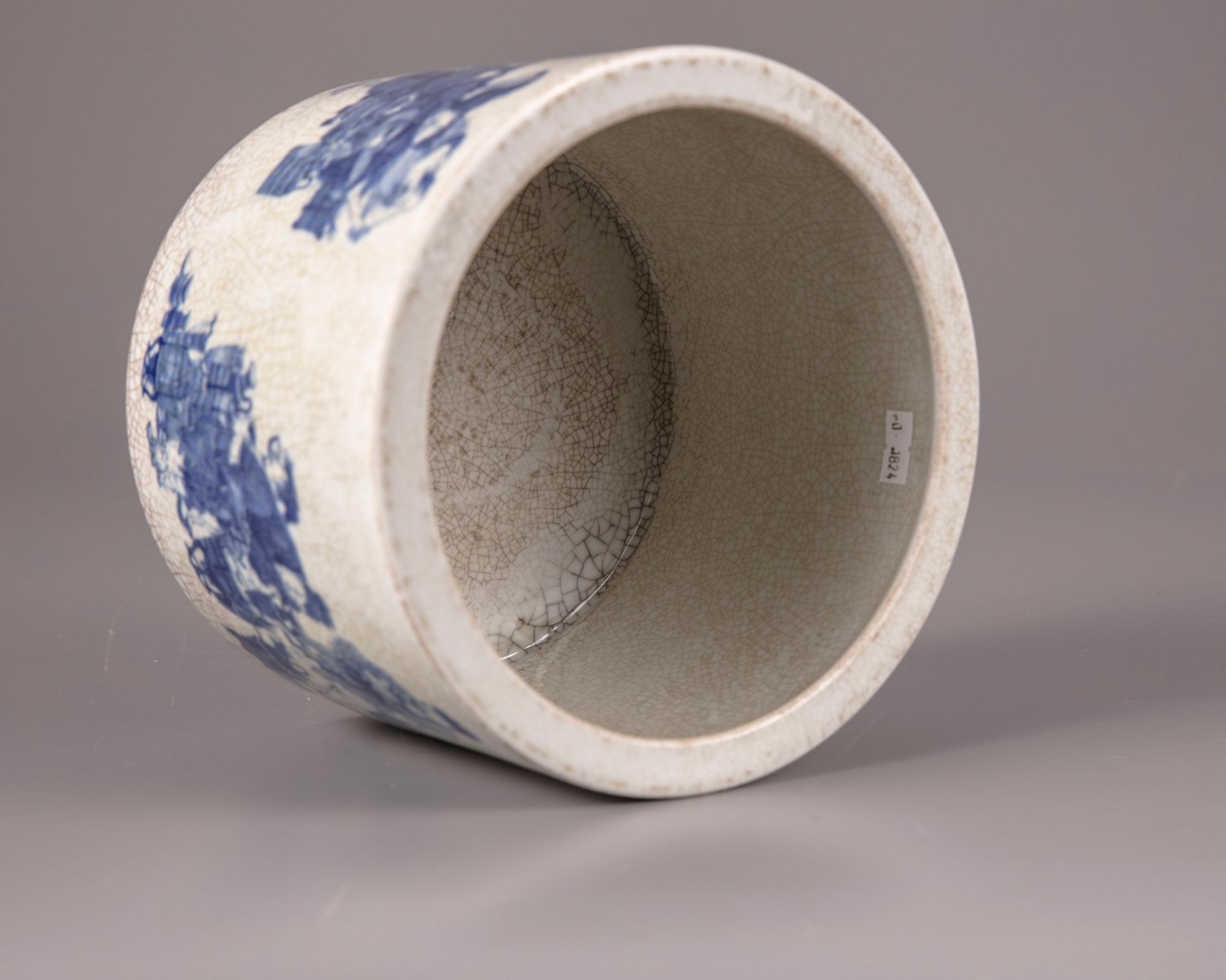 The brush pot is decorated to the exterior with various figures engaging in revelry. The base is marked with a Jingdezhen zhi seal mark in underglaze blue.
