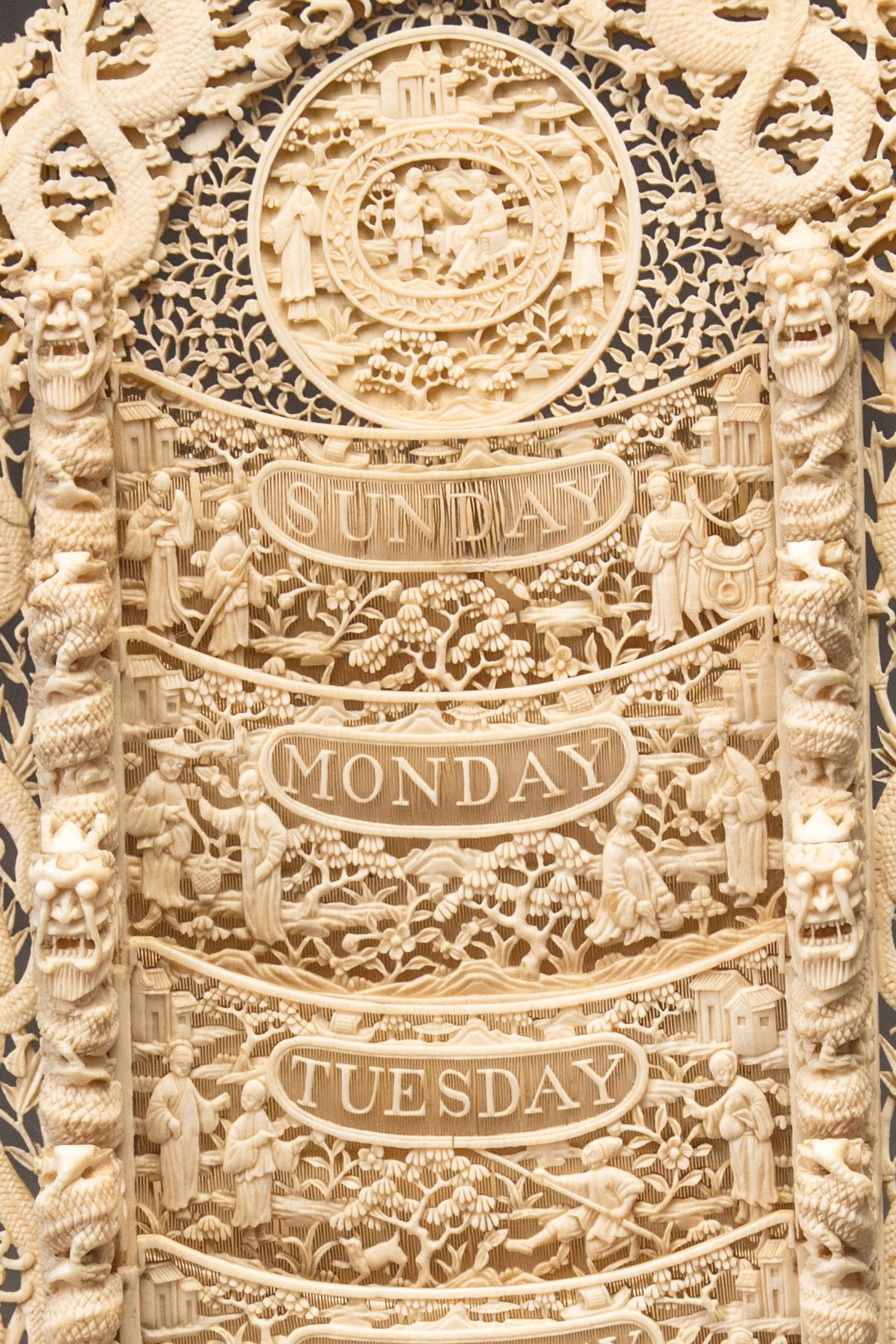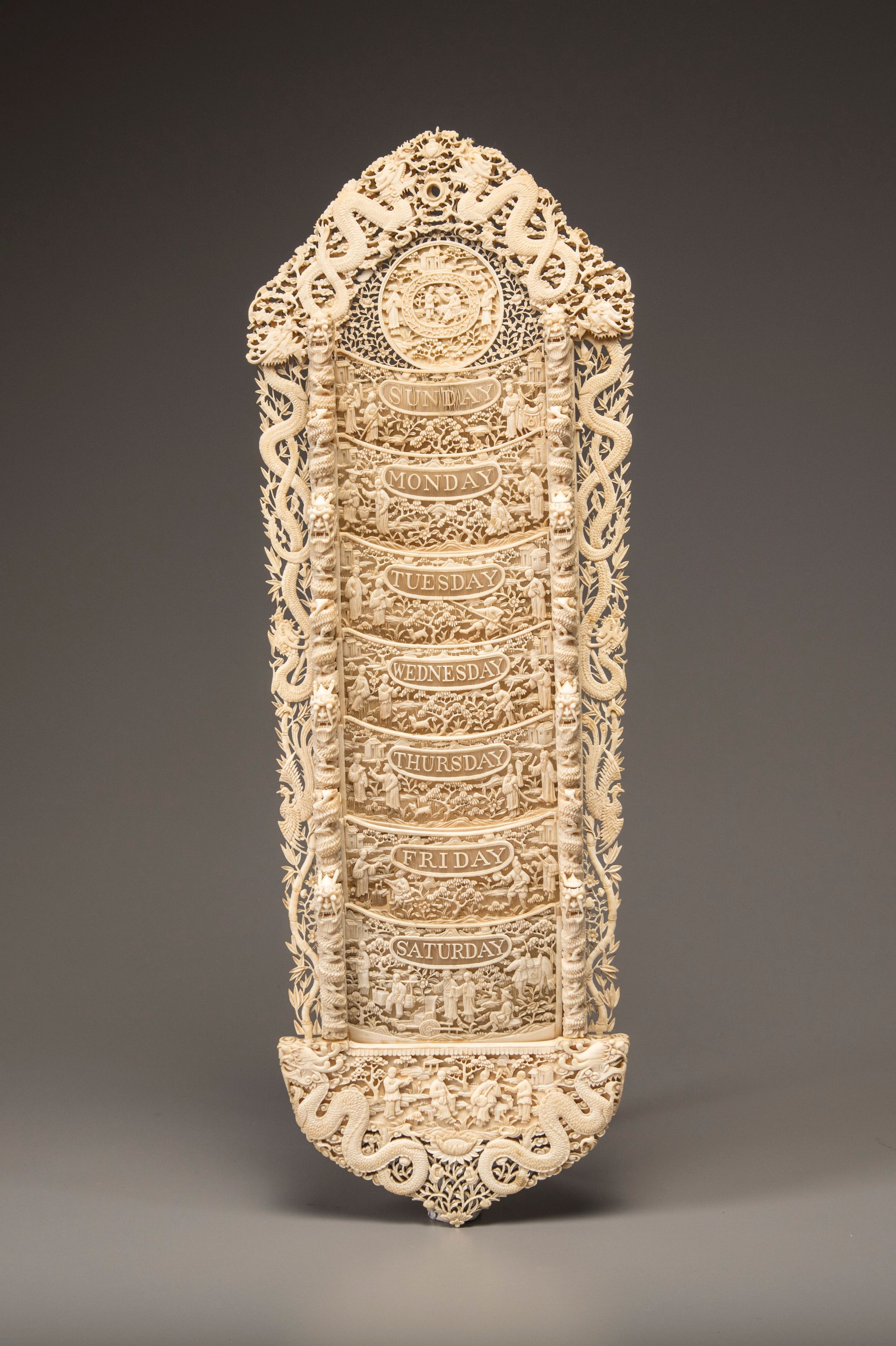 Catalogue notes: a similar Cantonese ivory letter rack without the days of the week labels were sold at Christie's London, 5 November 2013, lot 9, and a pair of letter racks were sold at Christie's South Kensington, 16 May 2012, lot 642.