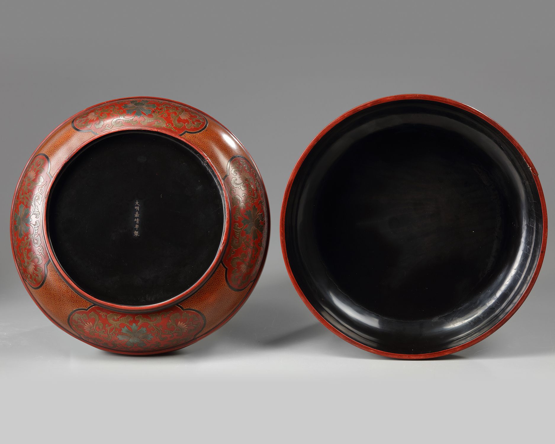 The box is decorated with two confronting dragons with hardstones and mother of pearl chasing the flaming pearl above waves and rocks. The sides of the cover and box base are decorated with shaped panels enclosing flower scrolls, all reserved on a geometric ground. The interior and base is lacquered black. the base with an apocryphal Jiajing mark.