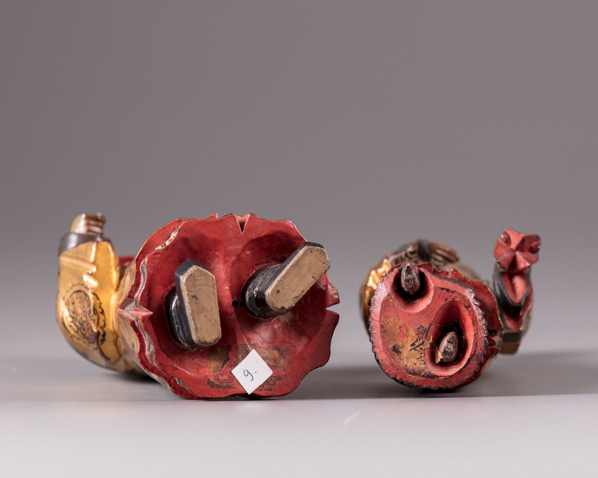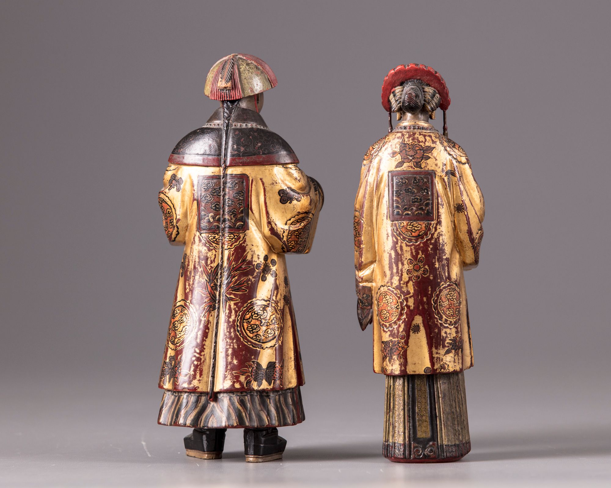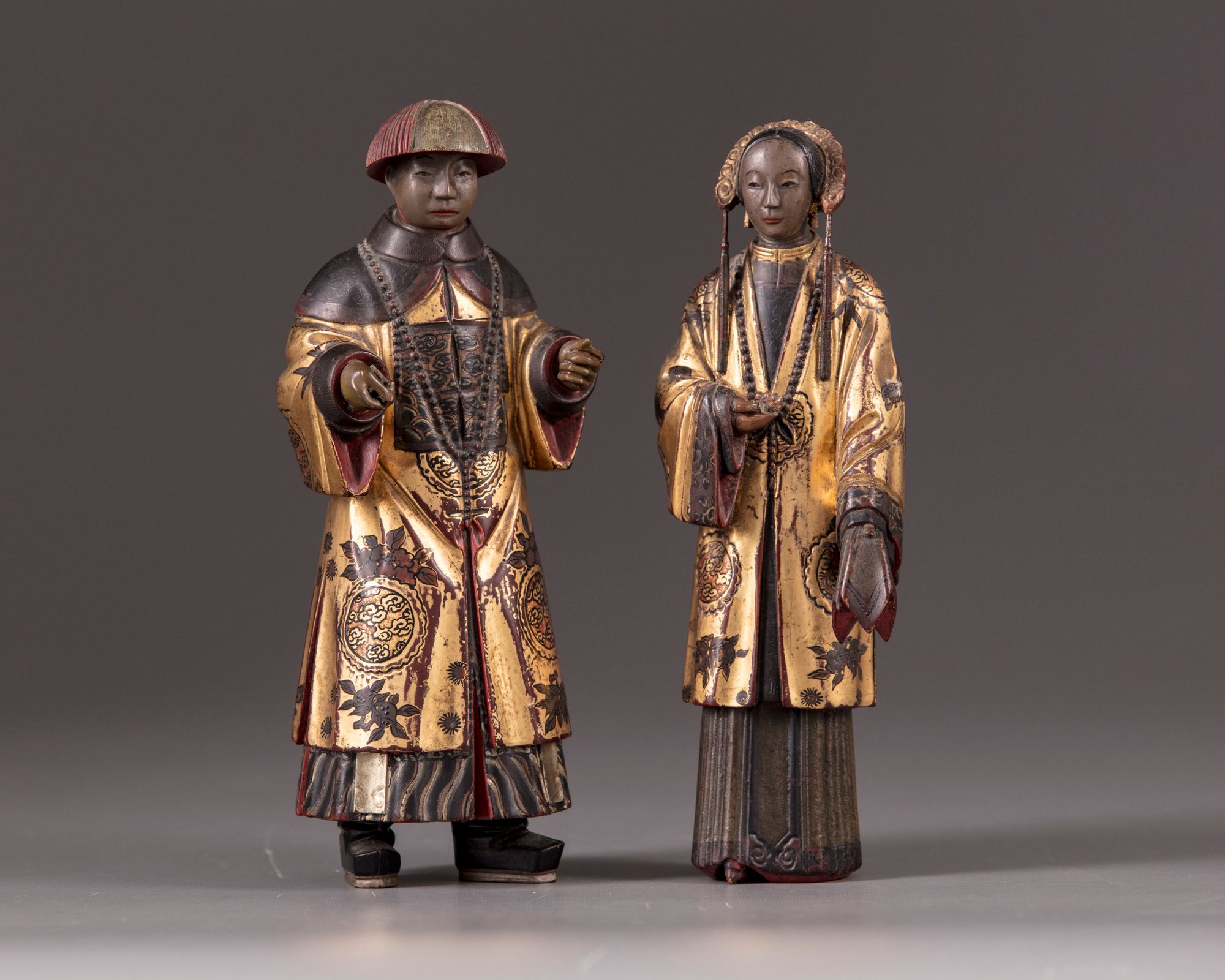 Two standing figures of wood, decorated and gilt to the robe with roundels containing foliage and flower scrolls.