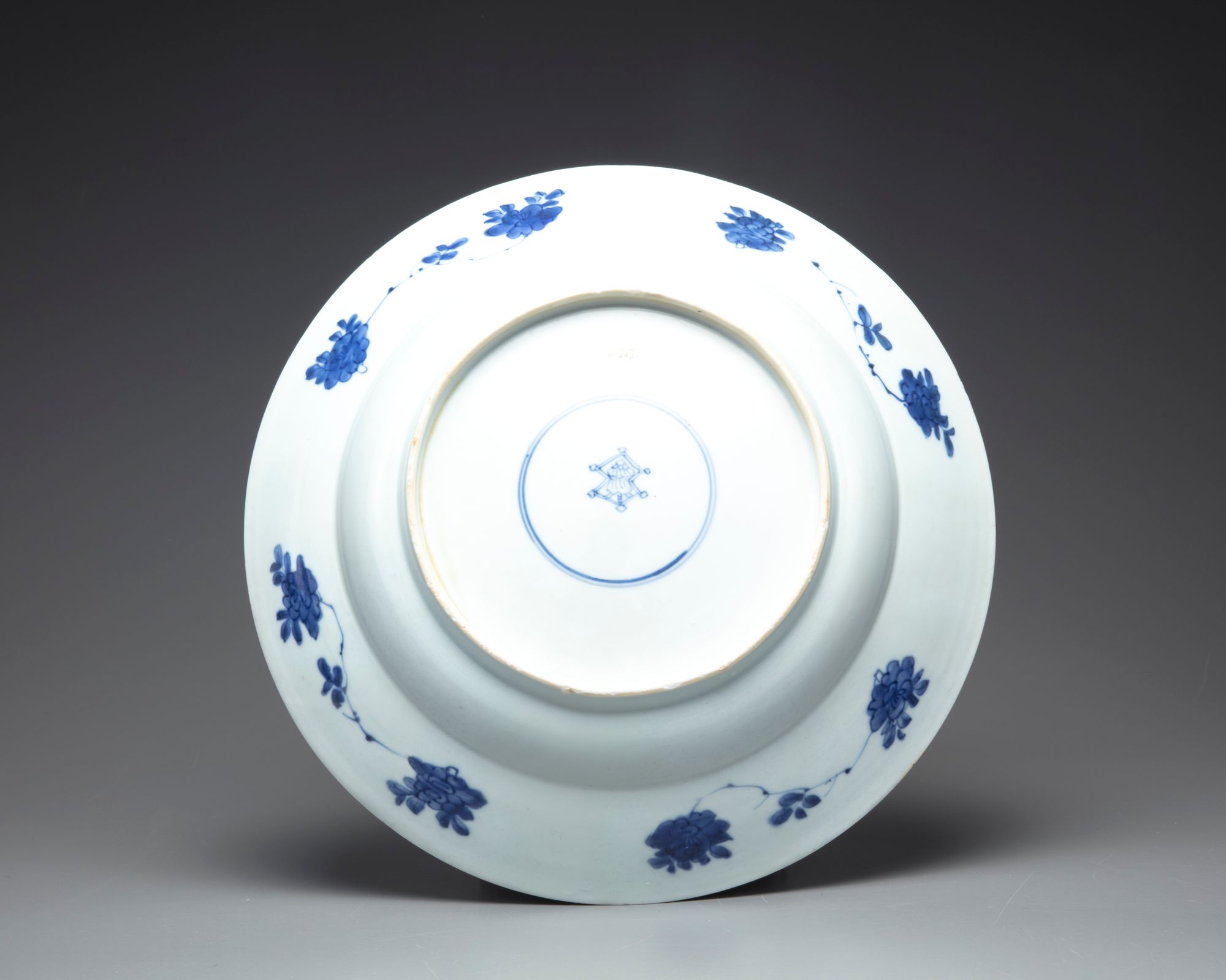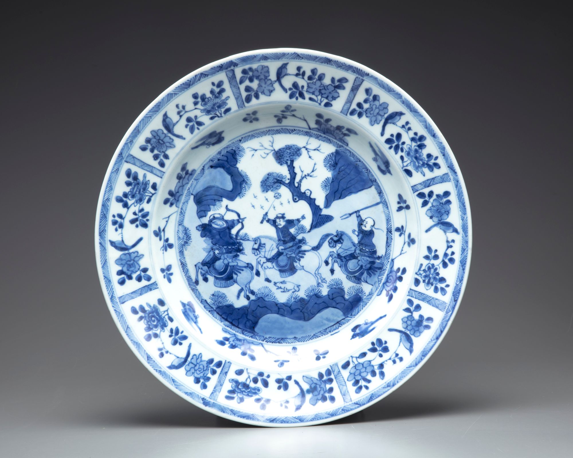 The dish is decorated to the centre with three figures on horseback, each bearing a different weapon, amongst trees and rocks. The panel is surrounded by birds in flight and flower sprays, and the rim is decorated with further bird and flower panels. The reverse is decorated with flower sprays and the base with a parasol enclosed by a precious object within a double circle.