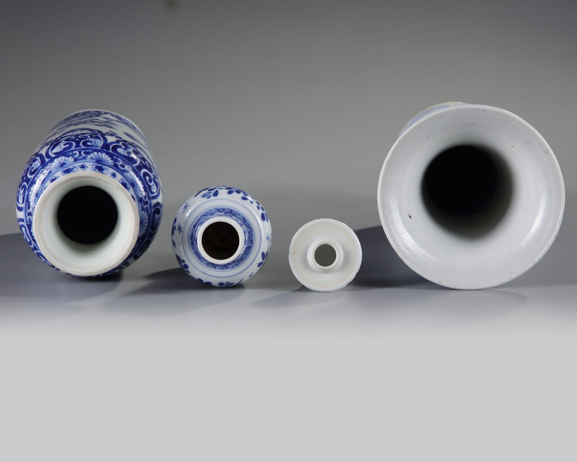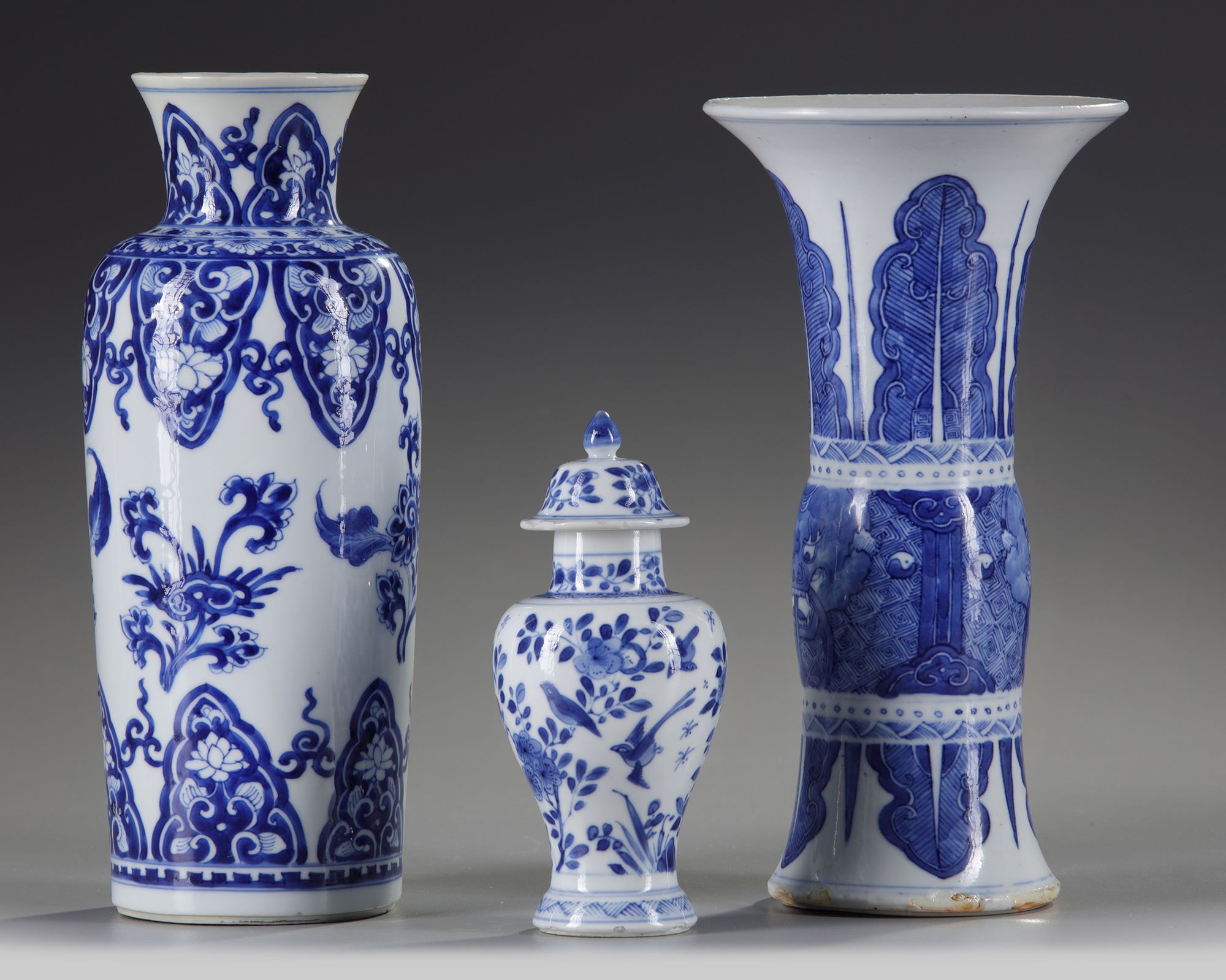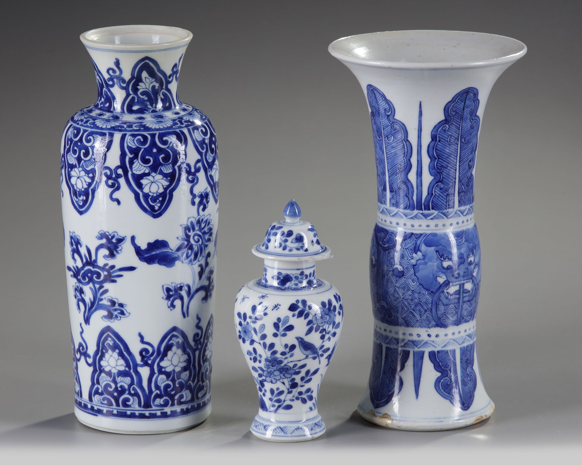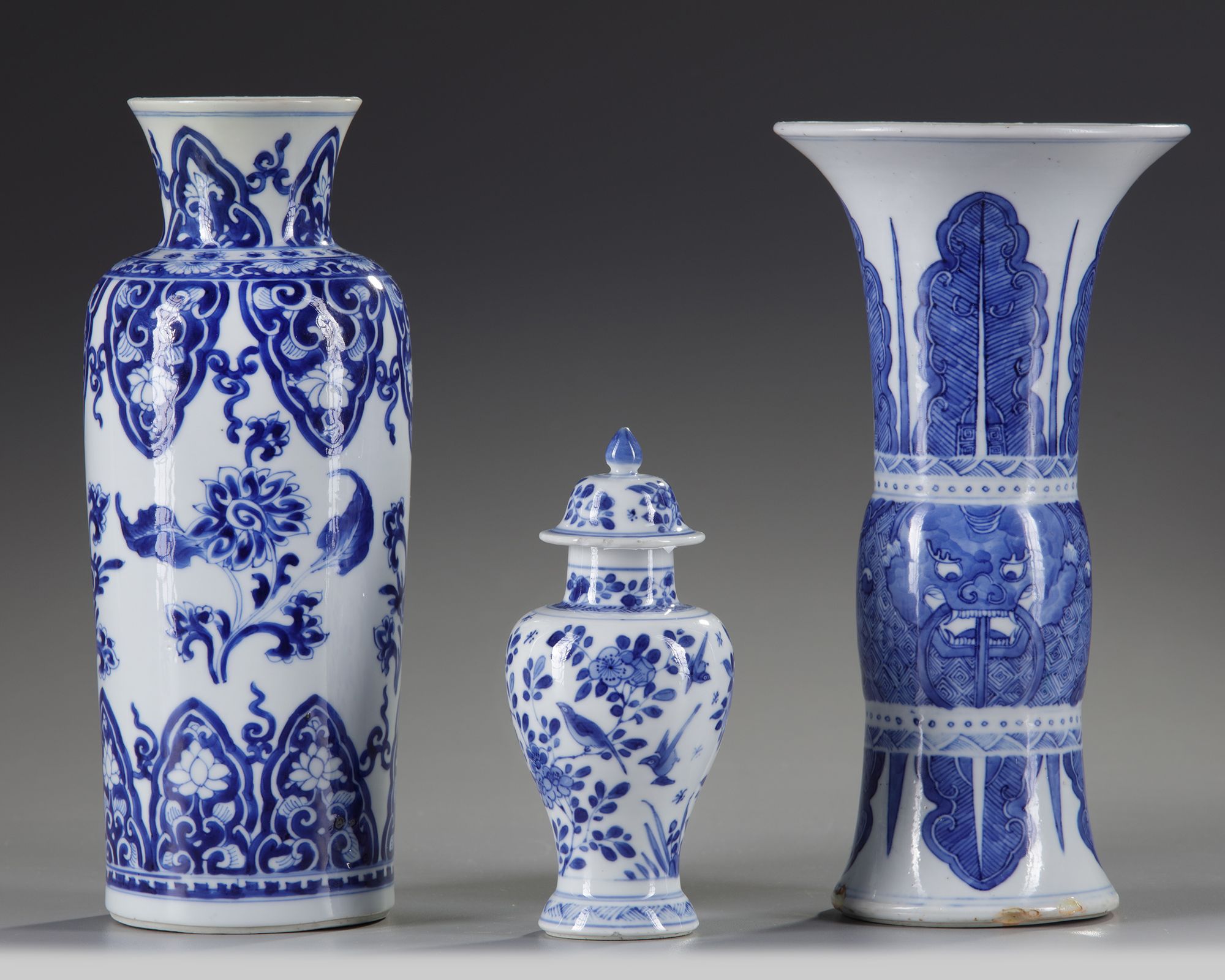 The group comprises: a tubular vase with a slender flaring neck decorated to the body with scattered lingzhi and flowers between bands of lappets, a small baluster vase and cover decorated with scattered birds and flowers, and a gu vase decorated with a beast mask to the central band and stiff leaves, the base with a double circle in underglaze blue.