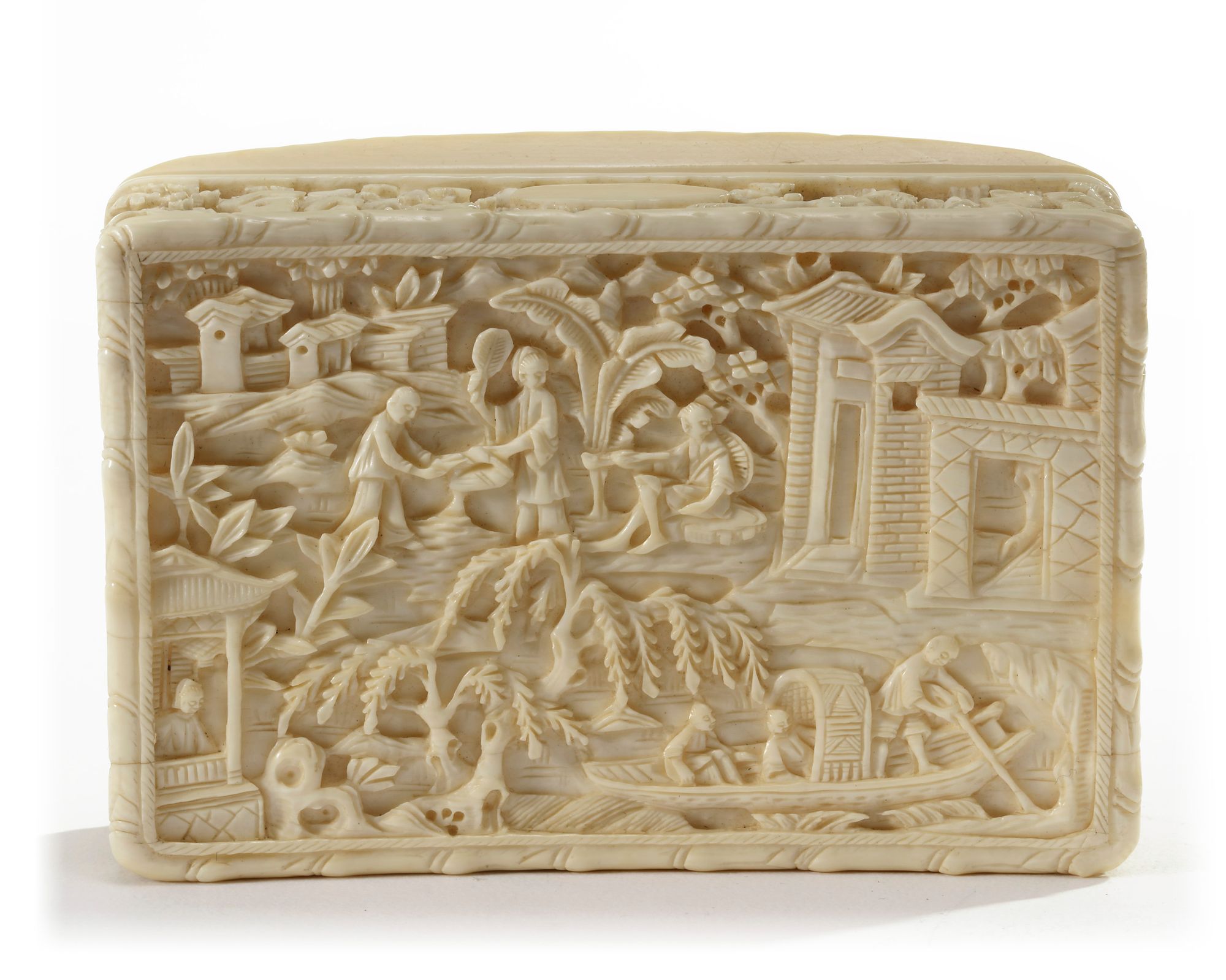 The cover is carved in detail in high relief with a well-dressed gentleman by a large country house amongst trees and cloud scrolls in a mountainous landscape, all within a flower and pomegranate border. The sides are decorated with an uncarved oval cartouche surrounded by figures amongst pavilions and trees. The base is similarly decorated.