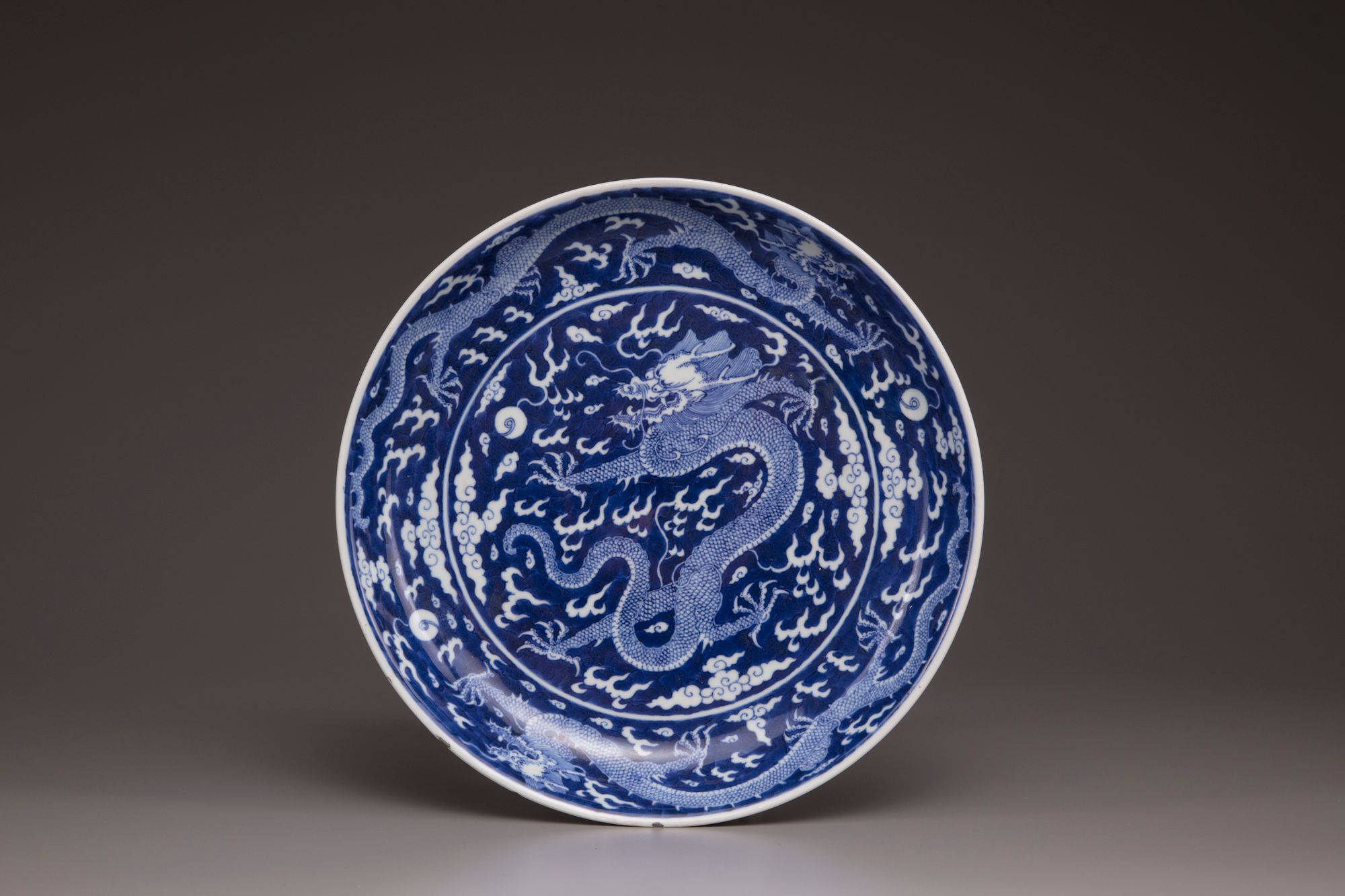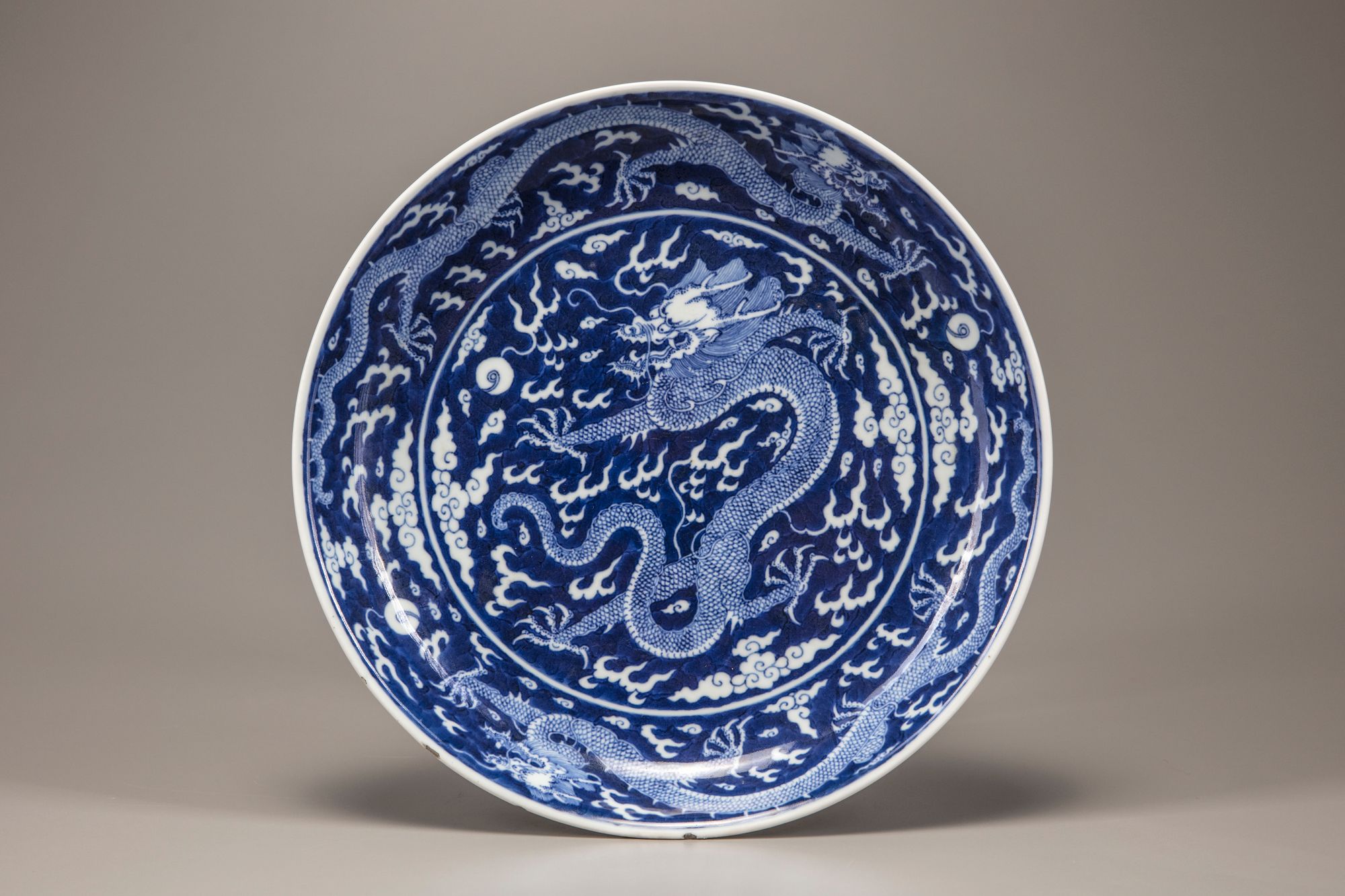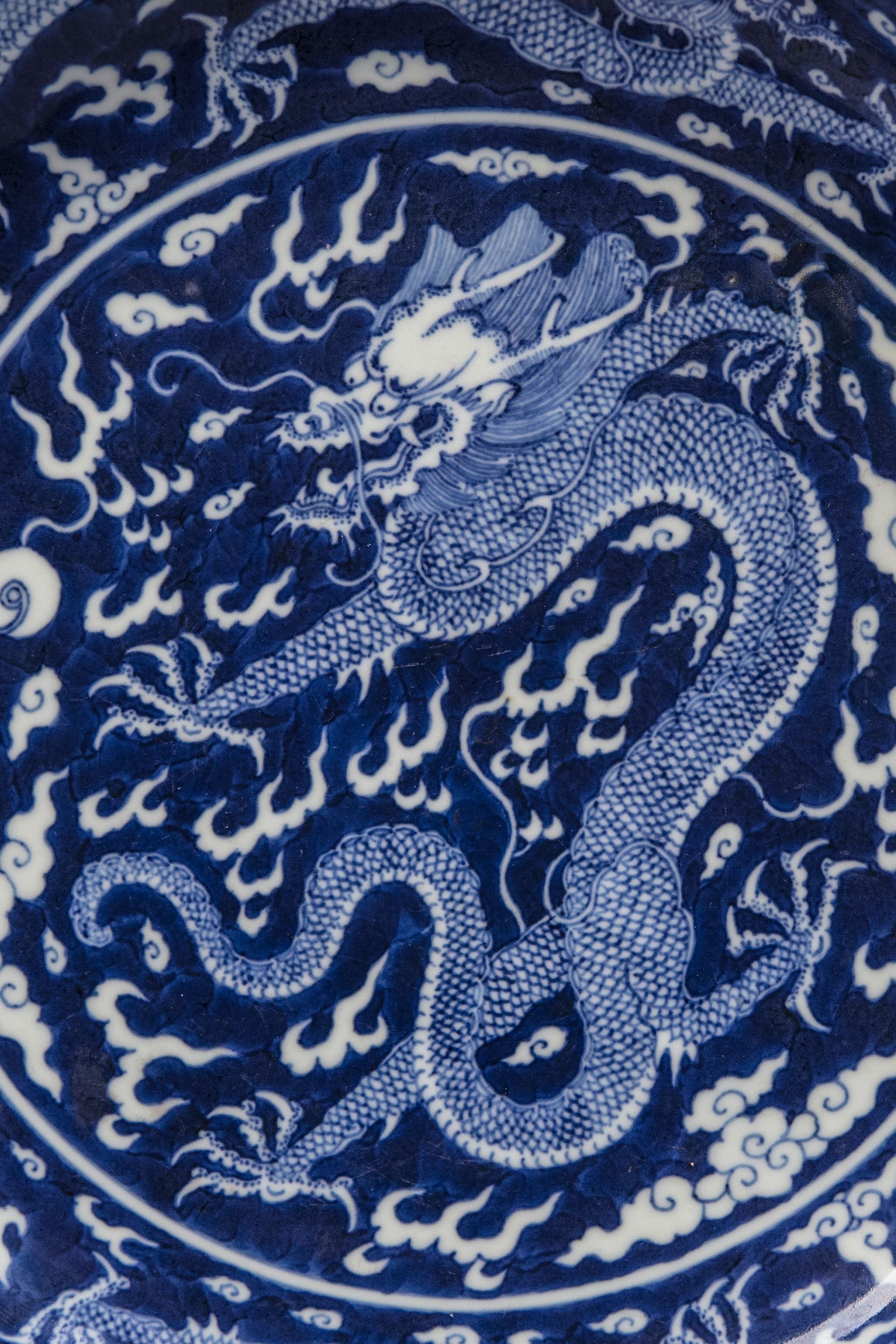 The dish is decorated in reserve with a central five-clawed dragon chasing the flaming pearl amongst fire and cloud scrolls, surrounded by two striding dragons chasing the flaming pearl, all on a cobalt blue ground. The exterior is decorated with two further striding dragons. The base with an apocryphal Qianlong seal mark.