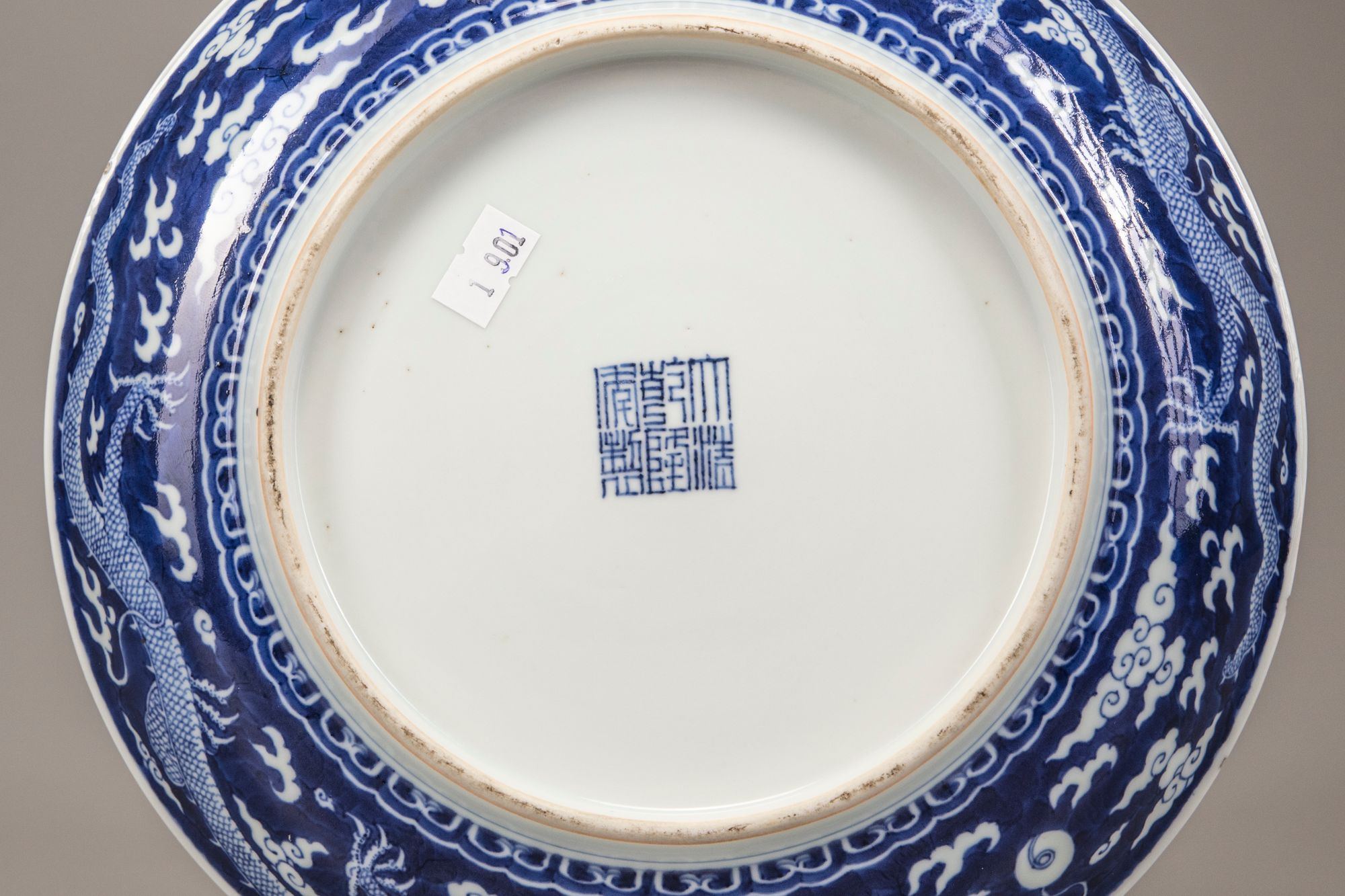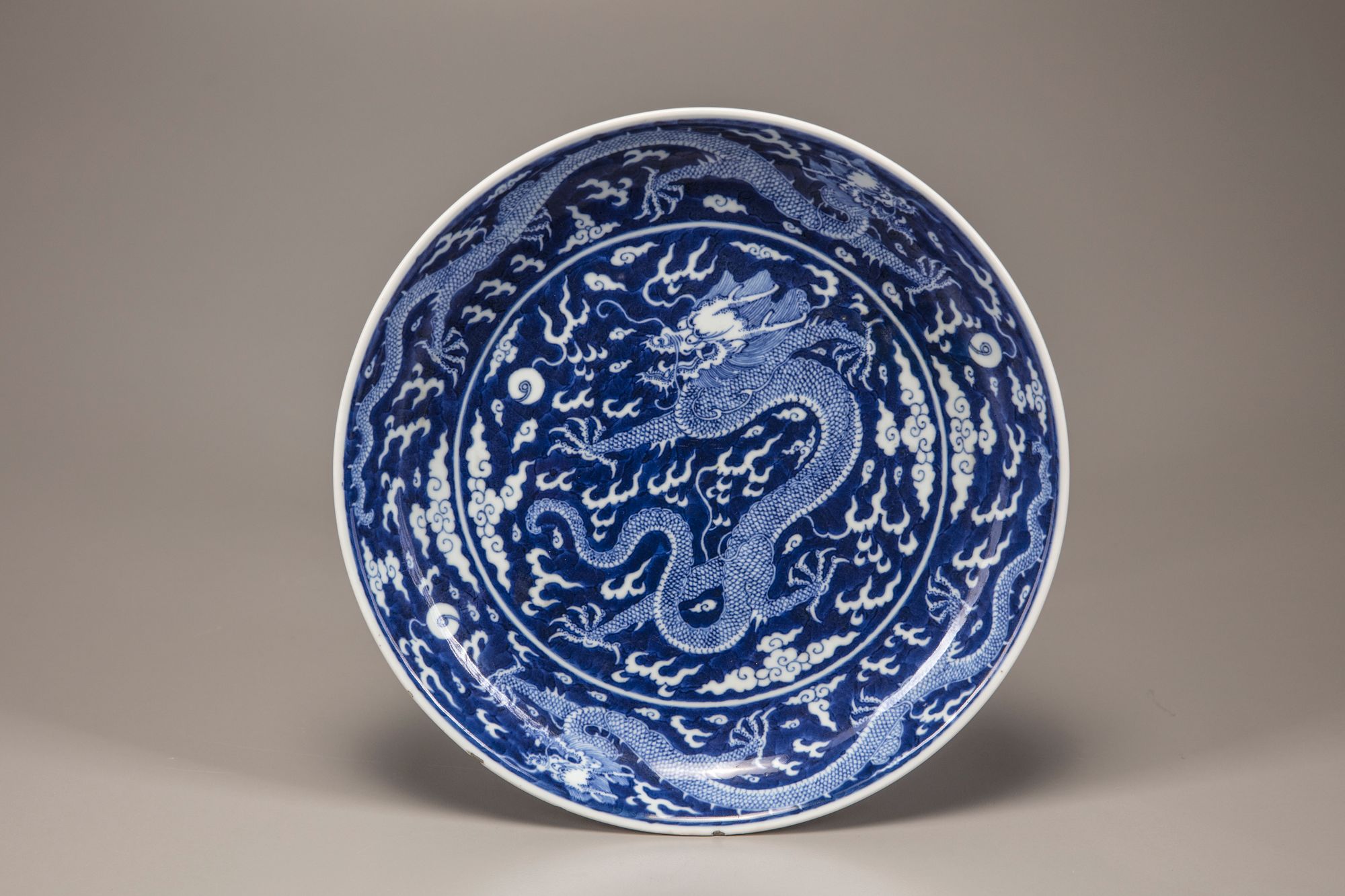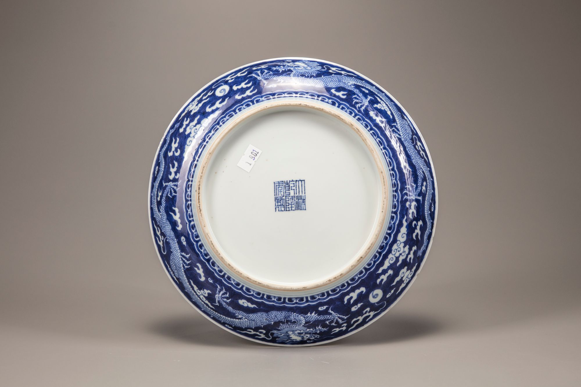 The dish is decorated in reserve with a central five-clawed dragon chasing the flaming pearl amongst fire and cloud scrolls, surrounded by two striding dragons chasing the flaming pearl, all on a cobalt blue ground. The exterior is decorated with two further striding dragons. The base with an apocryphal Qianlong seal mark.