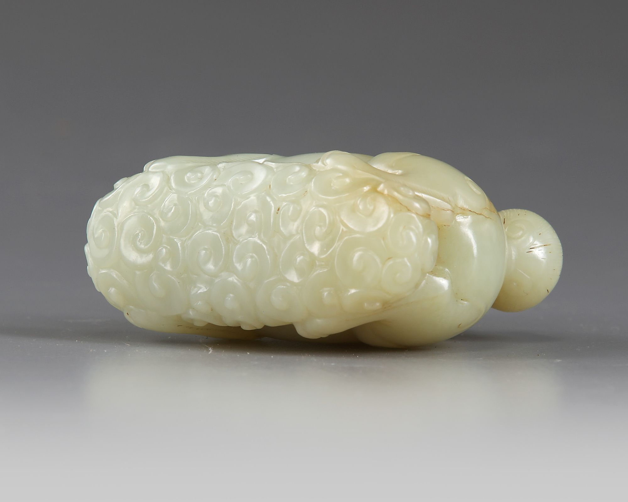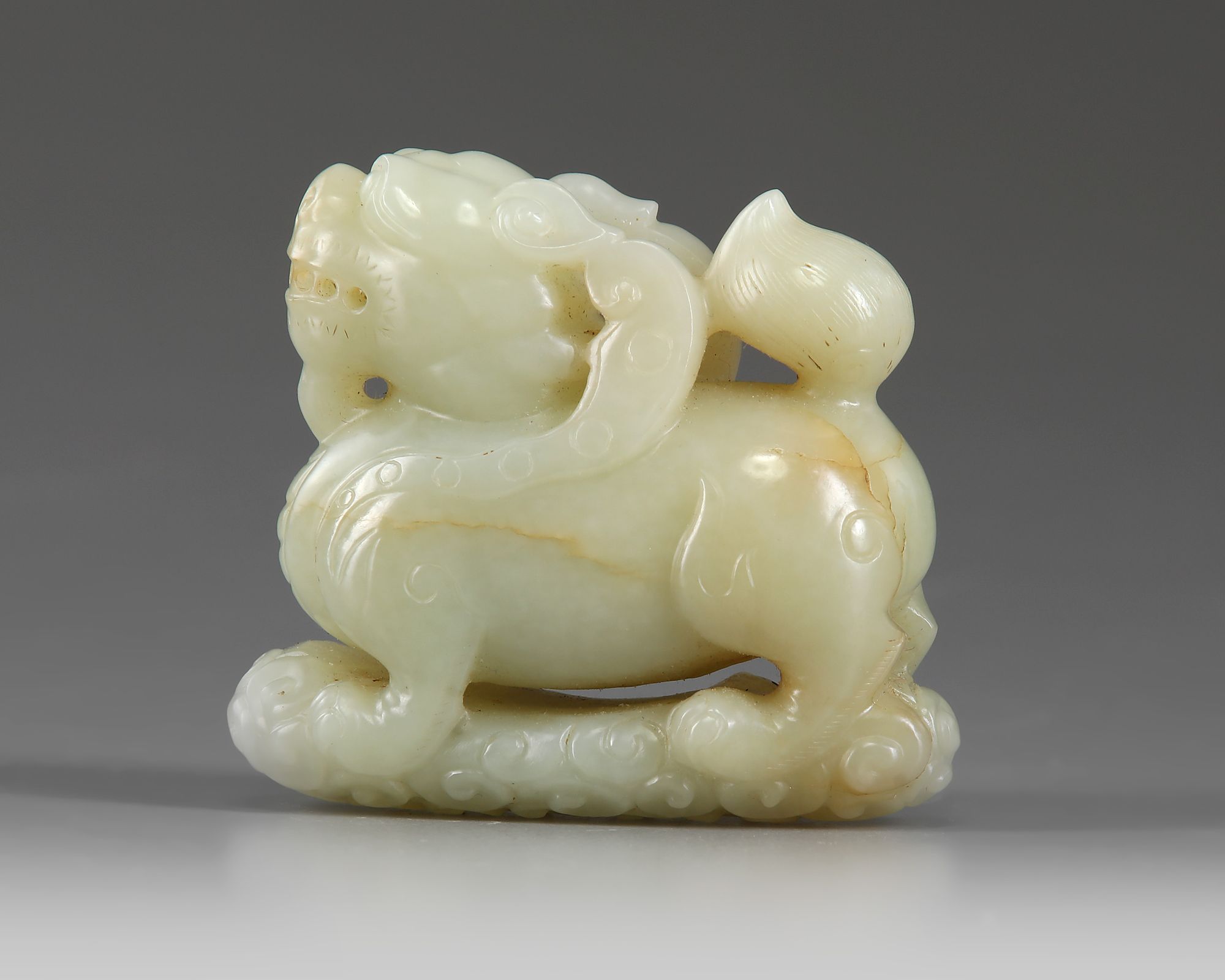 The mythical beast is carved standing foursquare with its head held proud and its tail flicked up. It stands on a carved coiling cloud base.