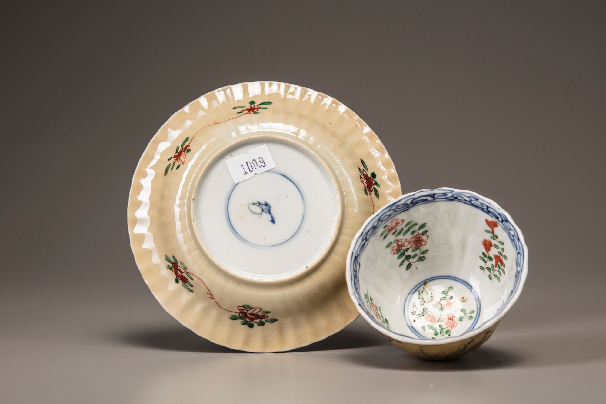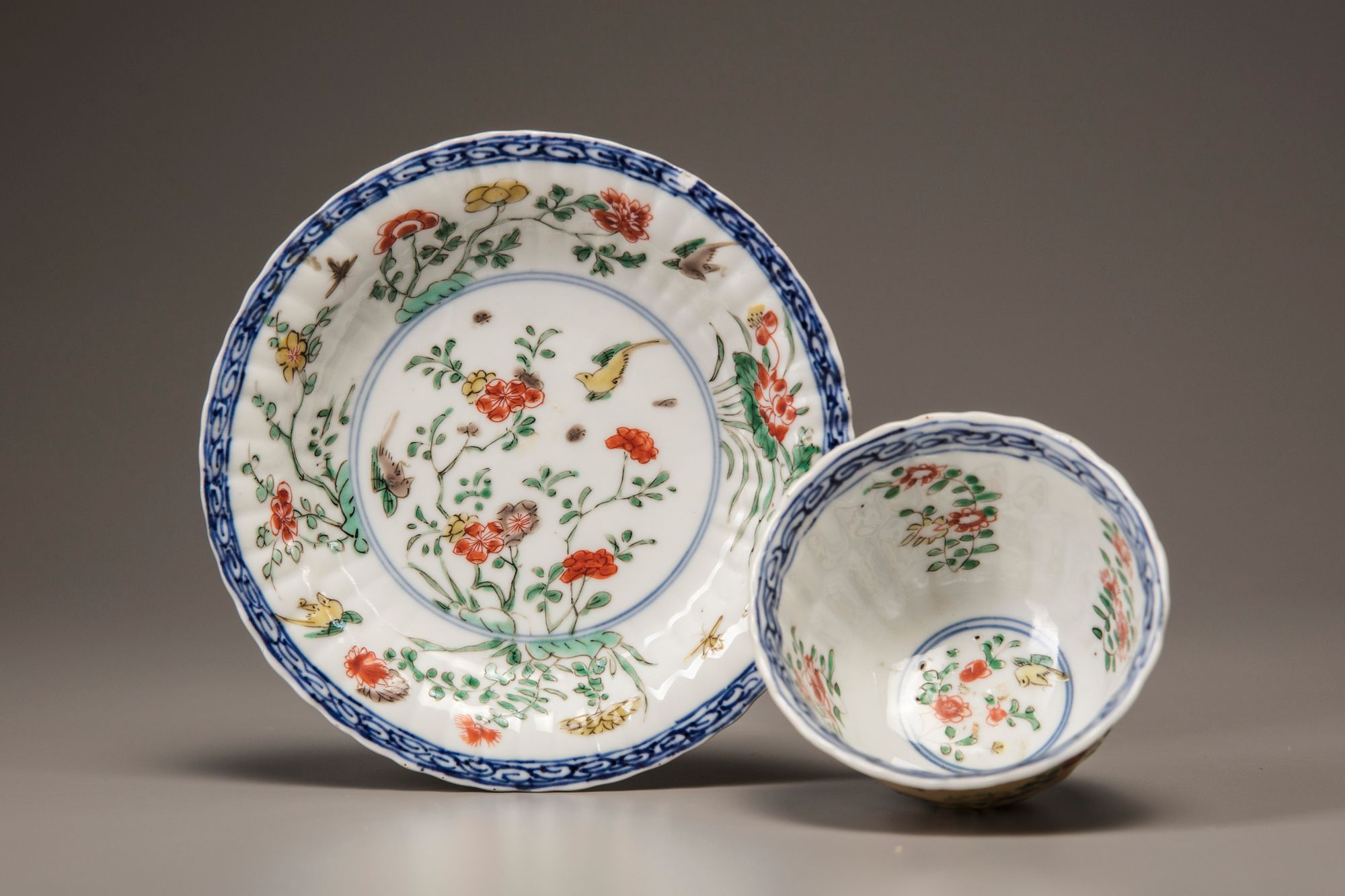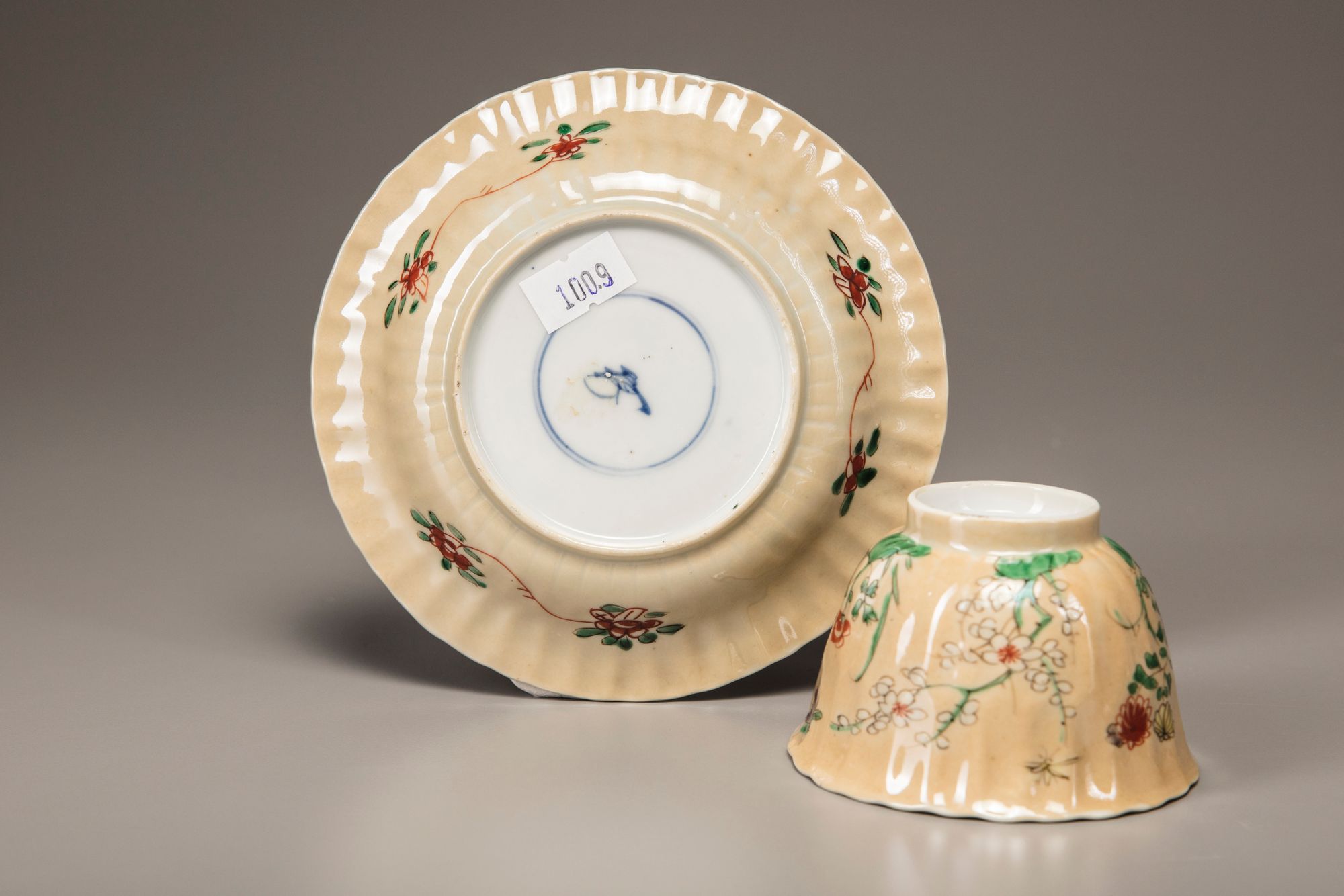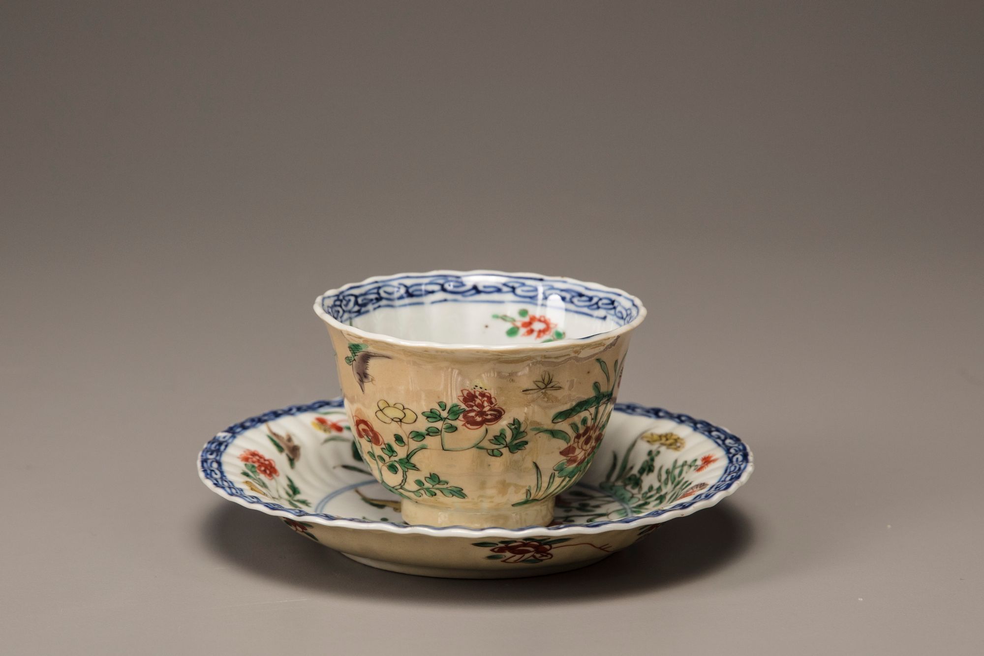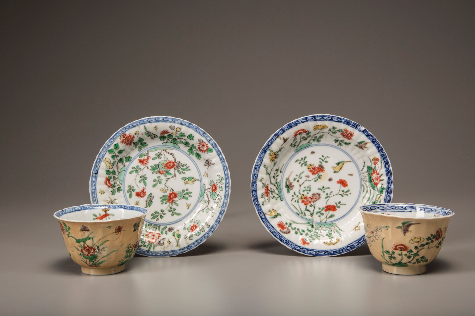 Condition: one cup with a section restuck with staples (approx. 6 cm. wide) and an associated chip and crack; one sauce4 with a chip to the rim (0.5 cm.); the other saucer with a crack to the rim and a chip (approx. 1 cm.).