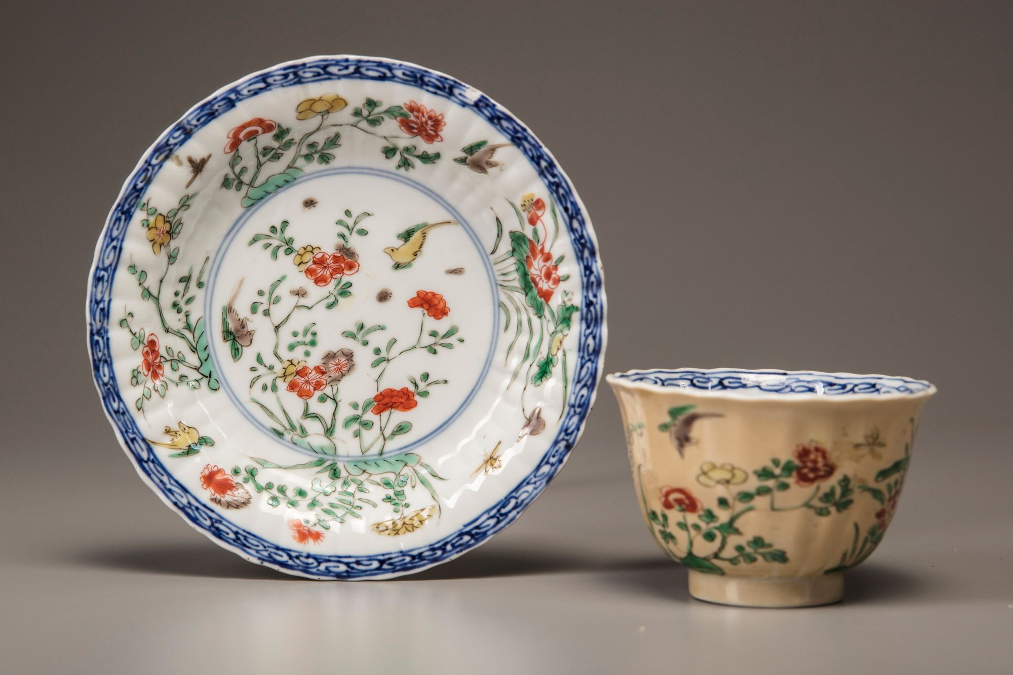 The exterior of the foliate cups are decorated with birds in flight amongst flowers, the interiors with scattered flower sprays. The saucers are similarly decorated. The base of each piece with an underglaze blue leaf mark.