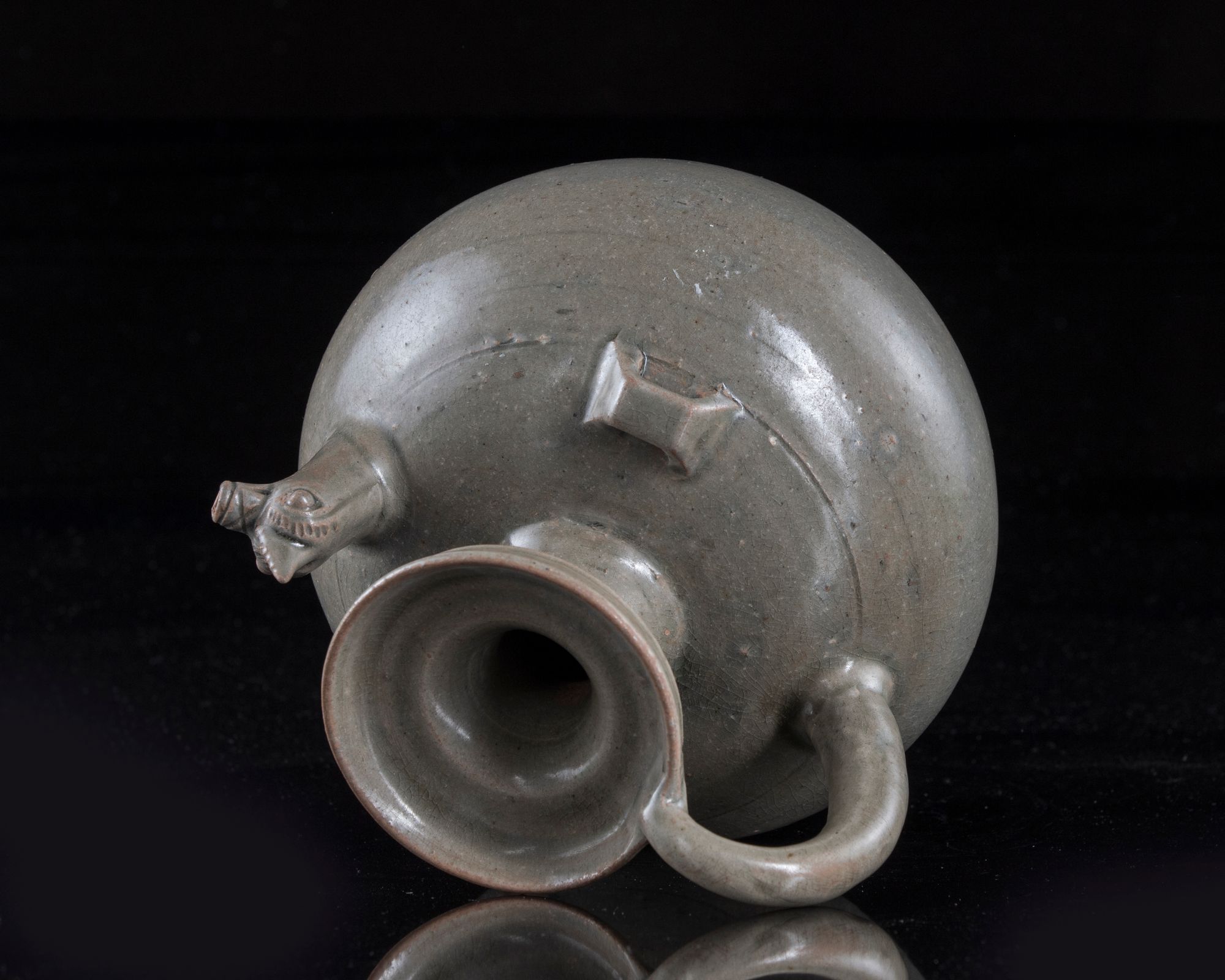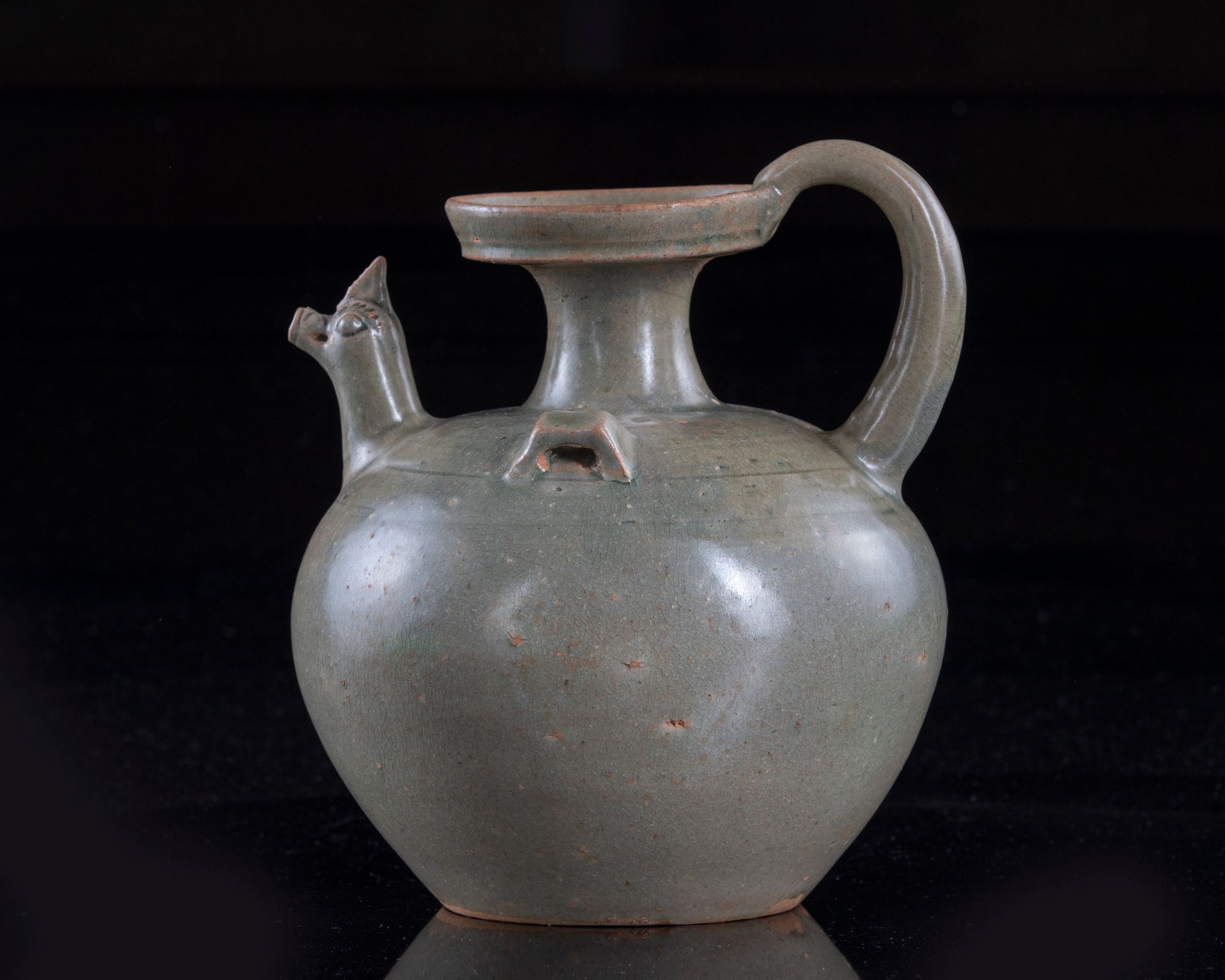 The ewer is sturdily potted with an ovoid body rising to a waisted neck flaring to a galleried rim, applied to the shoulder with two angular loop handles, a short spout in the form of a chicken-head, and a long arched handle grasping the mouth rim of the ewer, covered allover with a greyish crackled-celadon glaze, stopping at the foot.