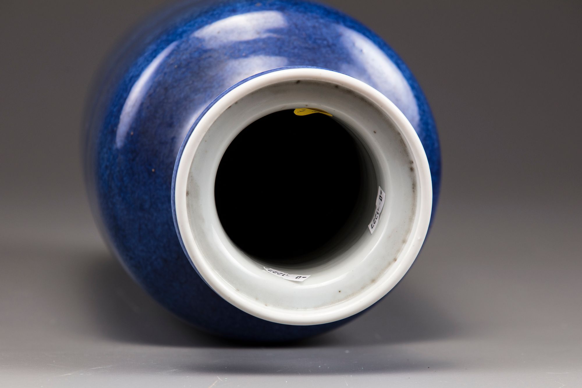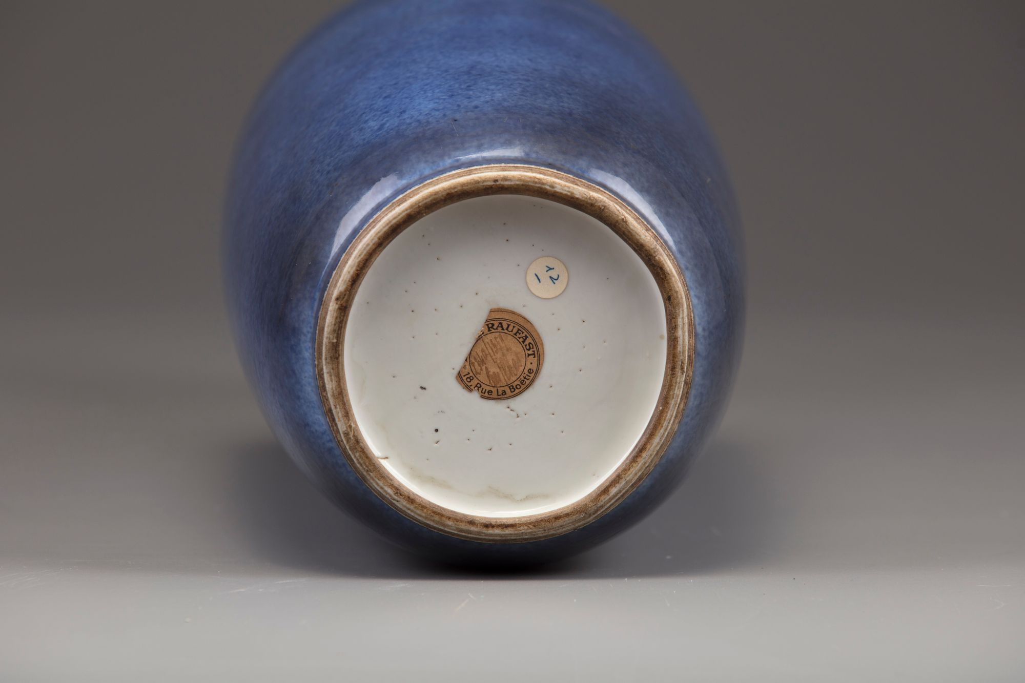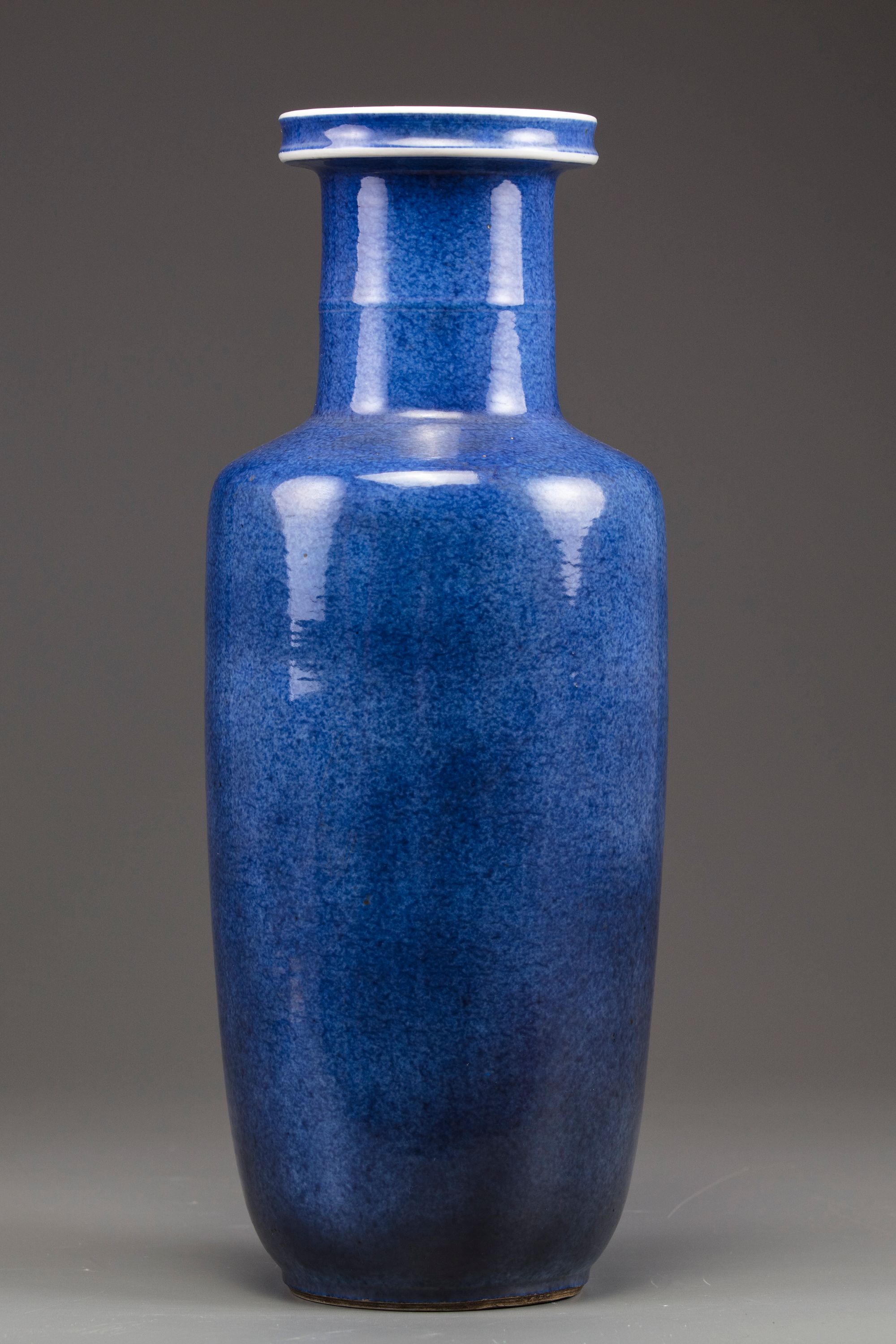 The exterior of the vase is covered in a mottled sapphire blue glaze excluding the interior, the base, and the edges of the galleried rim left white.