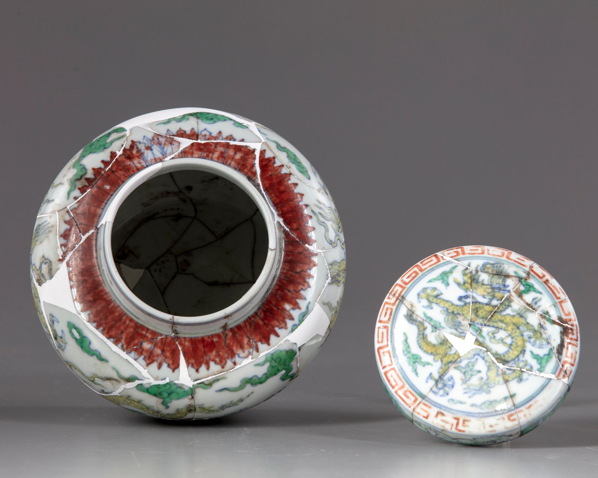 The cover is decorated with a dragon amongst clouds surrounded by a keyfret band. The exterior of the jar is decorated with two dragons amongst cloud scrolls above crashing waves, all below a lappet band at the shoulder. The base with a 'tian' mark.