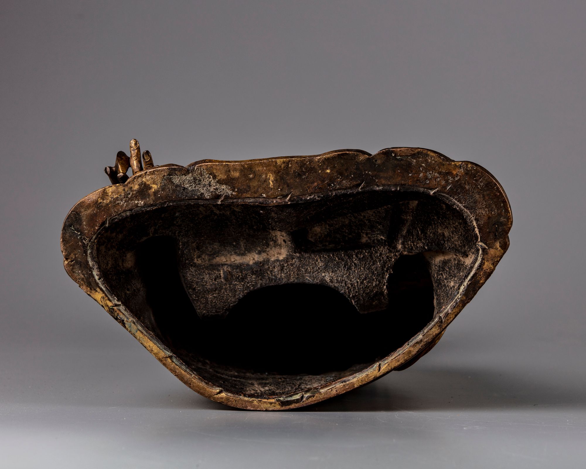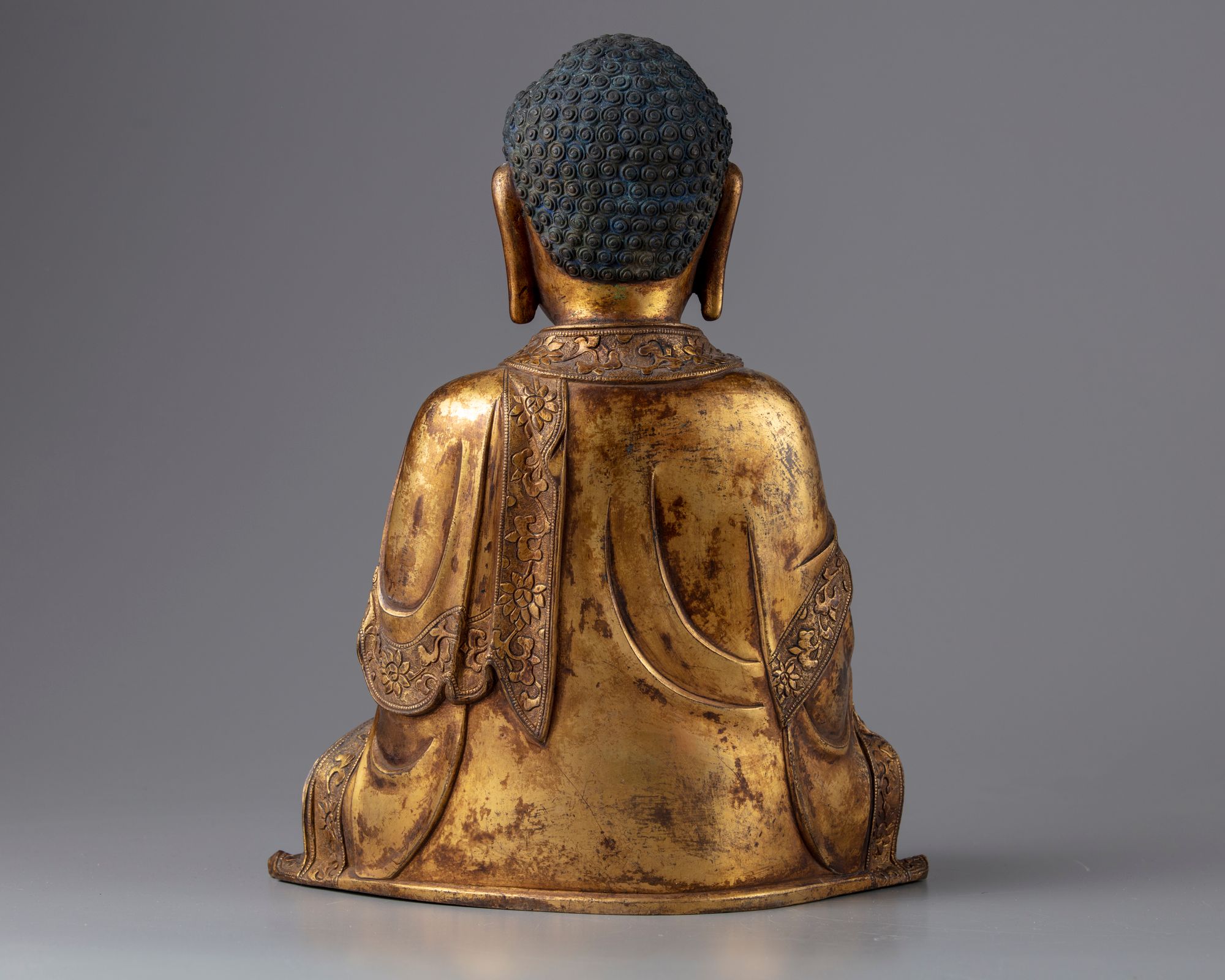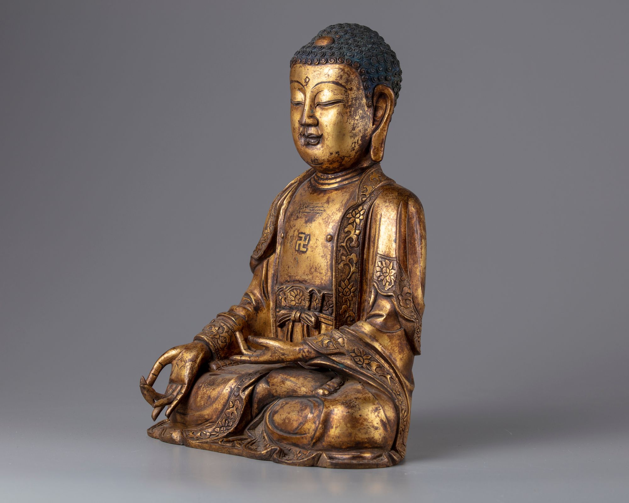 A serene figure respresents the Amitabha Buddha , eyes cast down,with two legs crossed and his hands in Varada mudras statue. The face is full rounded with a raised dot or urna in the centre of the forehead with elongated ear lobes, a sign of wisdom.This meditative Boddha wears a monastic robe with incised flower scrolls and left open at the chest exposing a wan emblem.