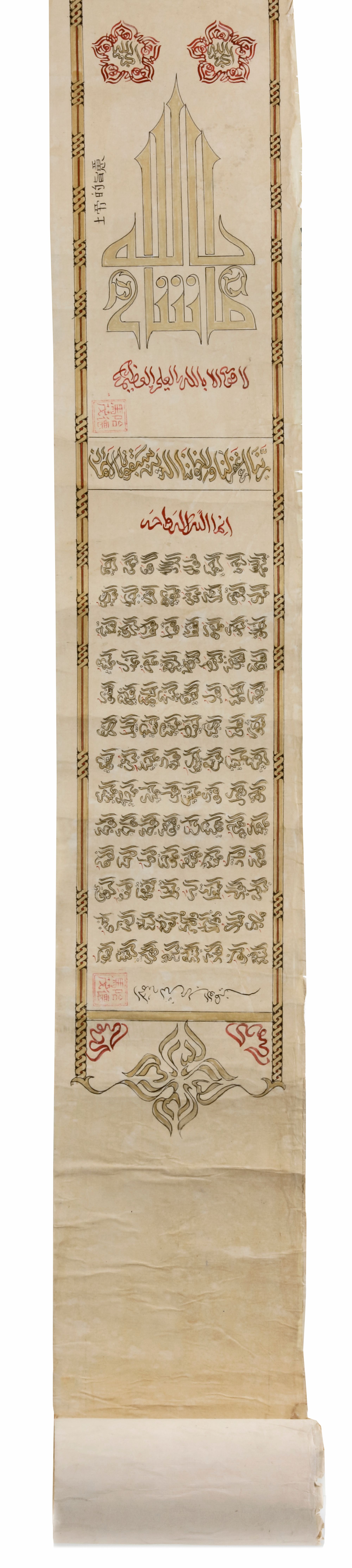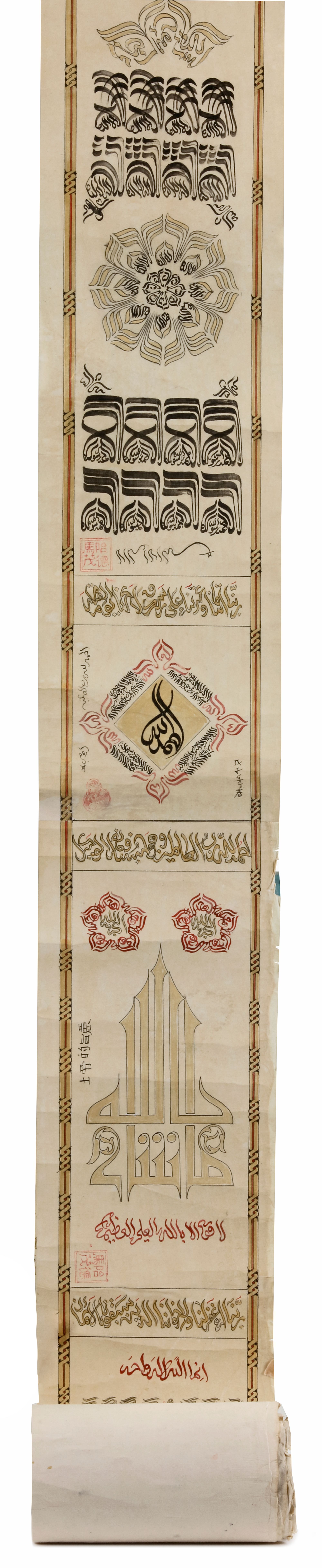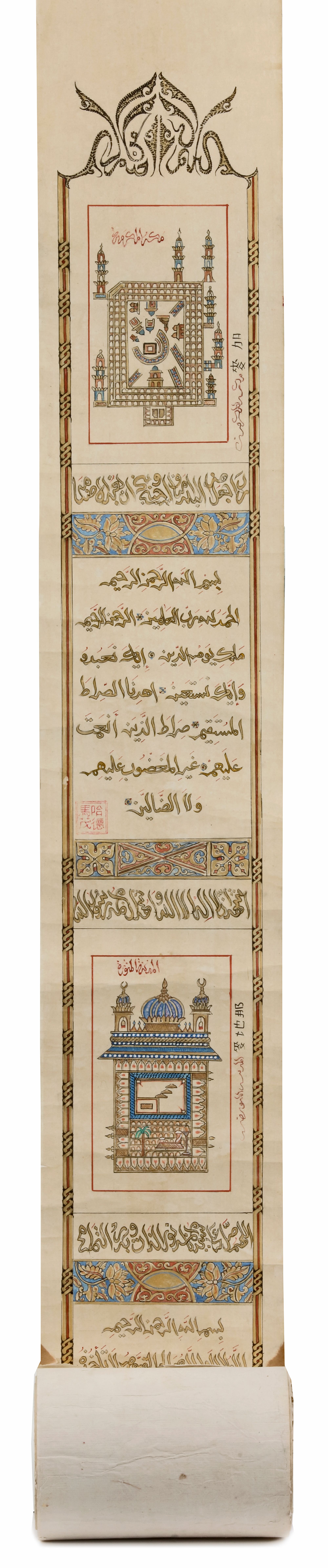 Single leaf, Arabic manuscript with gold and gouache on paper, divided into divisions. (1) A small painting of Masjid al-Haram with seven minarets (2) surah Al-Fatiha in gilt naskh script outlined in black (3) A small painting of Al Masjid Al-Nabawi (4) surah Al-Kursi in gold naskh script outlined in black (5) Kalimaat Al-Tawhid (6) prayer in gold naskh script (7) gilt floral motifs of the prophet name Muhammed (8) A small painting of flower issuing from a vase of Kalimmat Al-Tawhid (9) surah Al-Falaq with a censer (10) gilt floral design of surah Al-Ikhlas (11) 'Oh, Allah' script design of Kalimaat Al-Tawhid (12) floral gilt vases (13) 99 beautiful names of Allah in gold script. All ruled gilt floral border outlined in black. 580 by 12.5 cm.