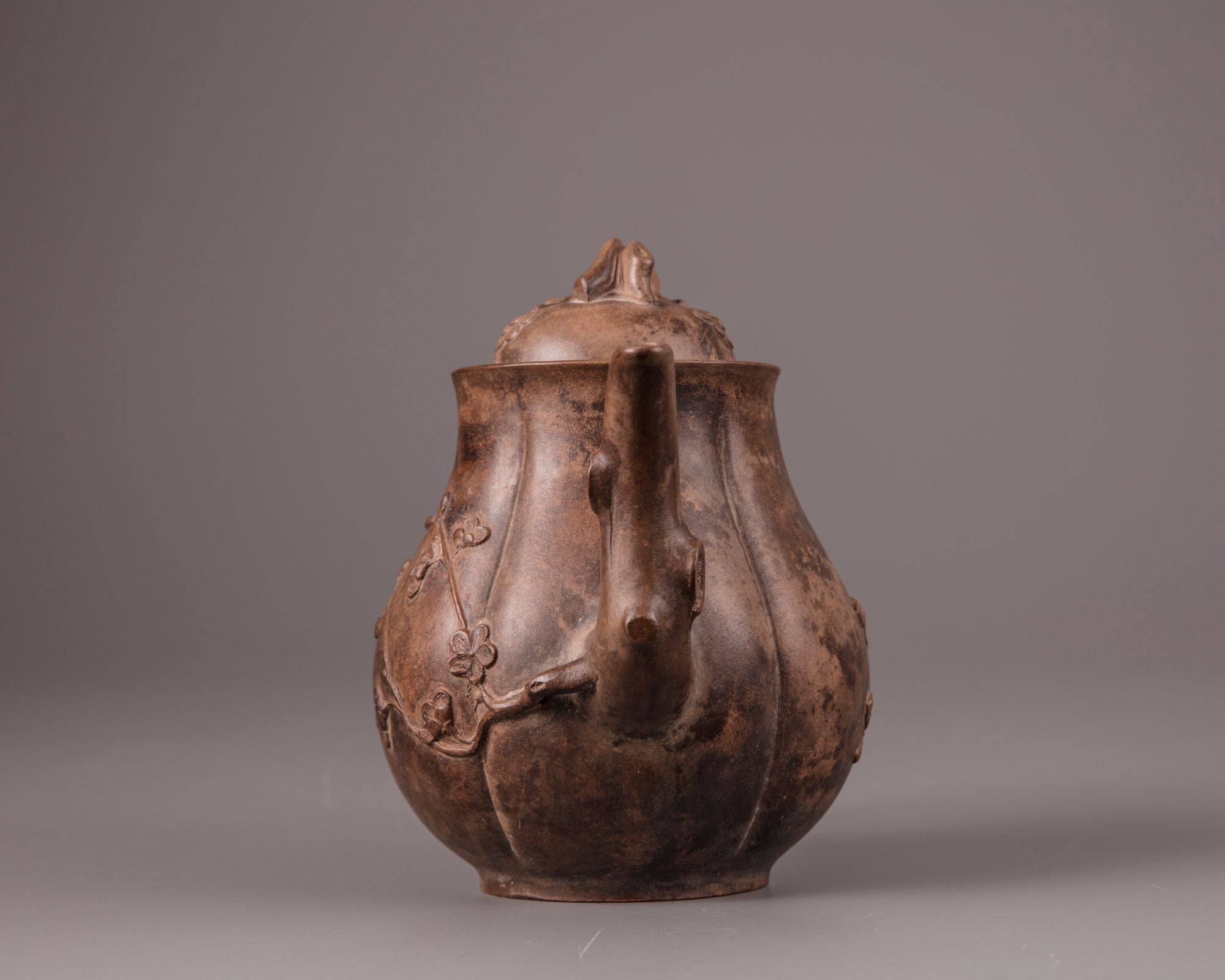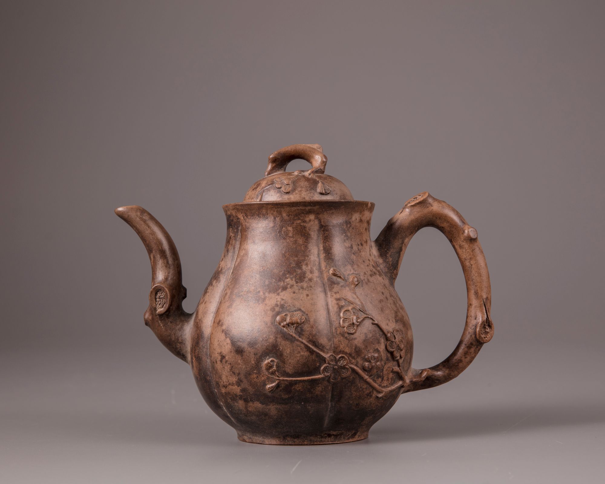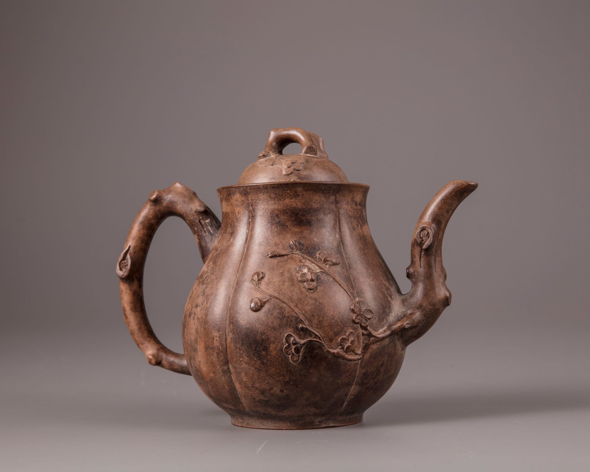 The lobed teapot is decorated with a spout and handle imitating a gnarled prunus branch, with the blossoms and branches spreading over the body. The domed cover is surmounted by a prunus branch finial. The base is stamped 'Jiang Cuifeng zhi', and the underside of the cover is stamped with a mark reading 'Gui Lin'.