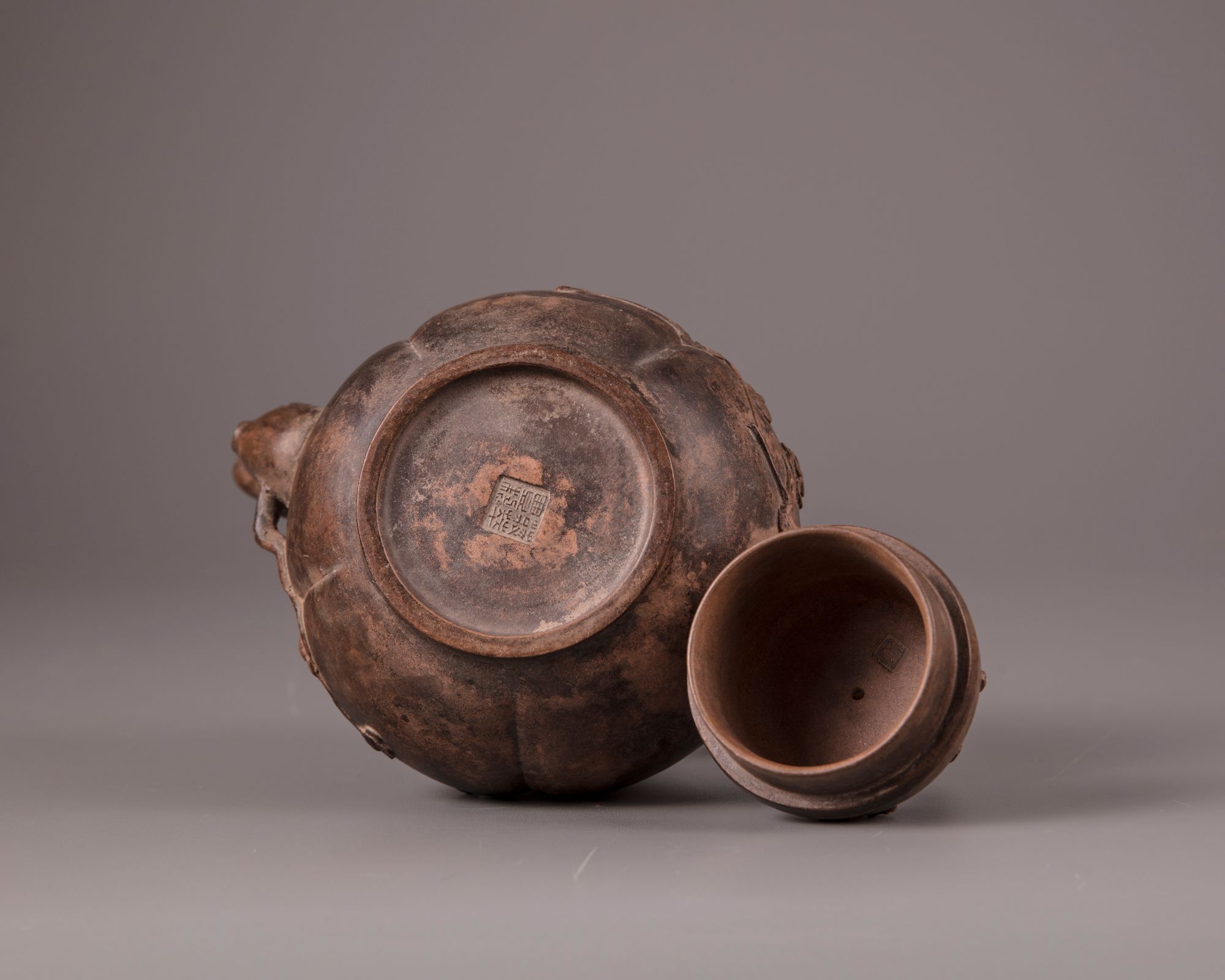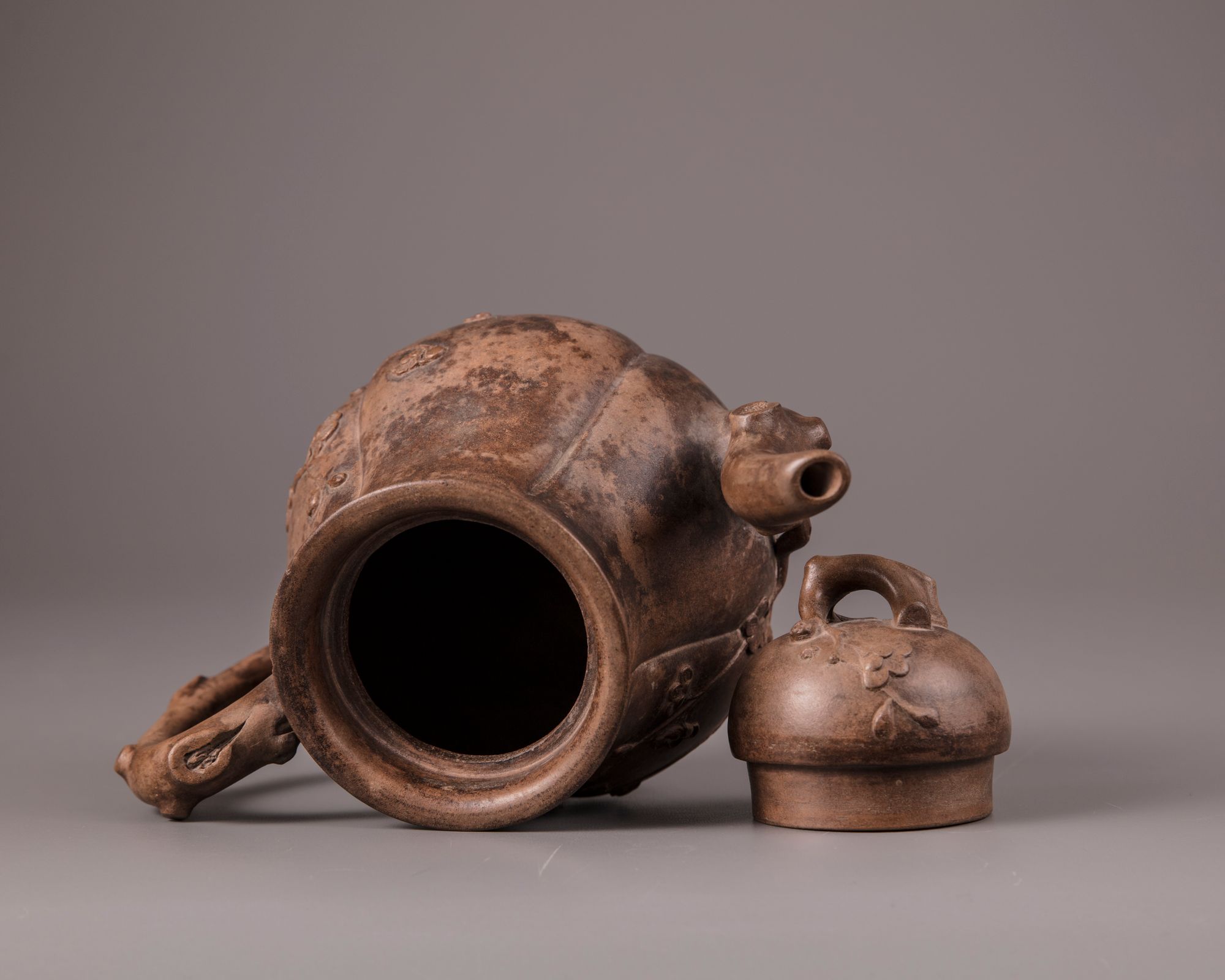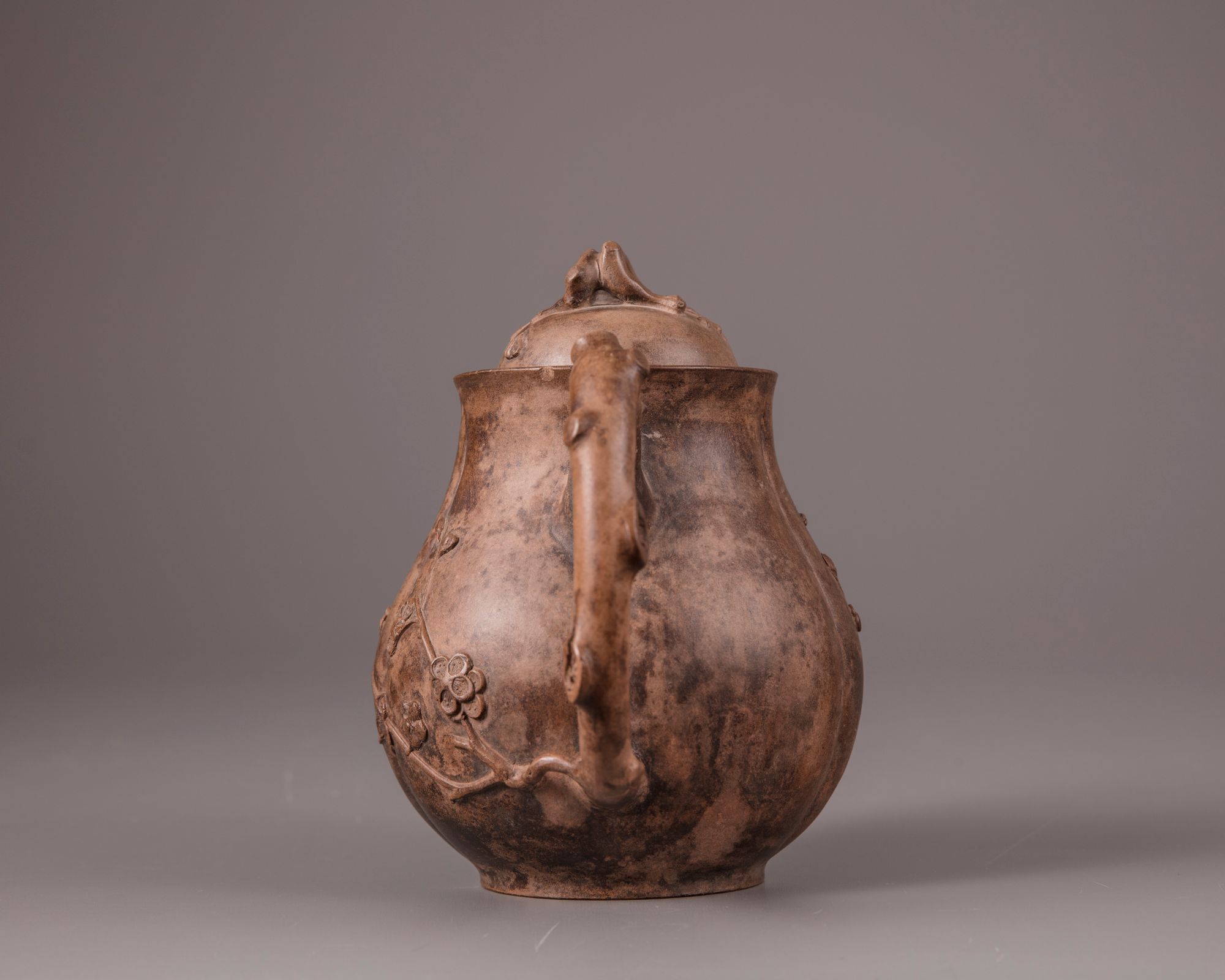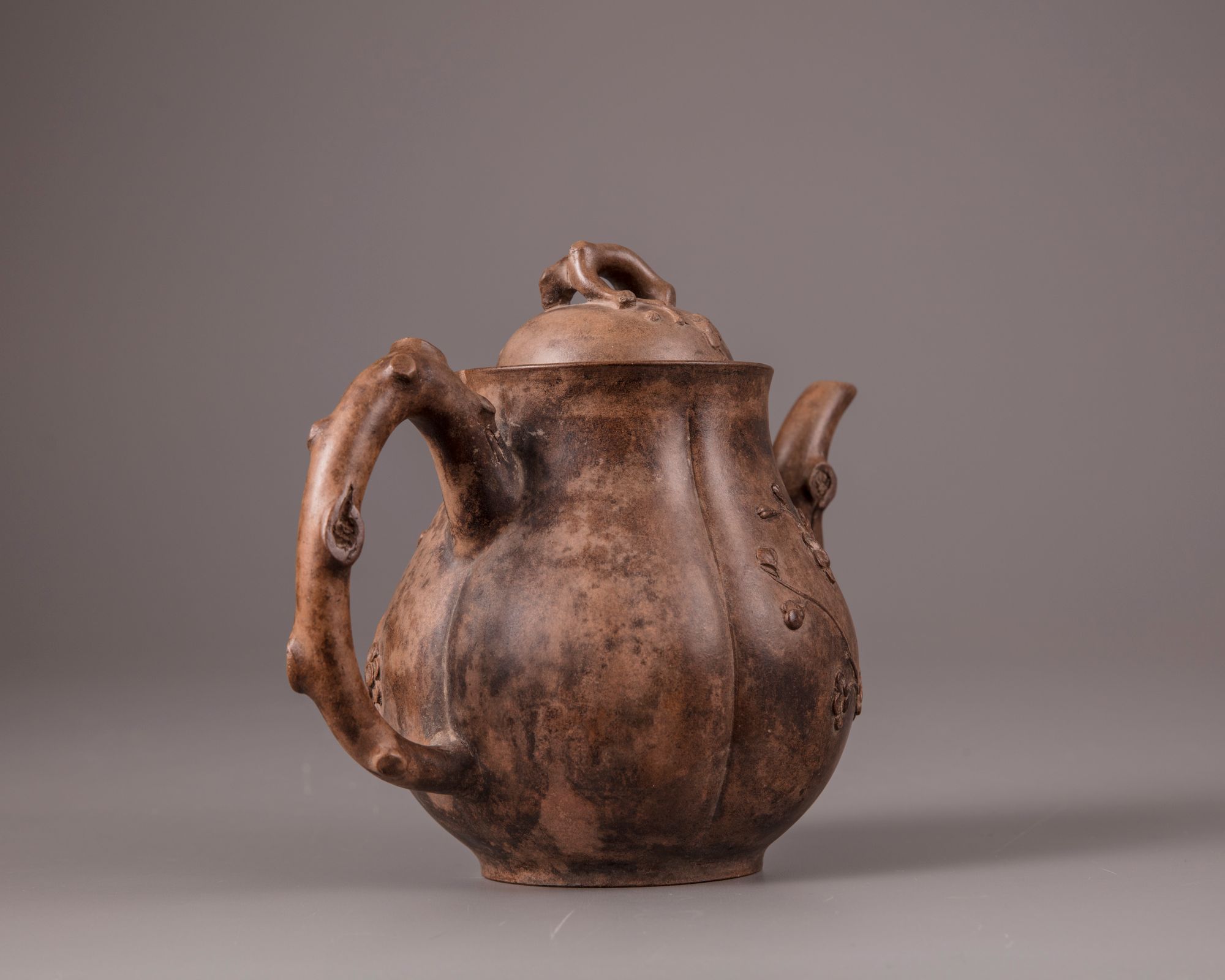The lobed teapot is decorated with a spout and handle imitating a gnarled prunus branch, with the blossoms and branches spreading over the body. The domed cover is surmounted by a prunus branch finial. The base is stamped 'Jiang Cuifeng zhi', and the underside of the cover is stamped with a mark reading 'Gui Lin'.