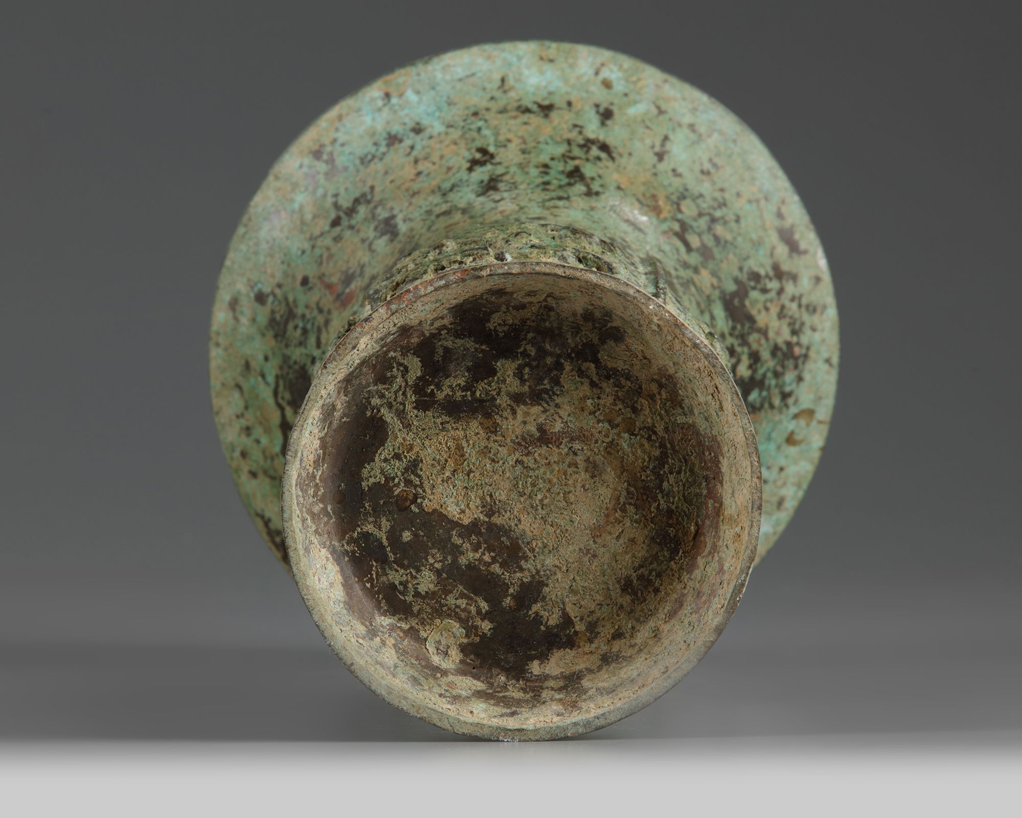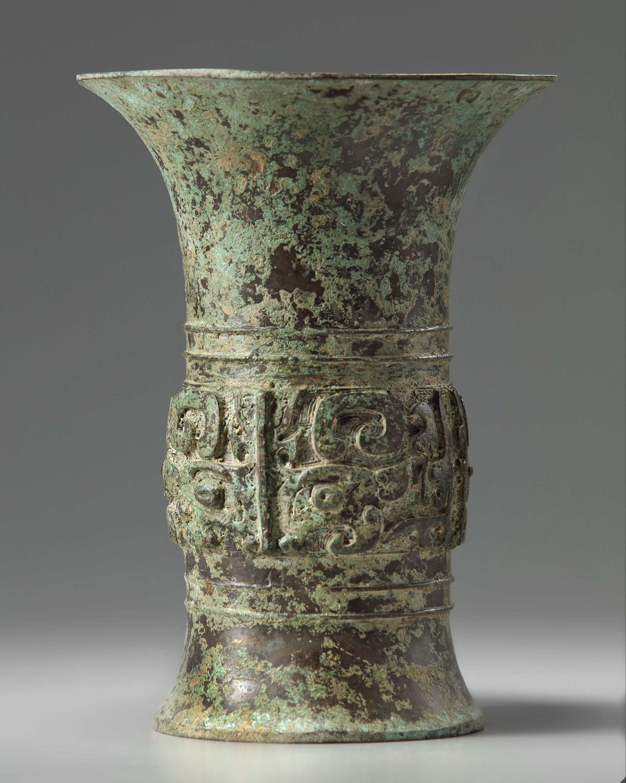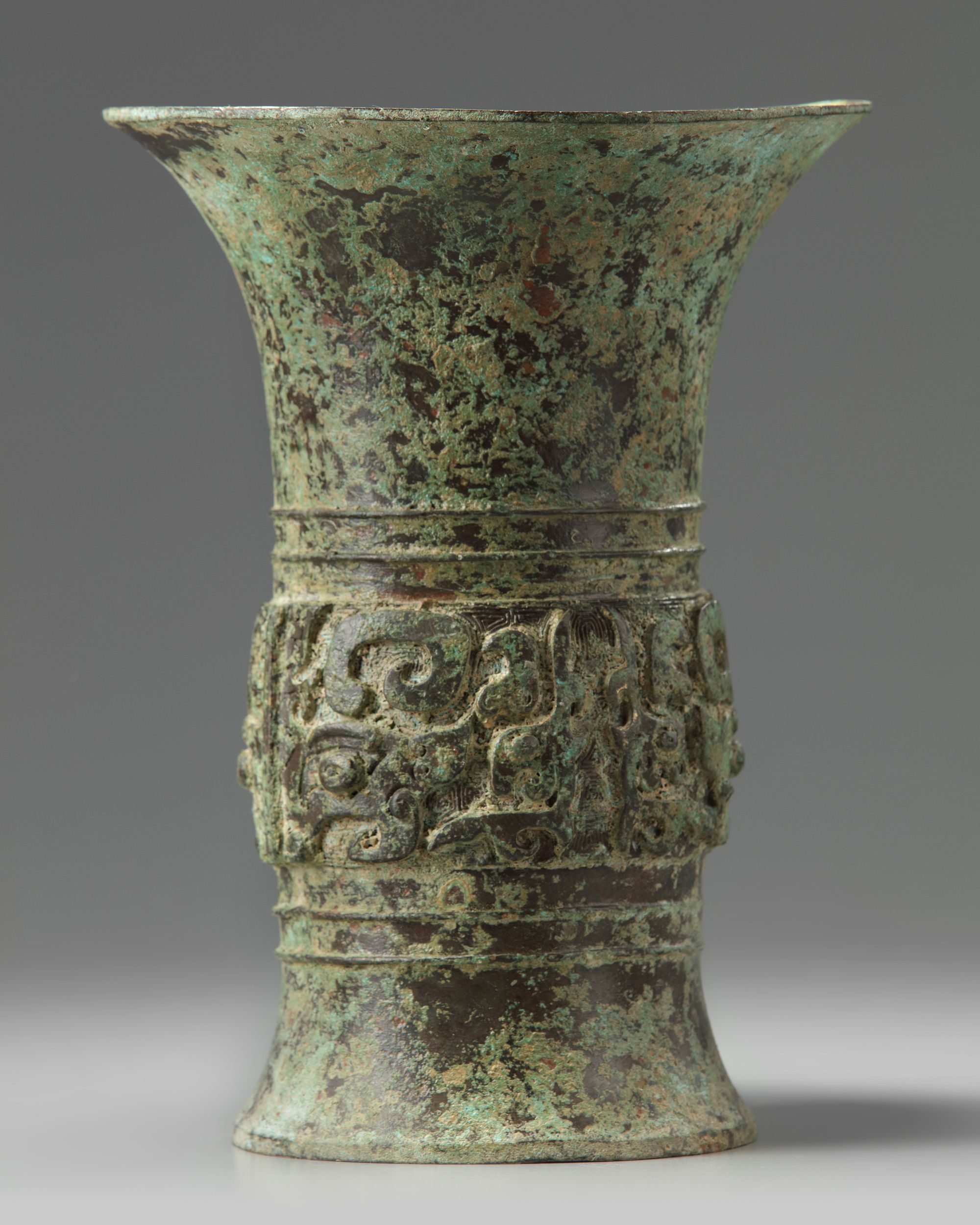 The body of the vase is decorated in high relief with a band of taotie masks on a leiwen ground between two raised bands.