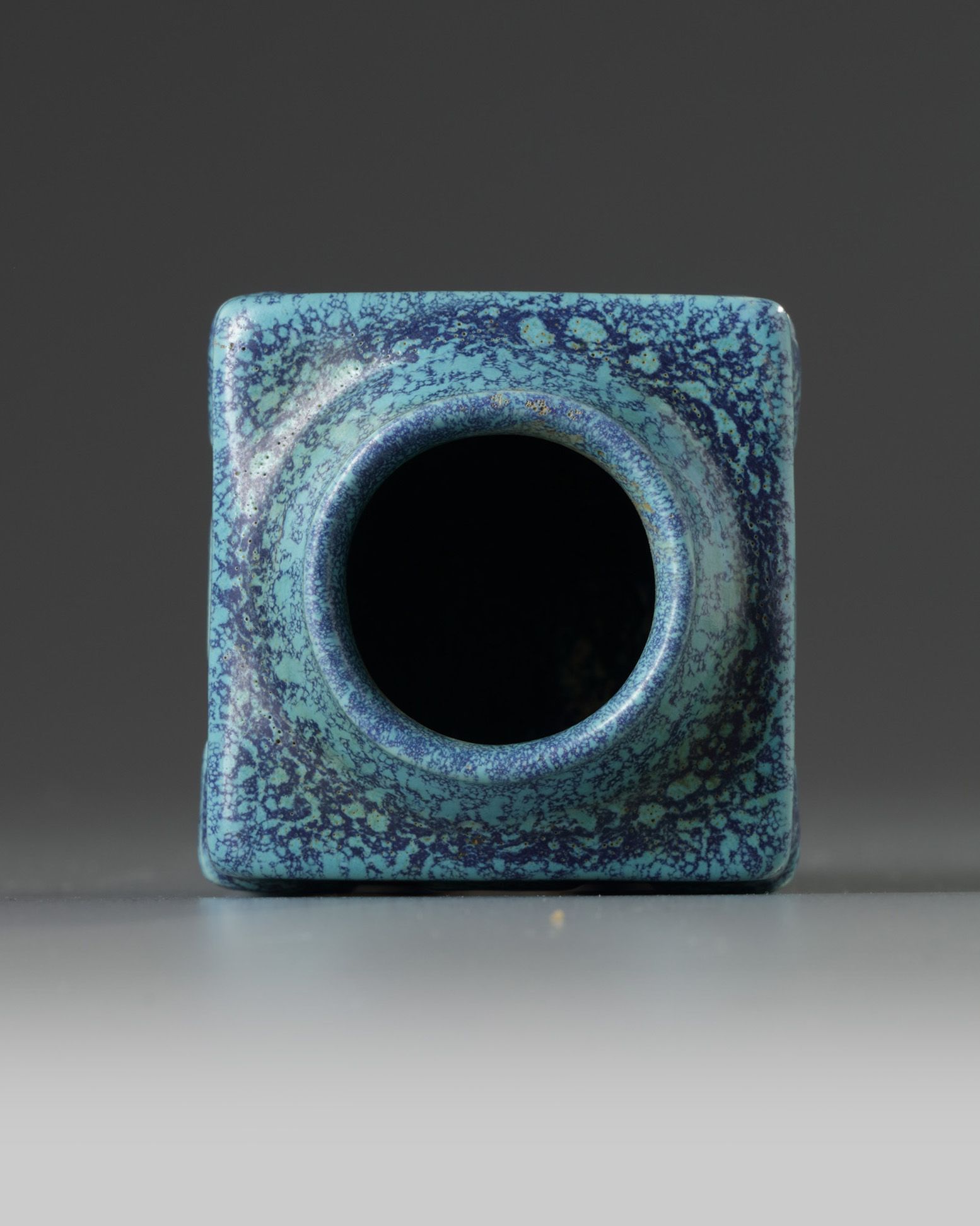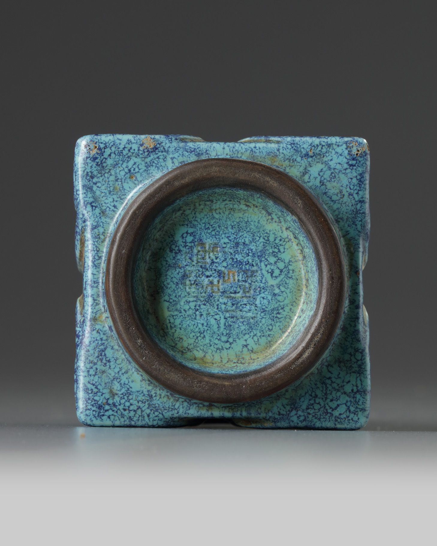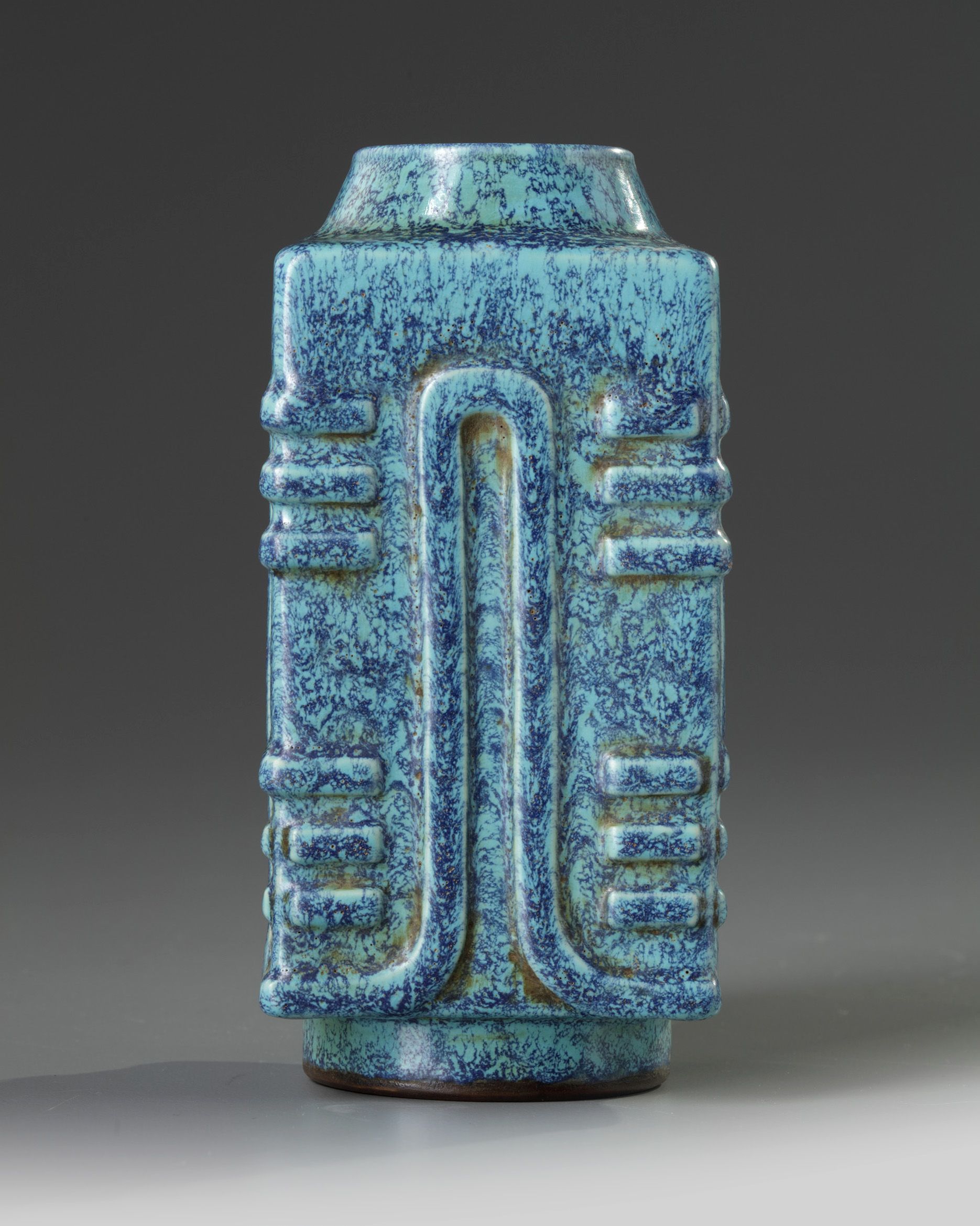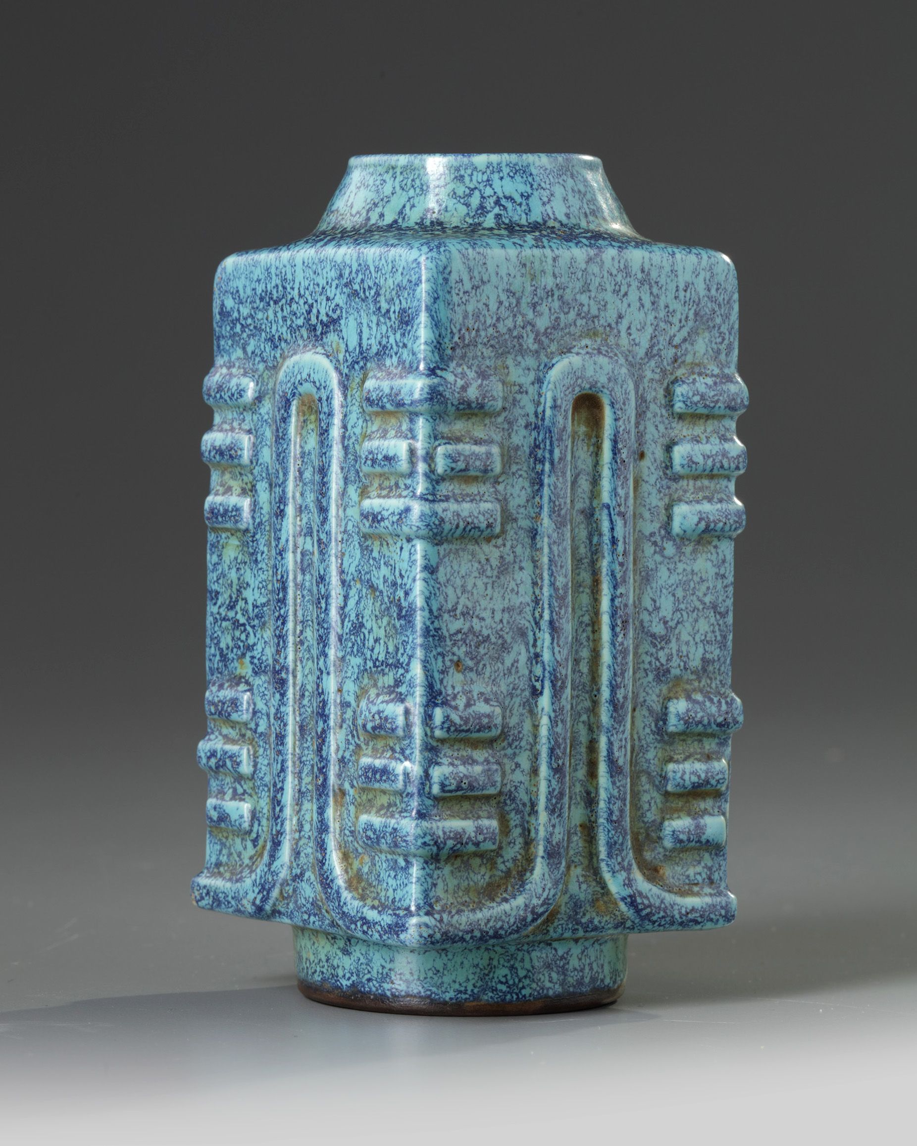 The vase is moulded to each corner with notches, and on each side with an inverted narrow U-shaped scroll. It is covered overall with a mottled deep blue and turquoise glaze, the base with an apocryphal Qianlong mark.
