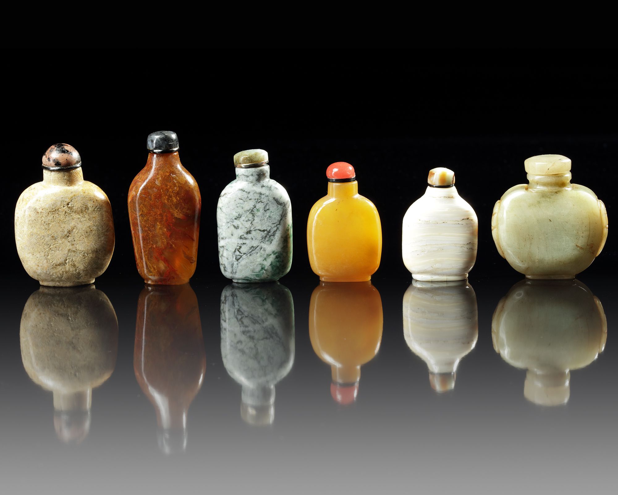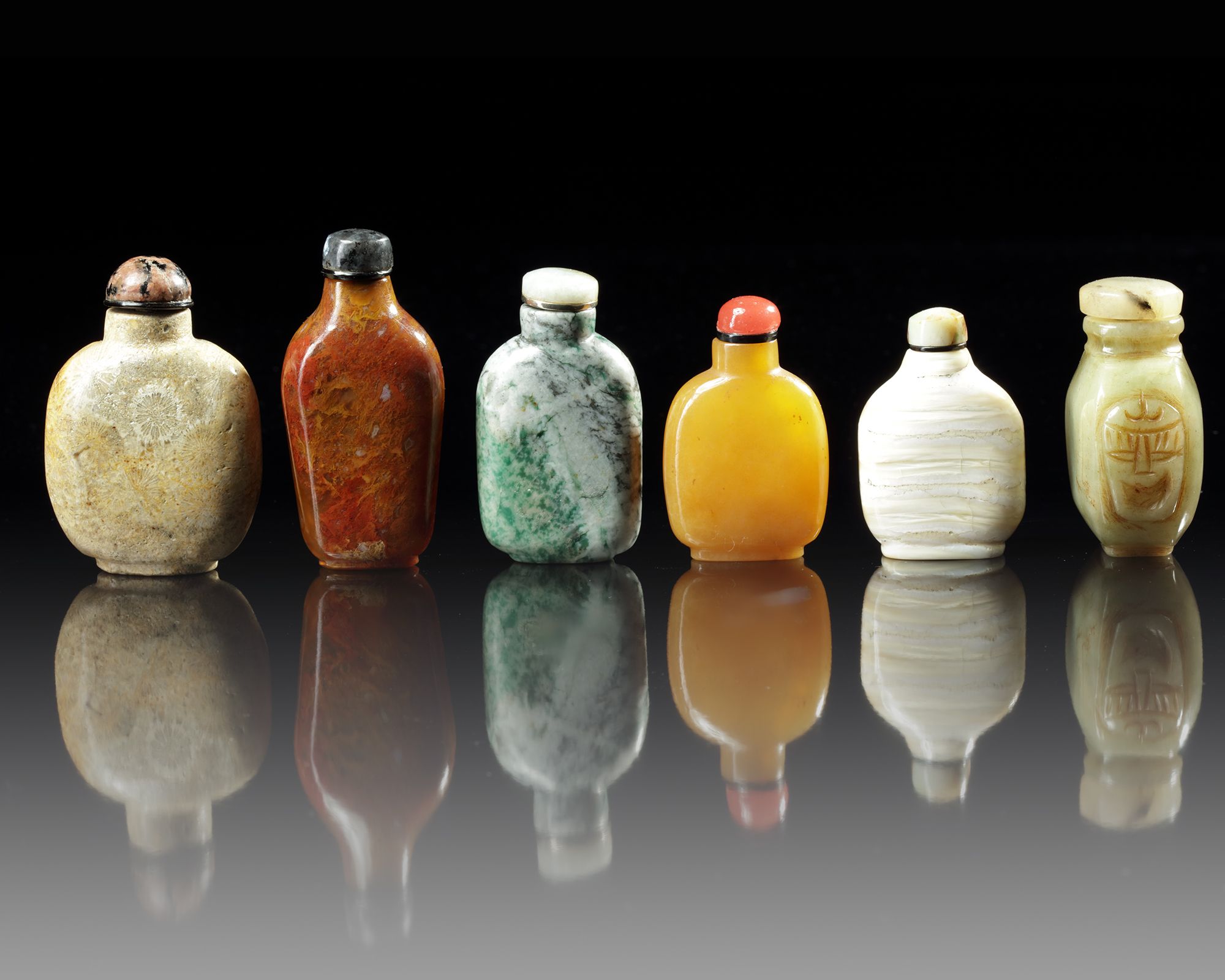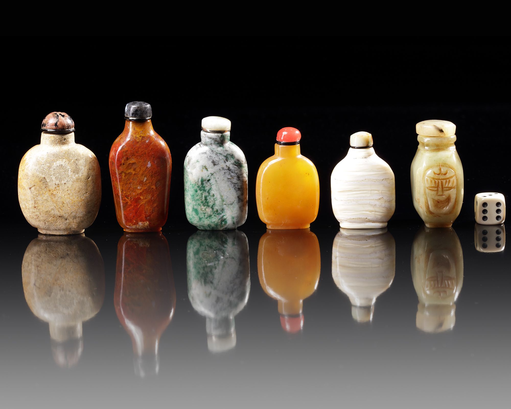 The group comprises snuff bottles carved from: agatized coral; white layered agate; amber-coloured agate; a greenish-white mossy agate; a yellow agate; and a pale celadon agate. 5.50 - 7.50 CM.