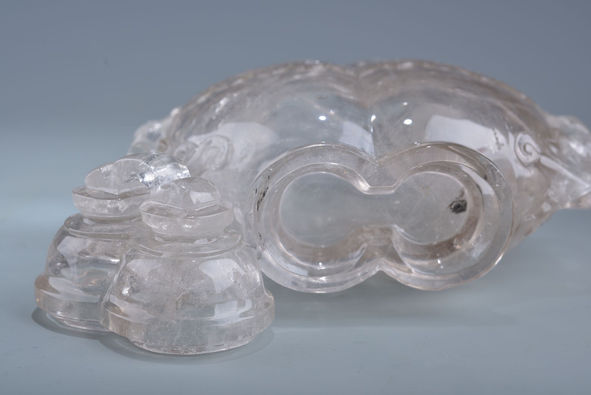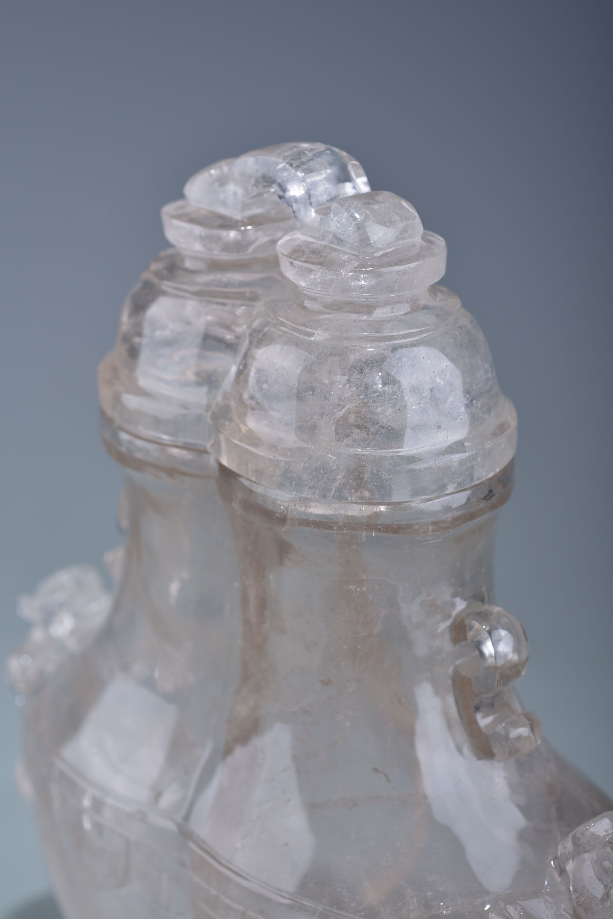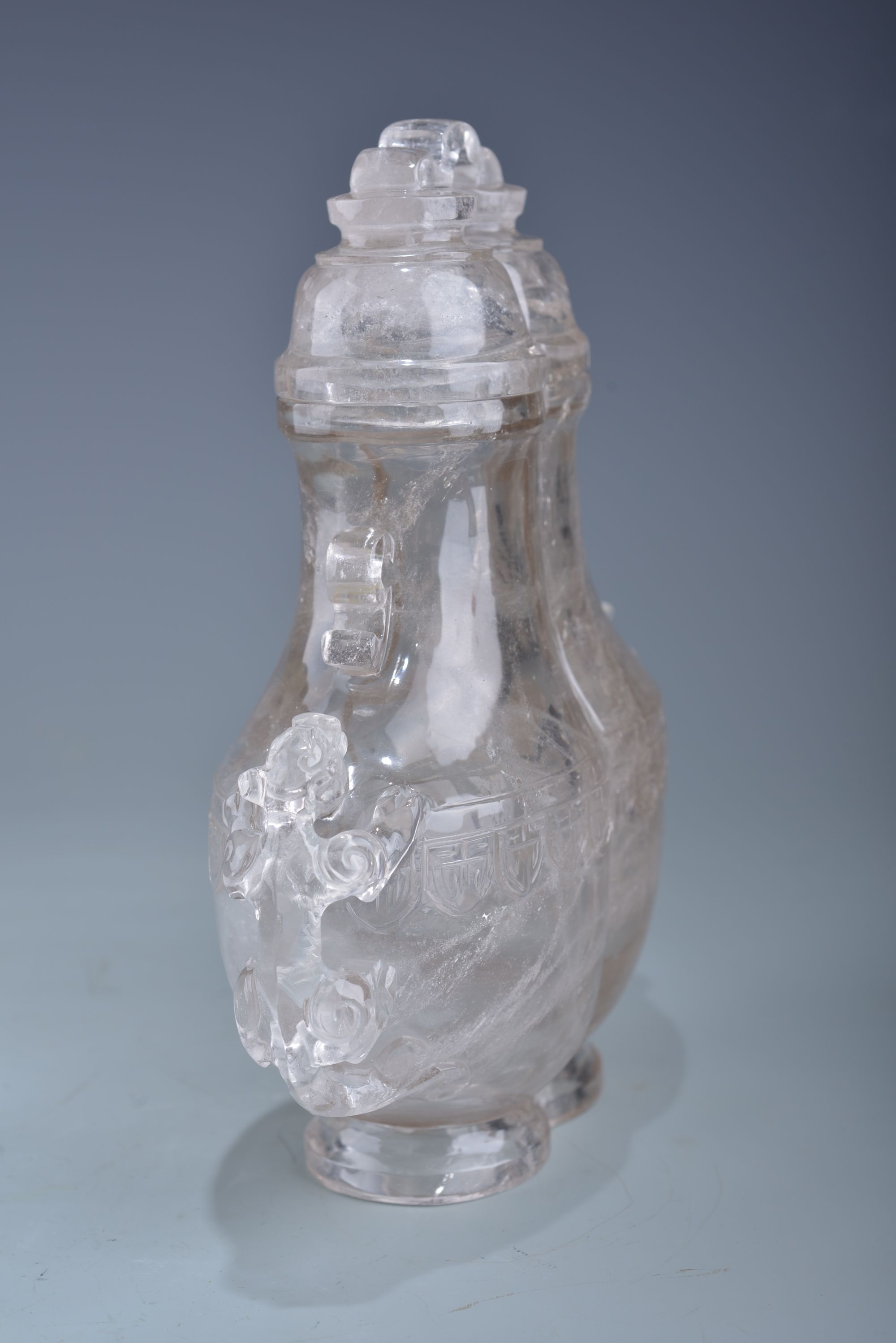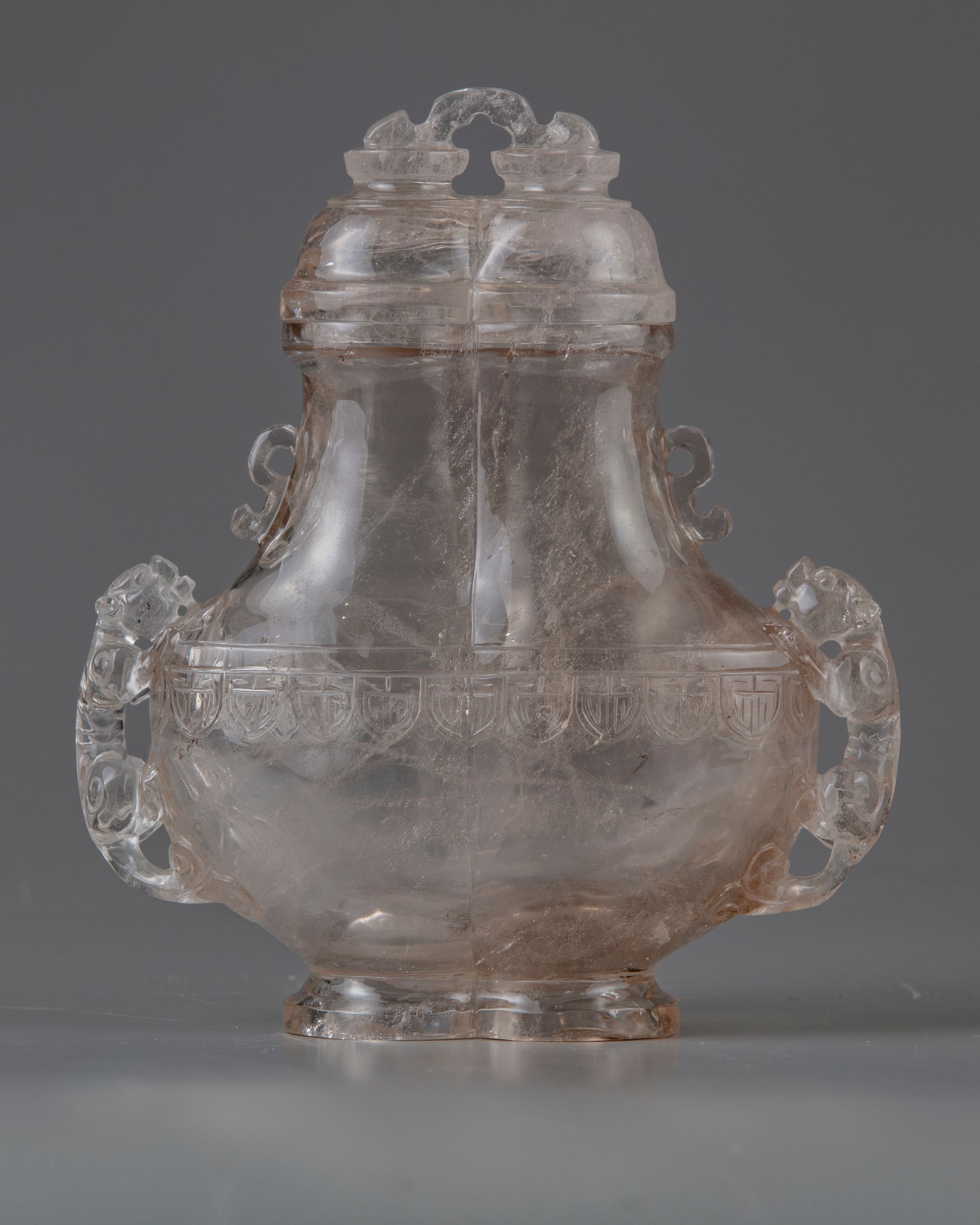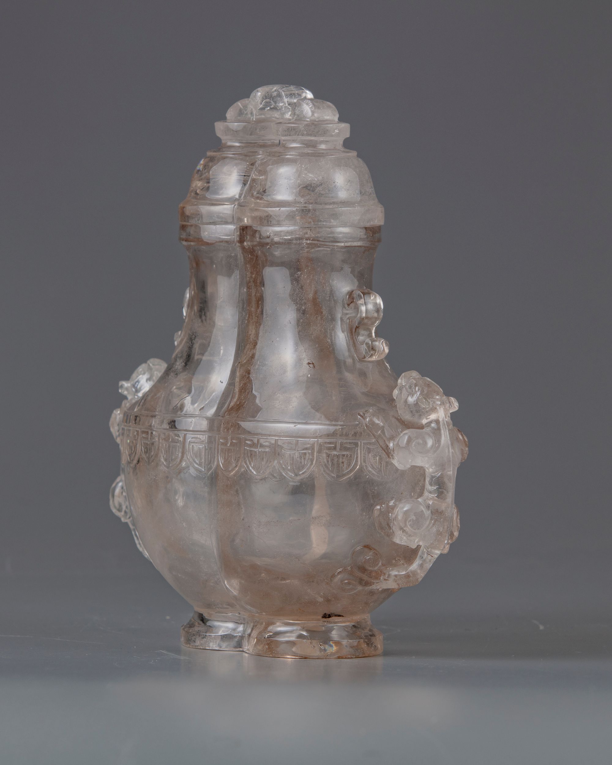The vase is modelled with a pear-shaped body, the sides are decorated with two chilong handles, connected by a lappet band at the shoulder. The cover is carved with a double finial.