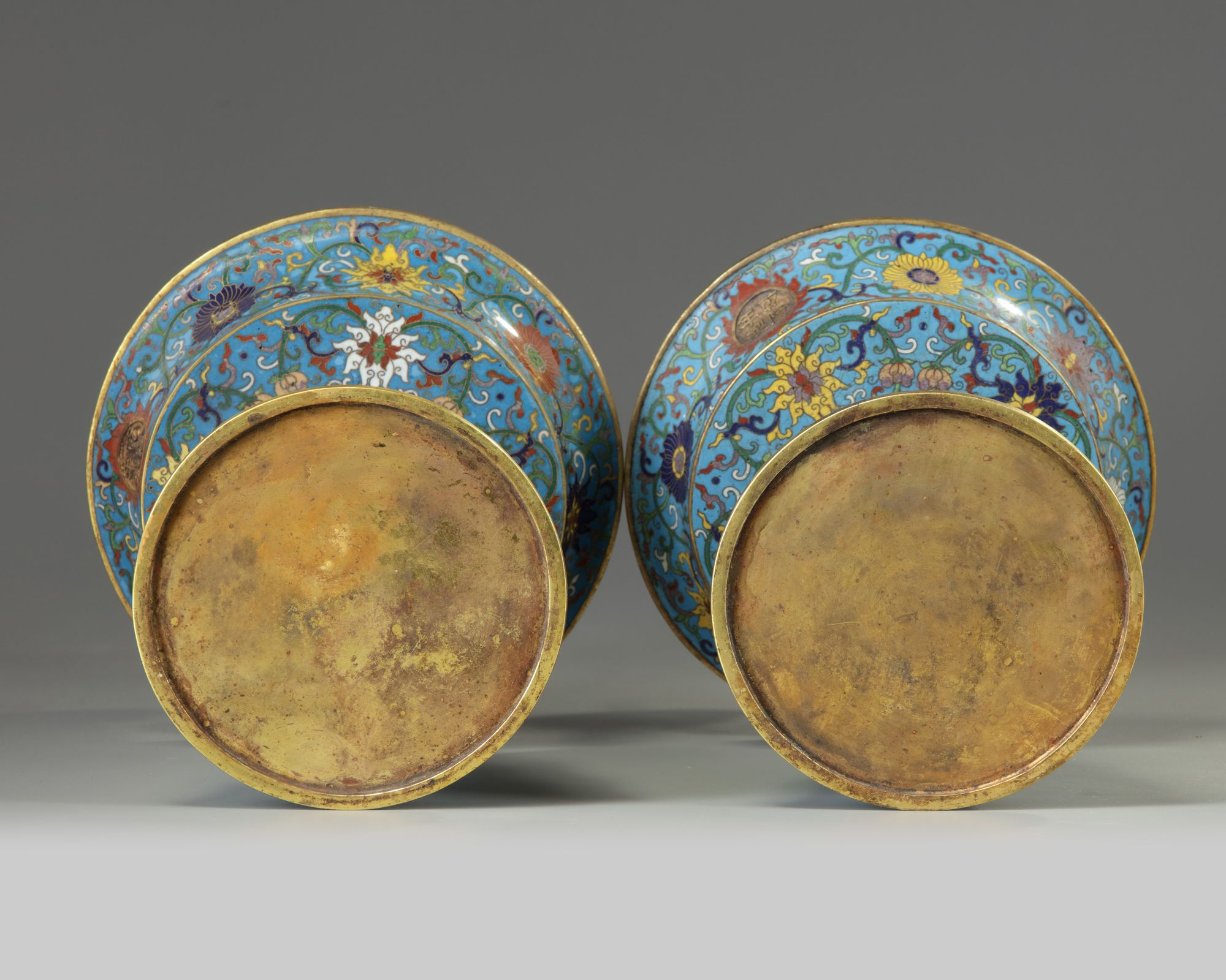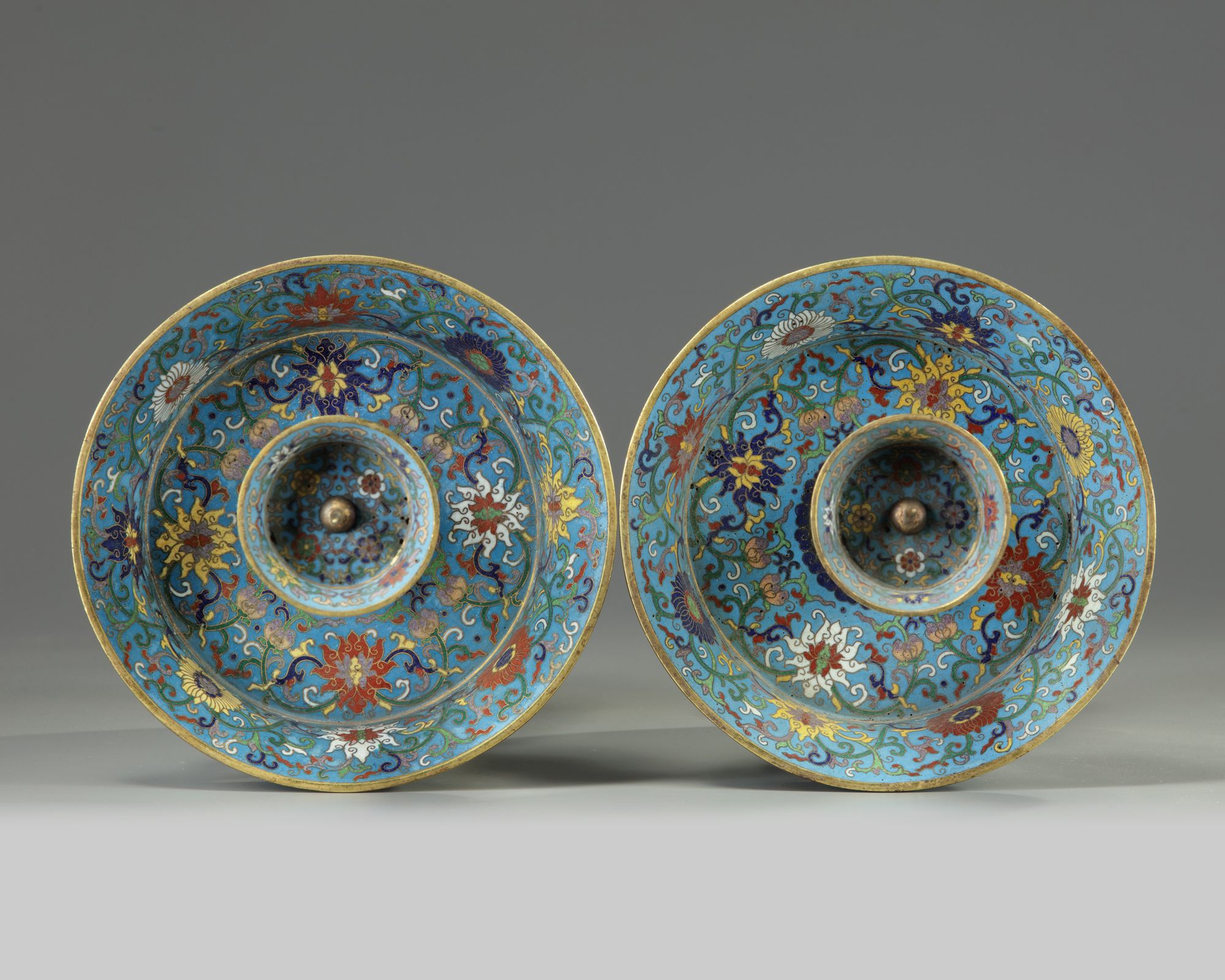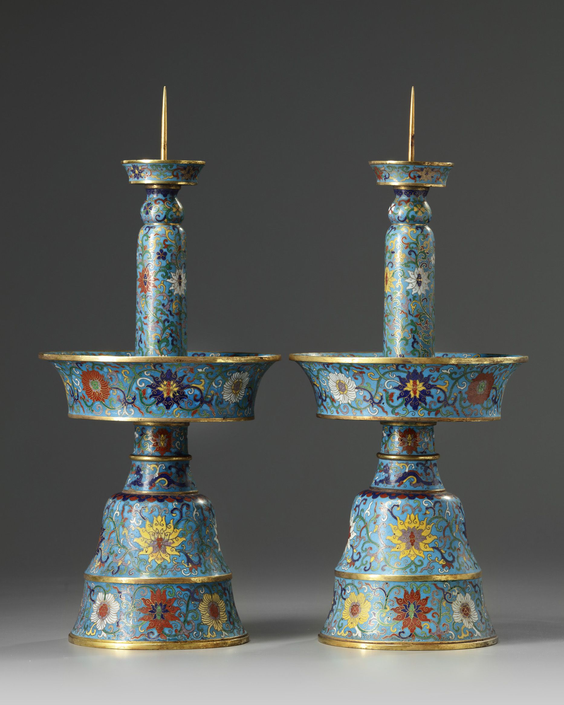 Each pricket stick is decorated overall with scrolling lotus on a turquoise ground. Each with an apocryphal Qianlong mark to the drip pan.