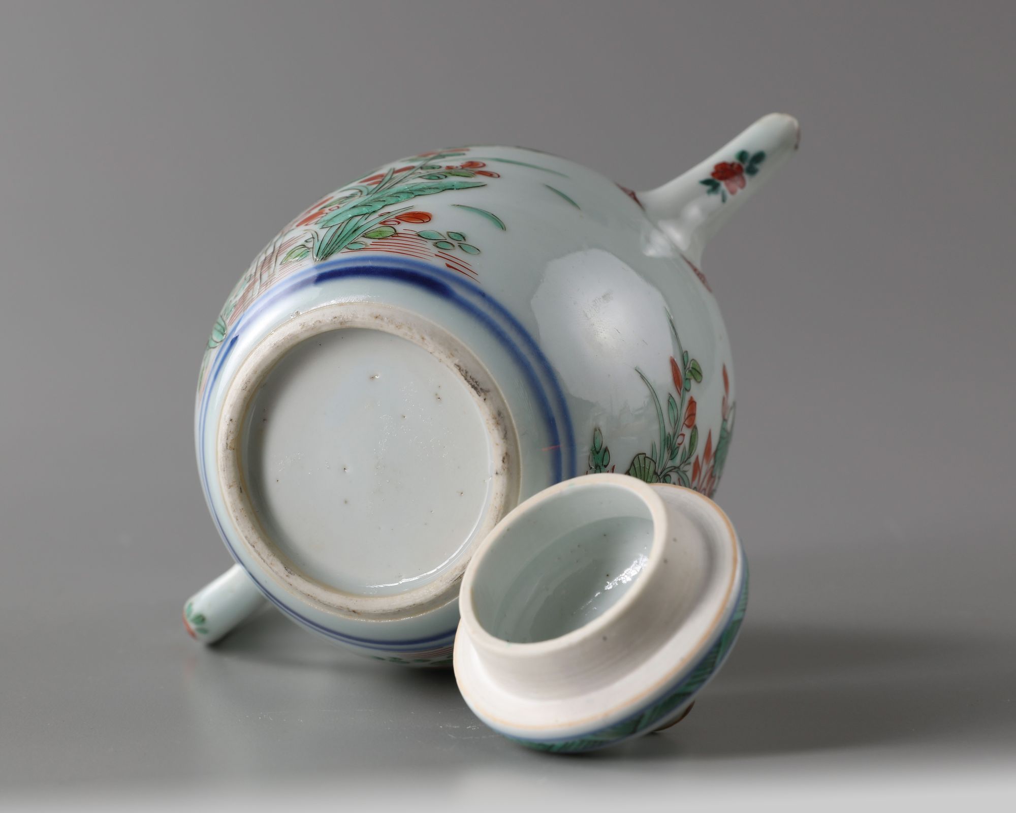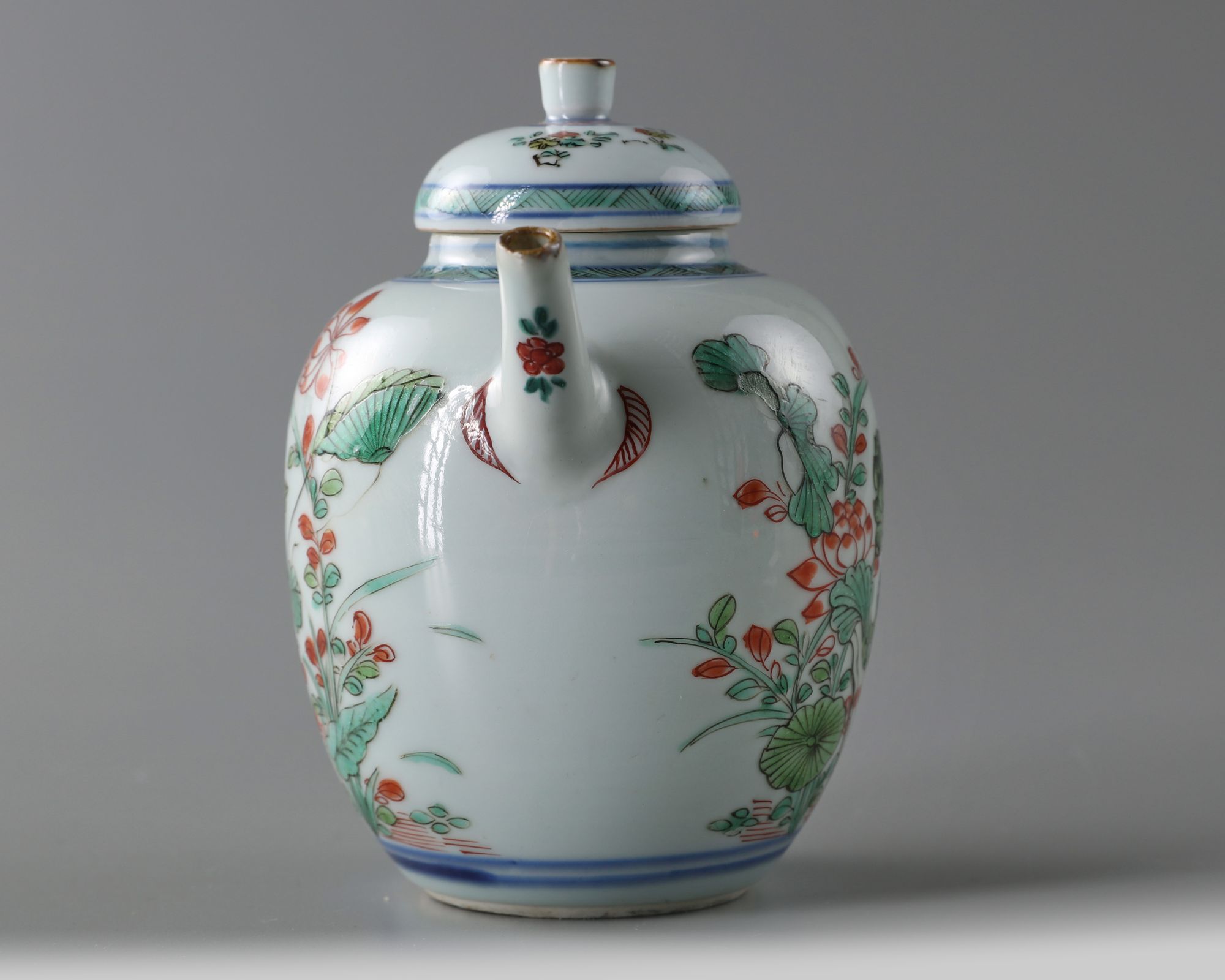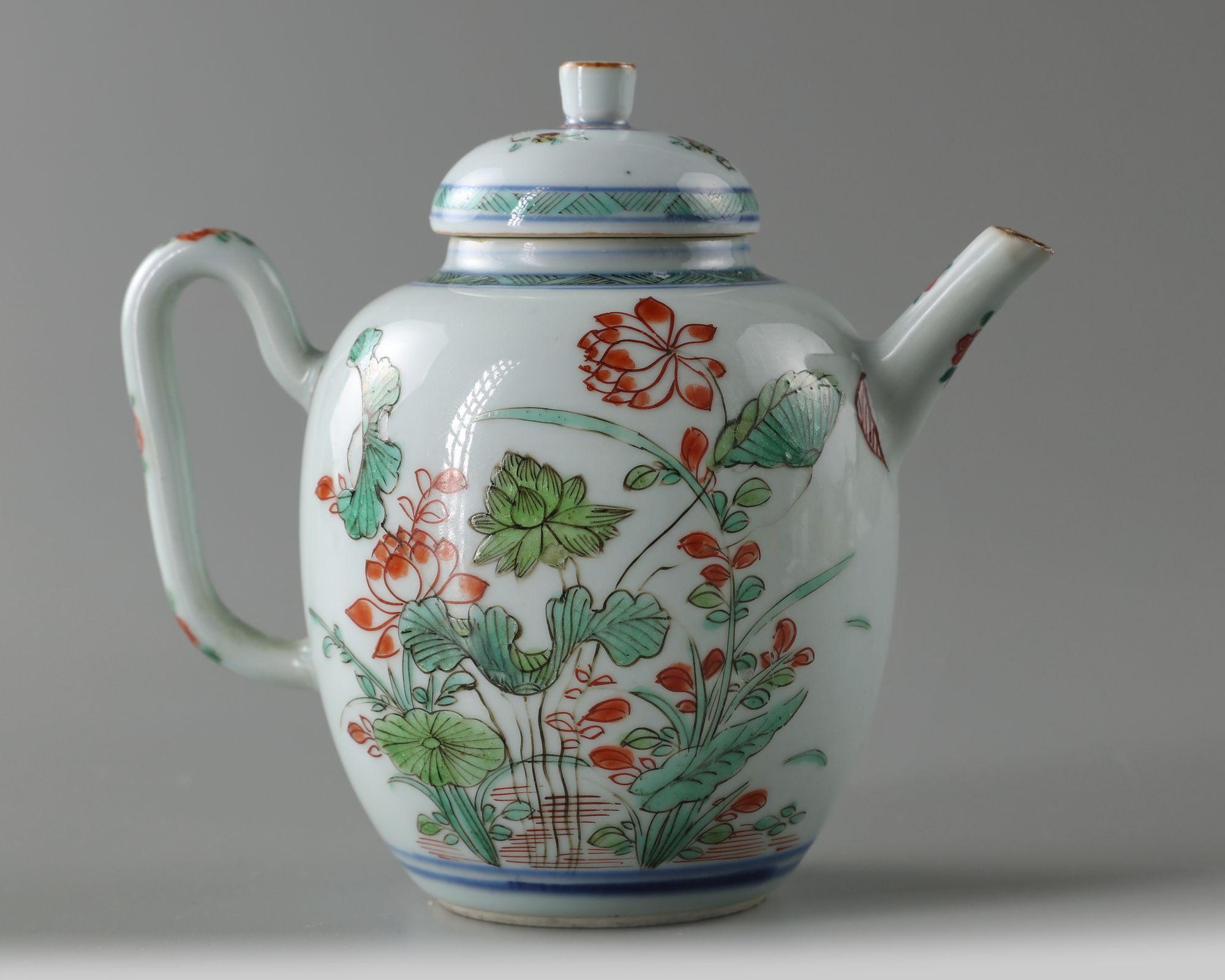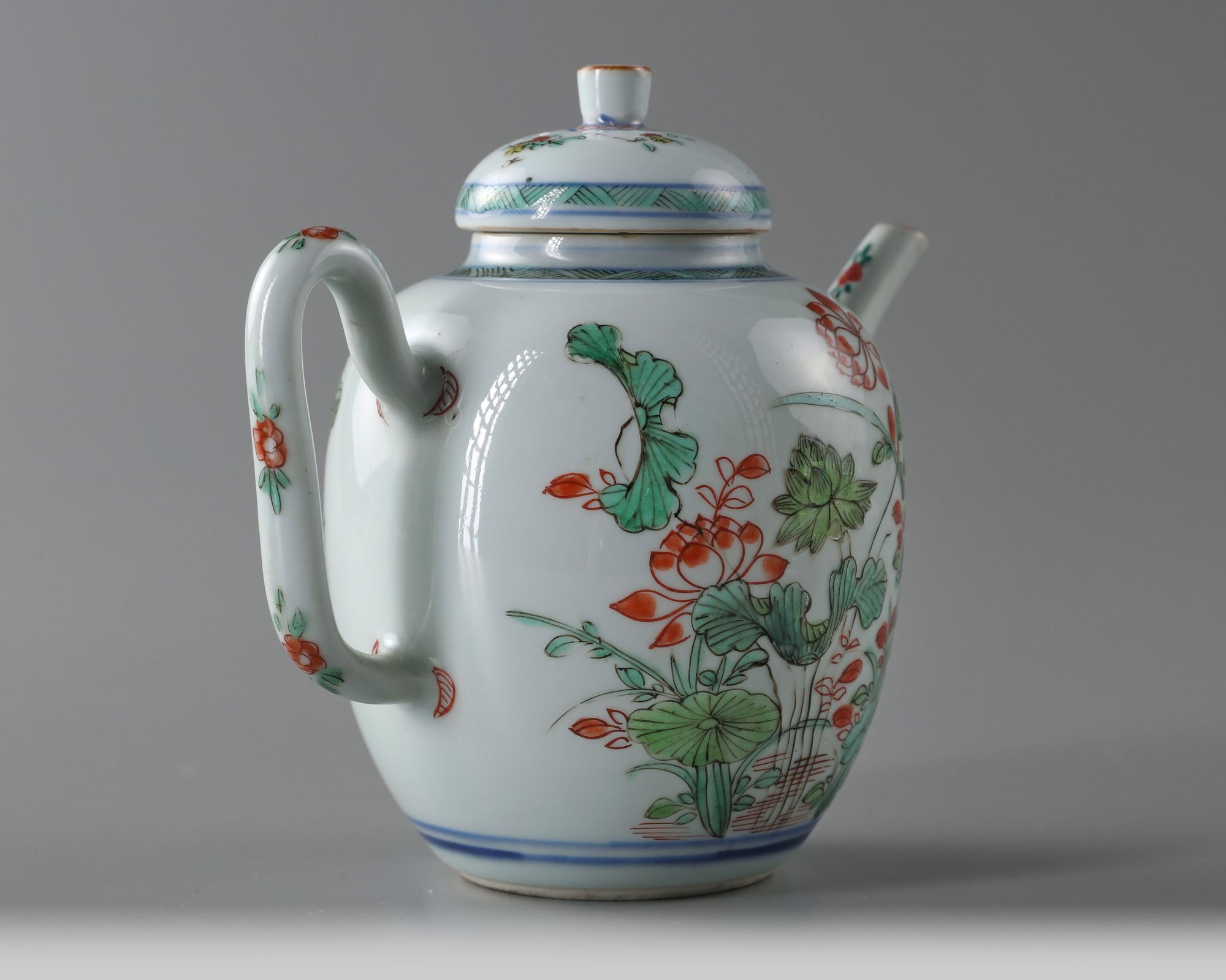 The teapot is of ovoid form, it is decorated to both sides with large blooming leafy lotus plants, all below a hatched band at the shoulder. The cover is decorated with flower sprays and is surmounted by a cylindrical finial.