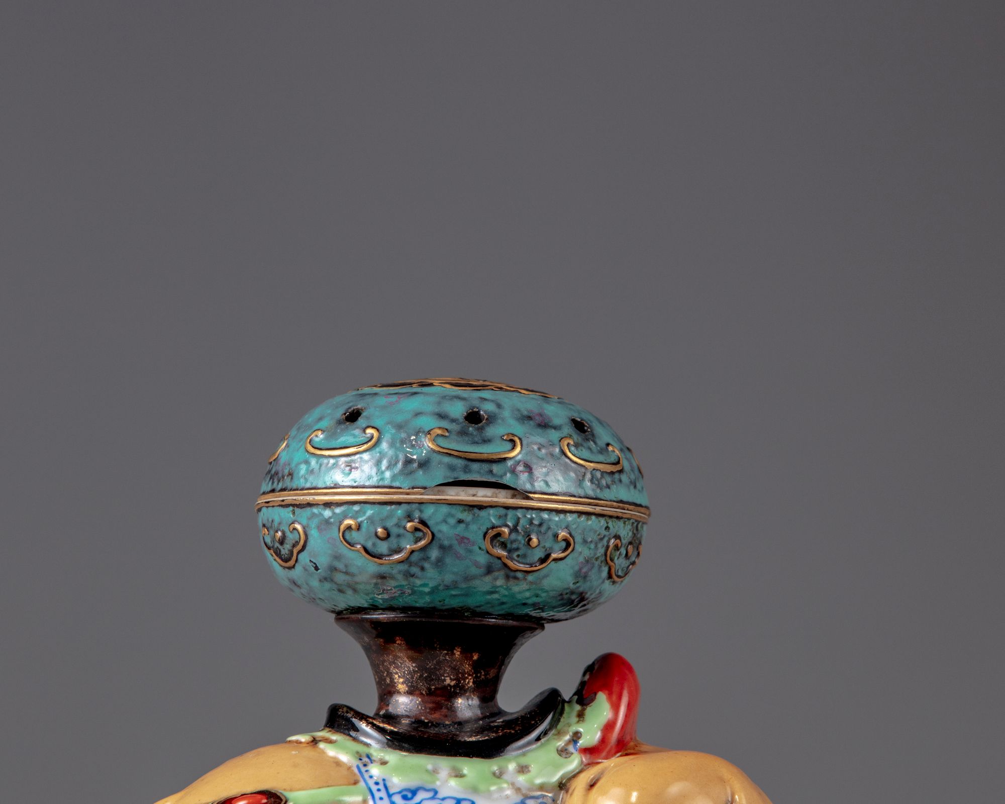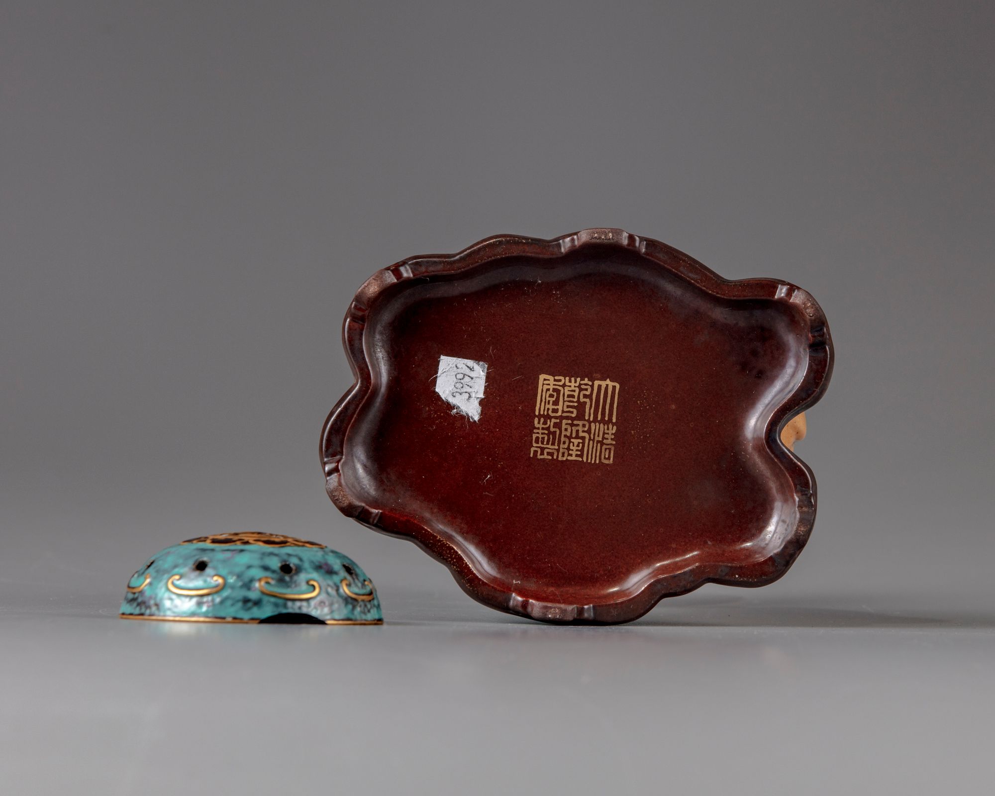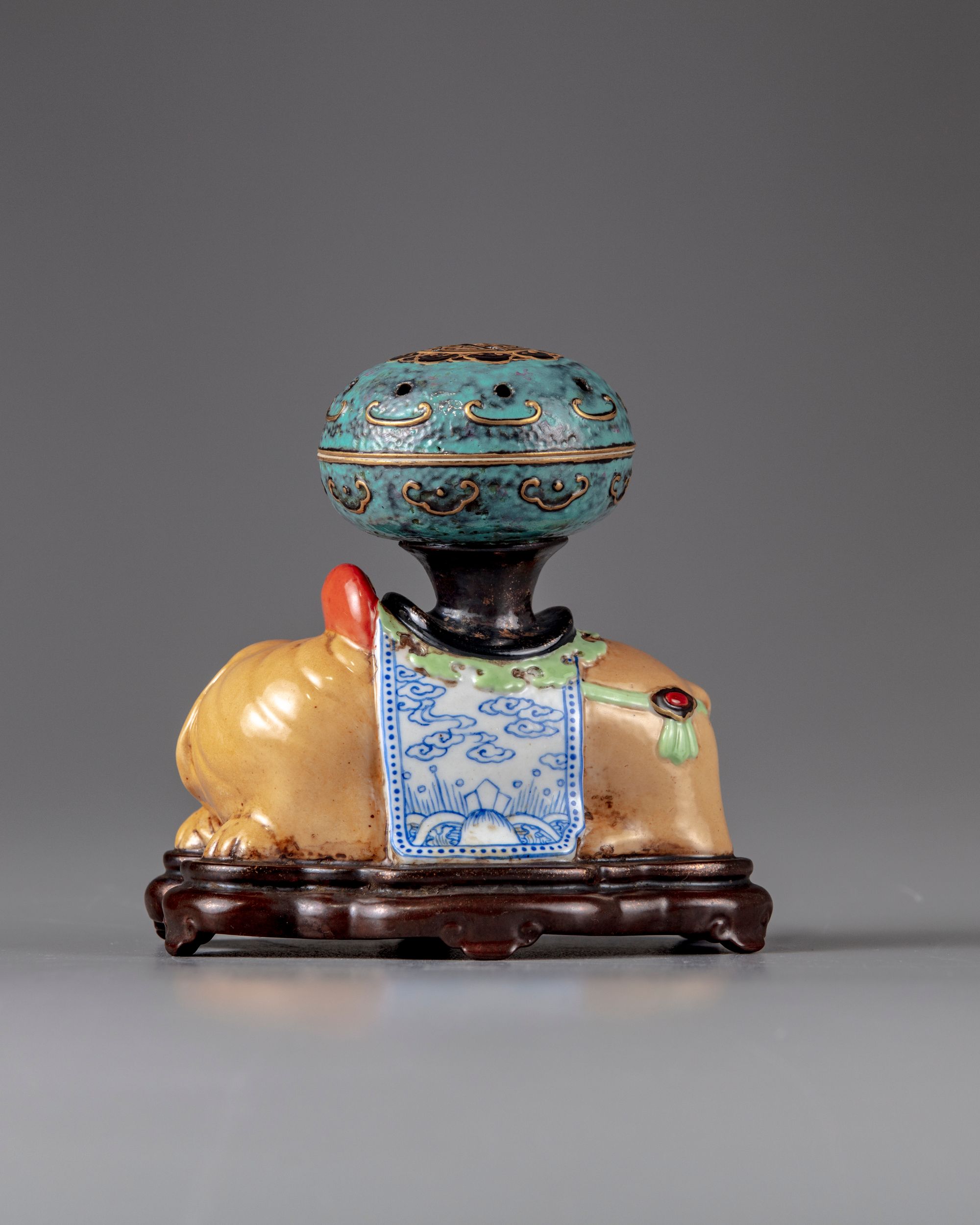 The incense burner consists of an elephant, stead with his heads turning backwards. On the saddle stand a small box fixed, with a pierced Shou character surrounded by ruyi heads on a robins egg ground.All set on a brown stand with a Qianlong seal mark to the bottom.