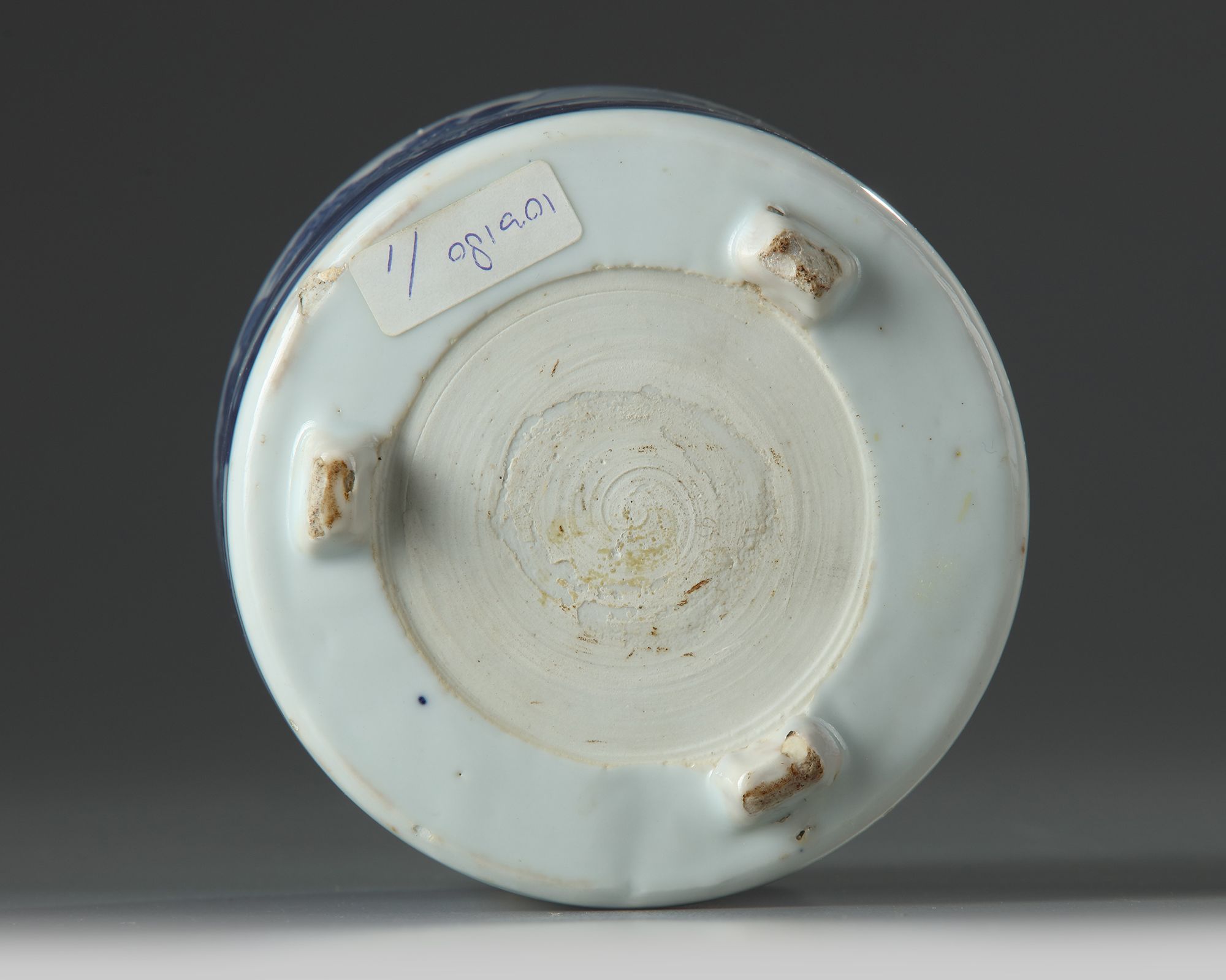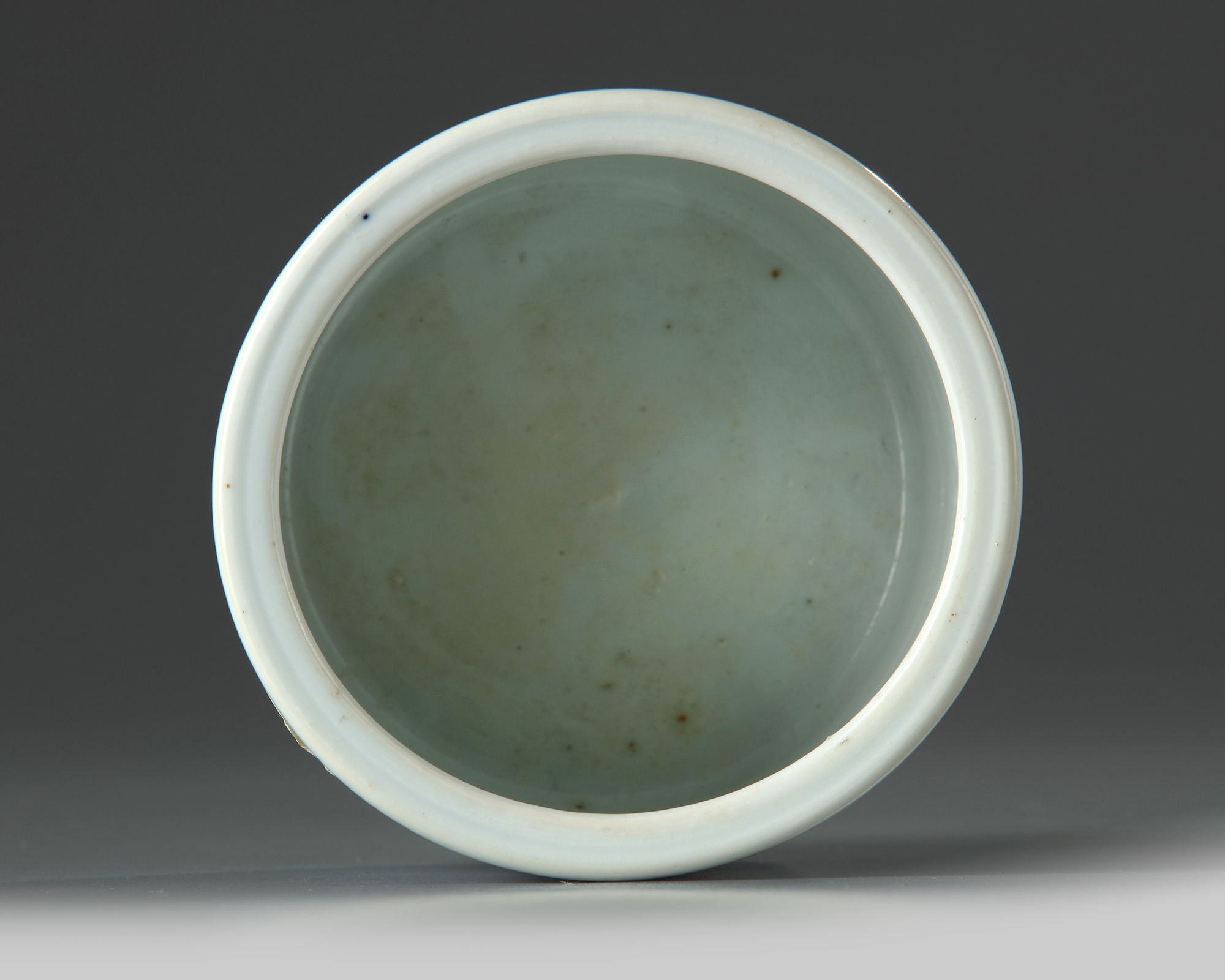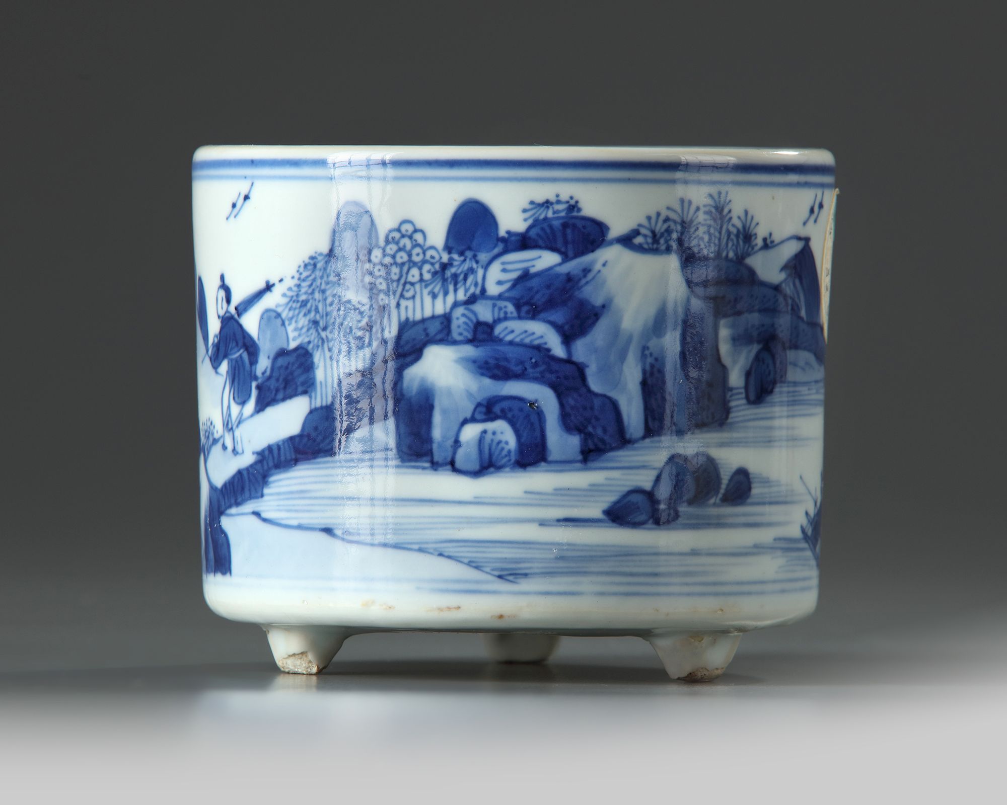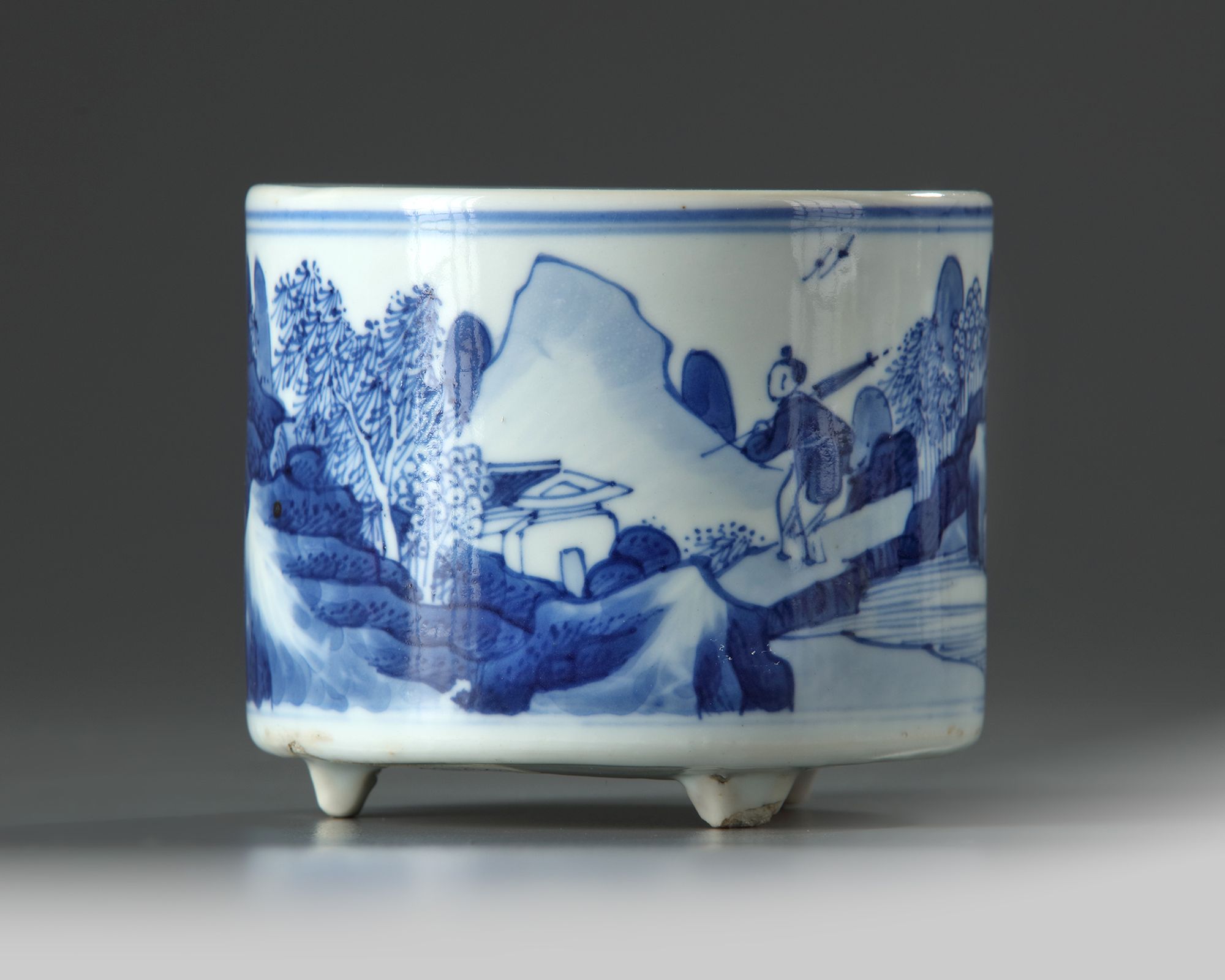 Standing on three low feet, the exterior is decorated with a continuous scene of two fishermen, one on the bank and the other in a boat, and a further walking figure, all in a mountainous river landscape.