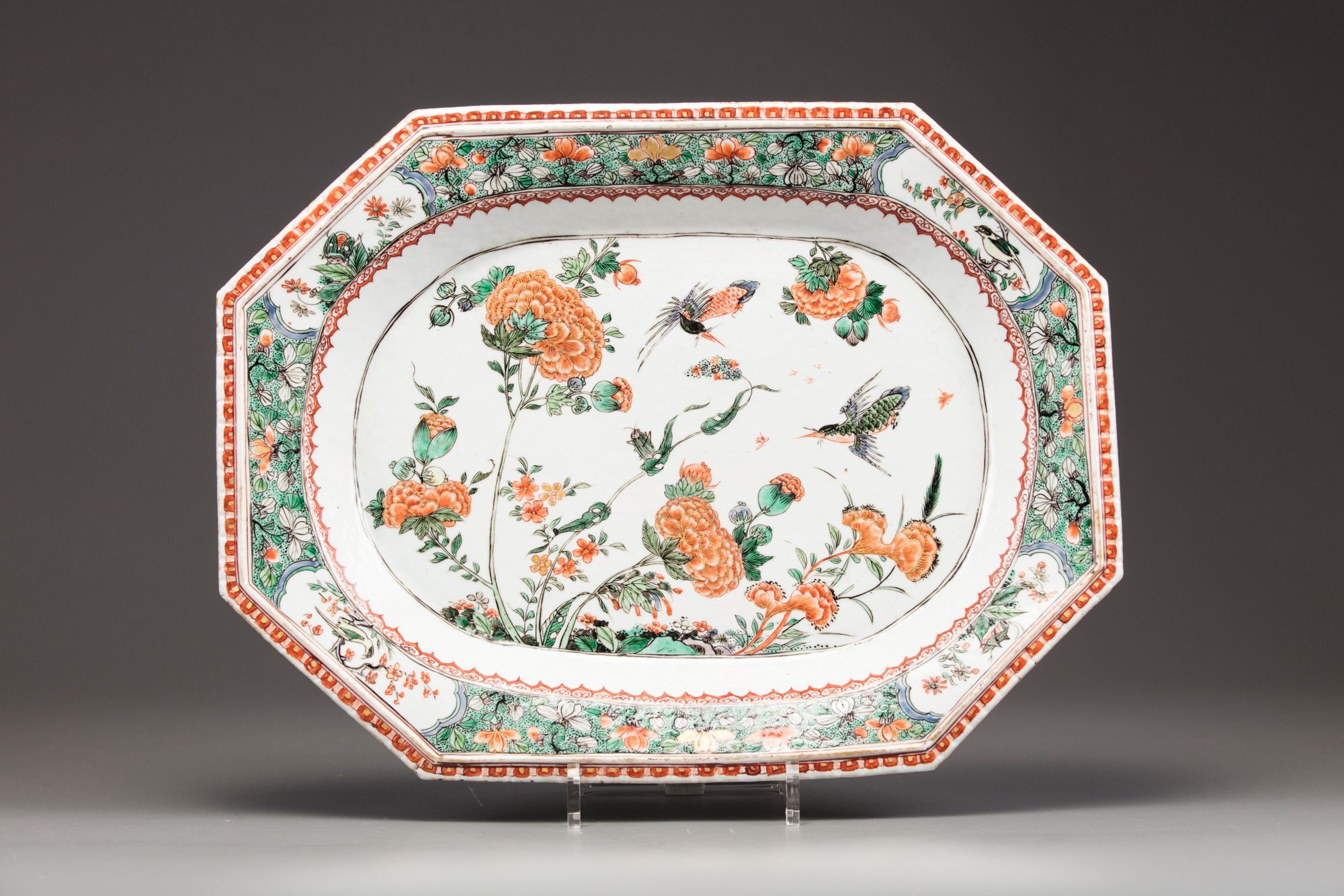 The platter is decorated and gilt to the centre with two birds in flight amongst blossoming peonies and cockscomb and a cricket perched upon a leafy branch. The rim is decorated with cartouches enclosing birds and insects on a seeded floral ground. The moulded rim is decorated in iron red and gilt. The reverse is decorated with four iron-red and green-enamelled flower sprays.