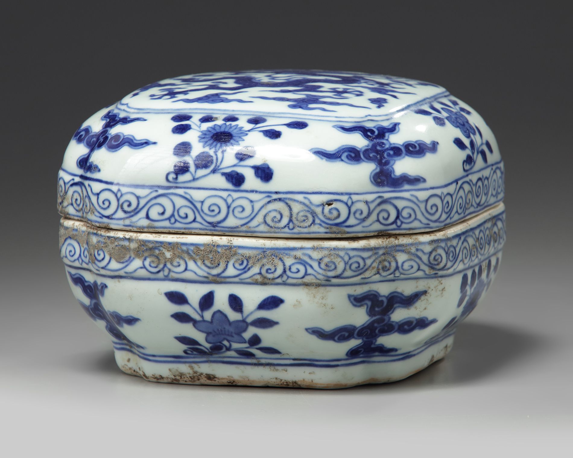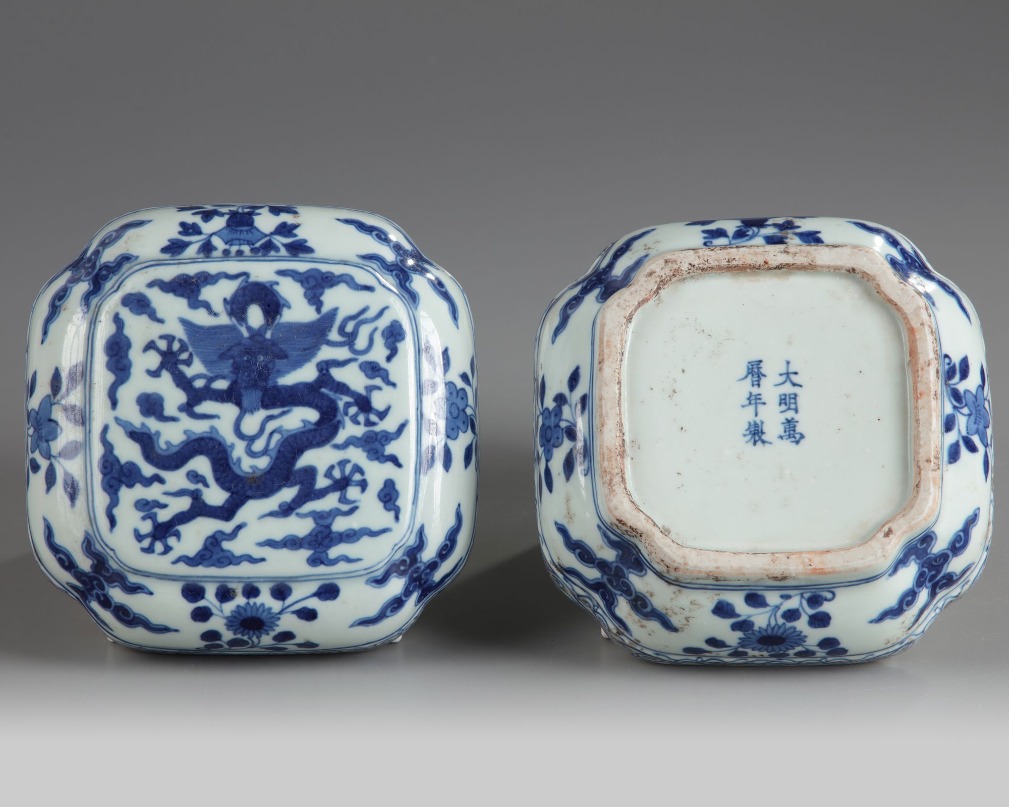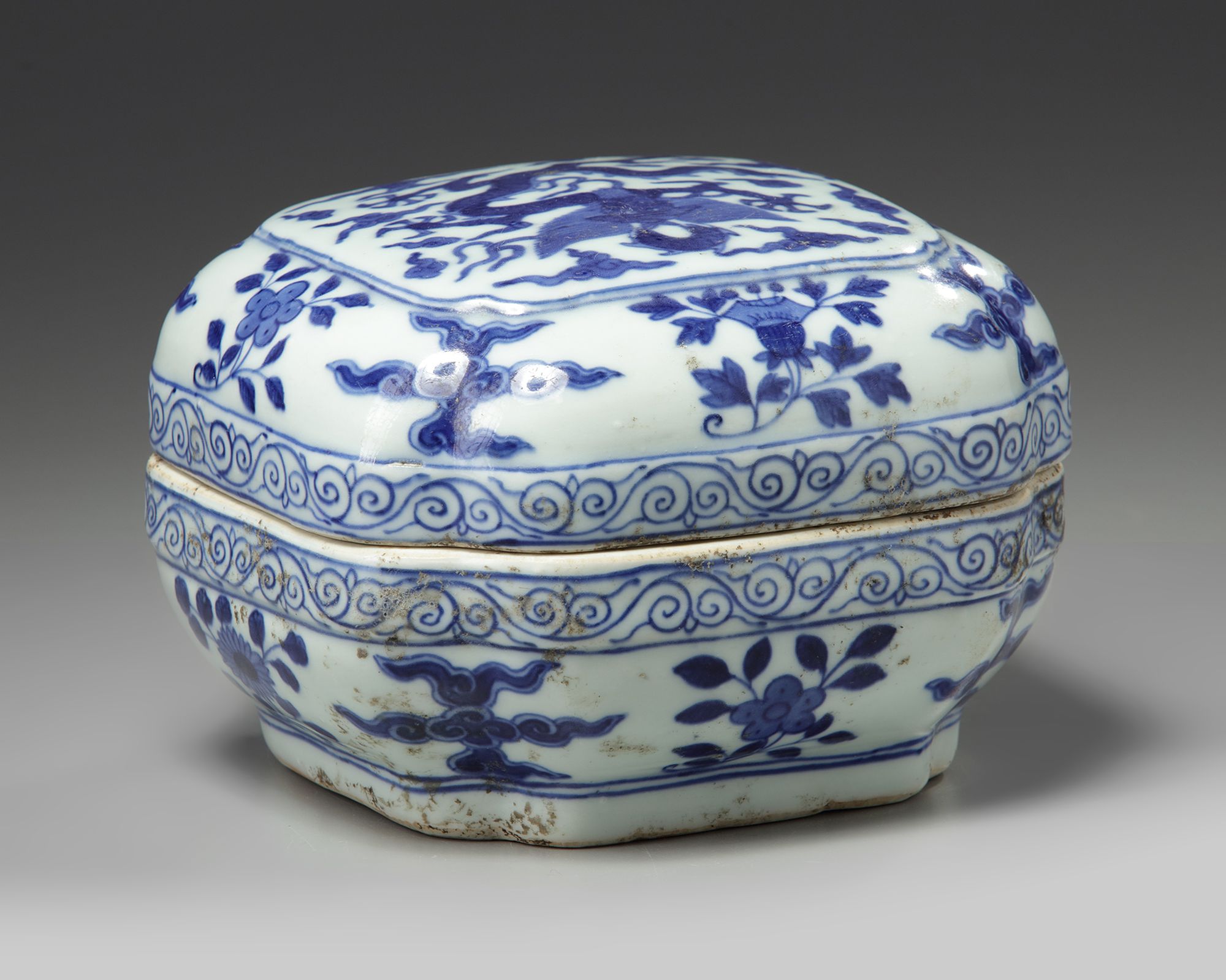 The box is decorated to the cover with a dragon amongst clouds, surrounded b a border of flower sprays and clouds. The rim is encircled with a classic scroll. The base with an apocryphal Wanli mark.